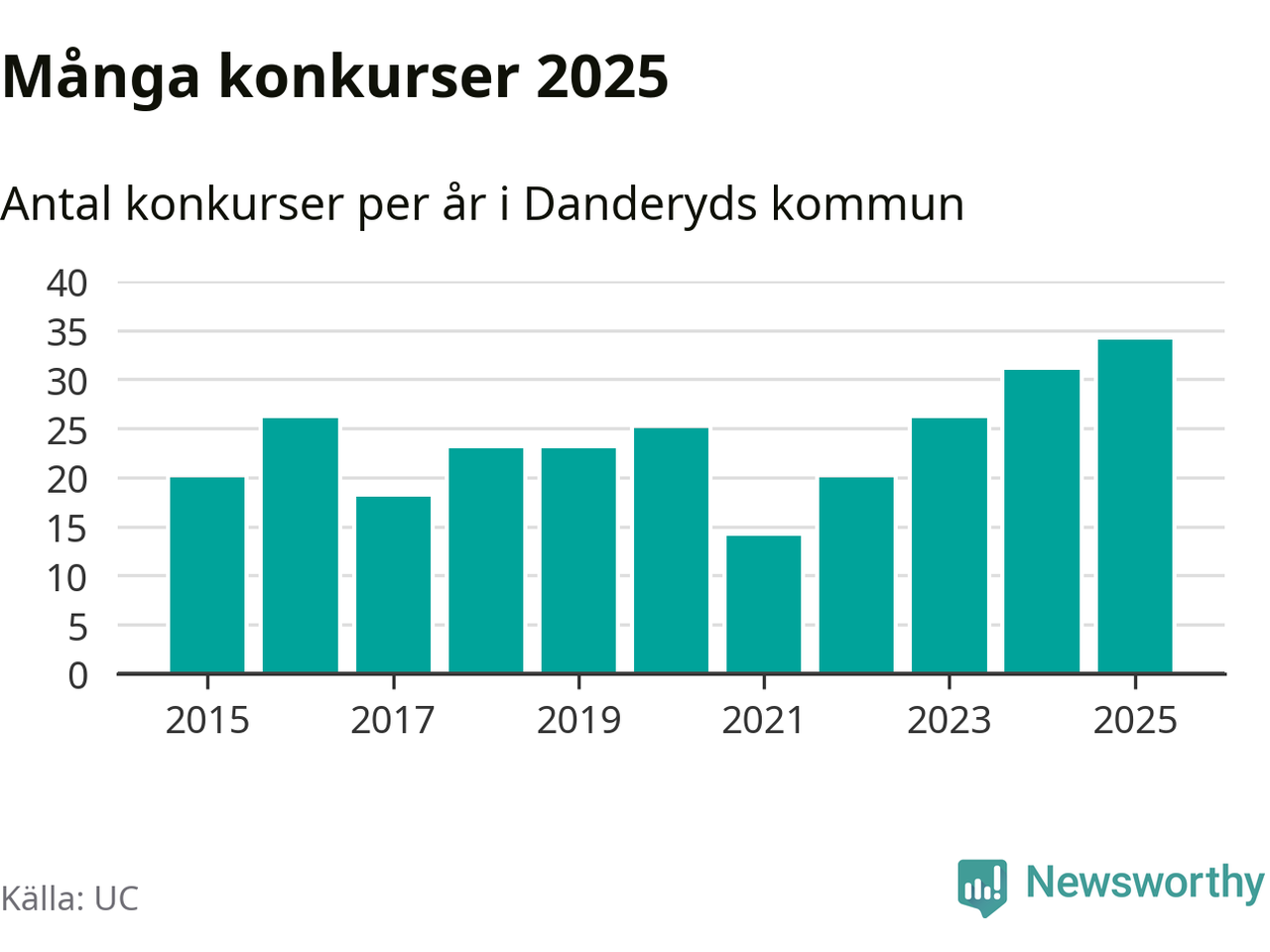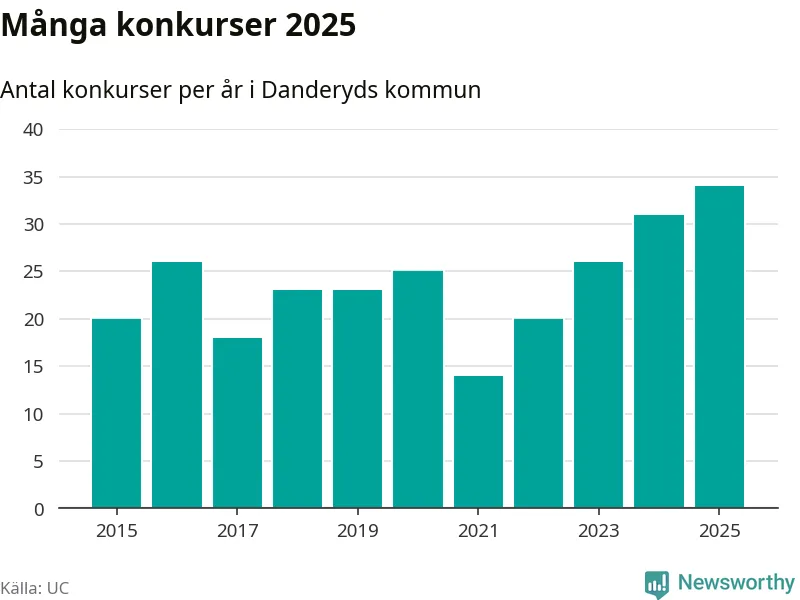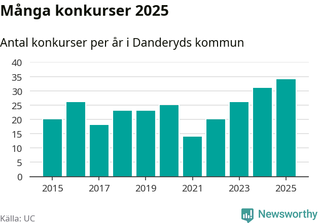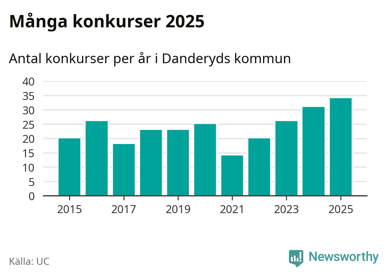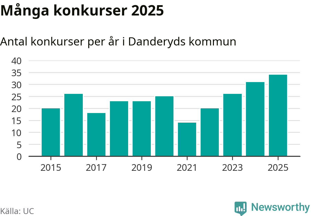 Under år 2025 gick sammanlagt 34 bolag med säte i Danderyds kommun i konkurs. Det är det högsta antalet sedan åtminstone år 2015. Det visar ny statistik från UC.