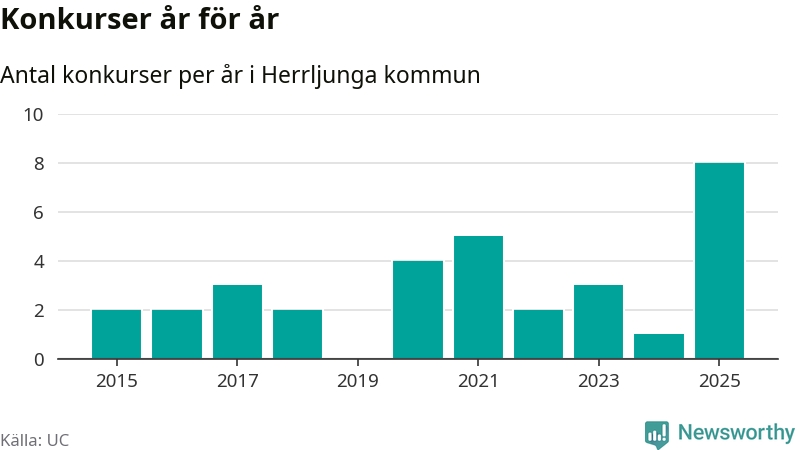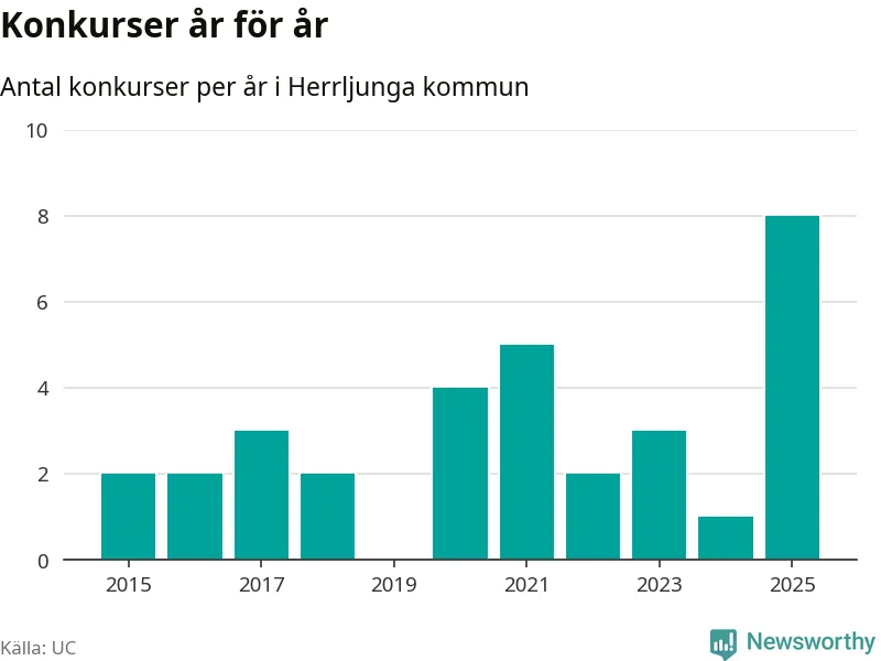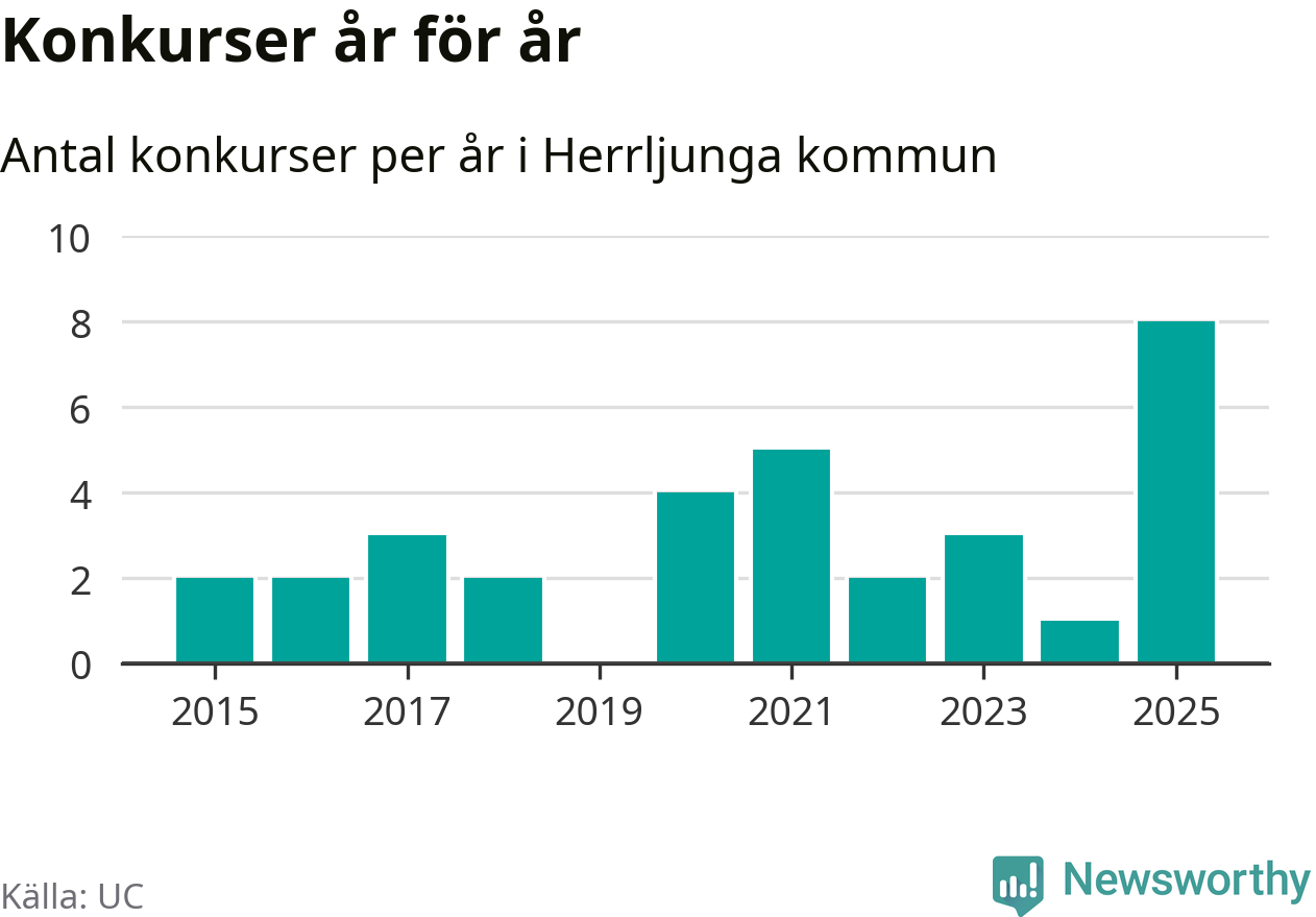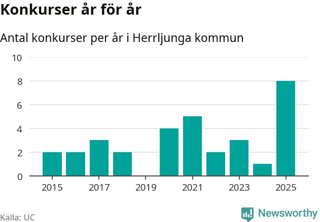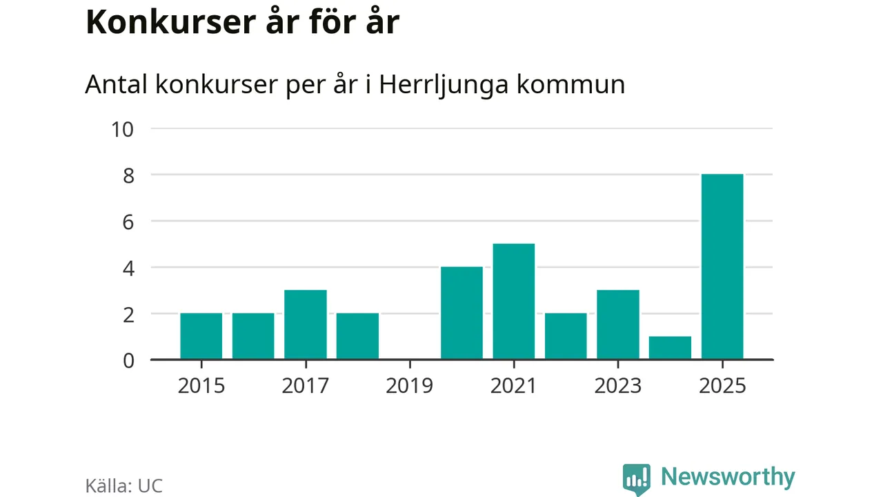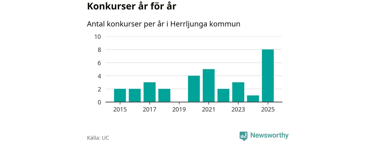 Under år 2025 gick sammanlagt åtta bolag med säte i Herrljunga kommun i konkurs. Det är det högsta antalet sedan åtminstone år 2015. Det visar ny statistik från UC.