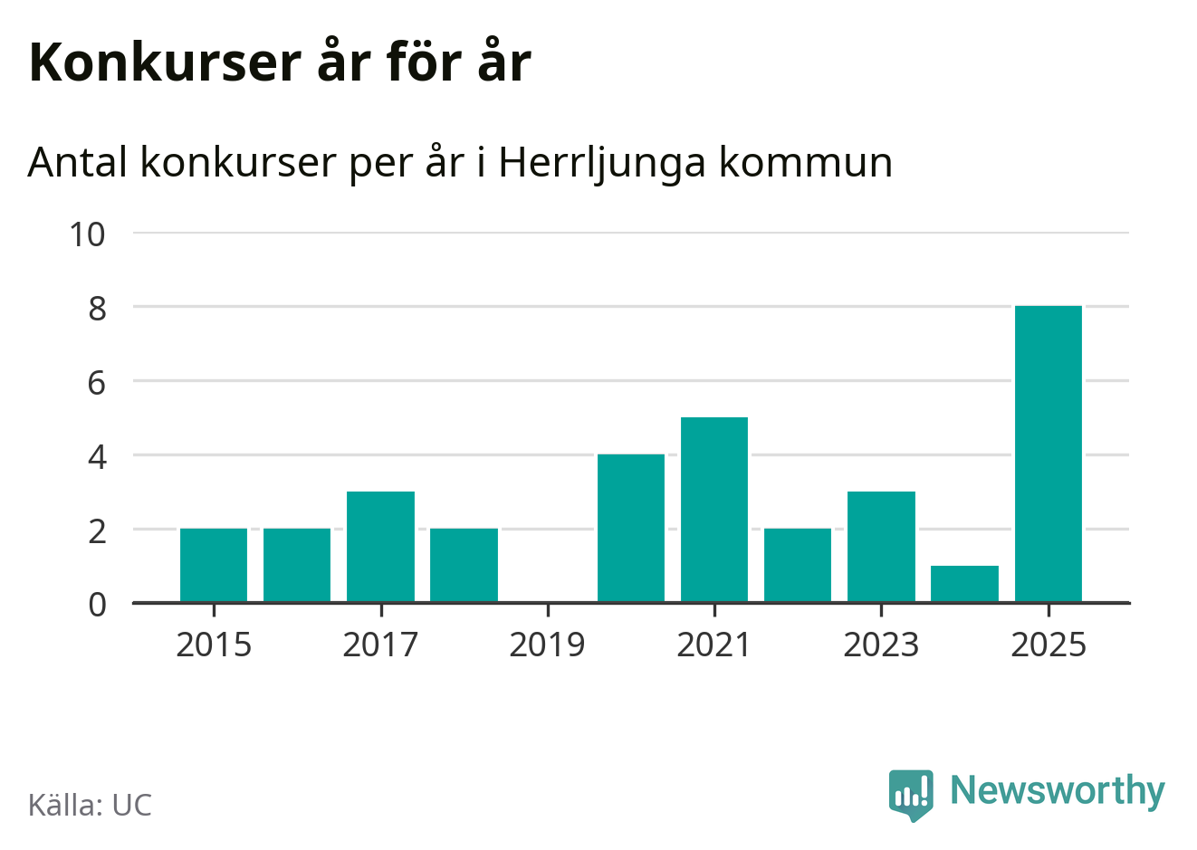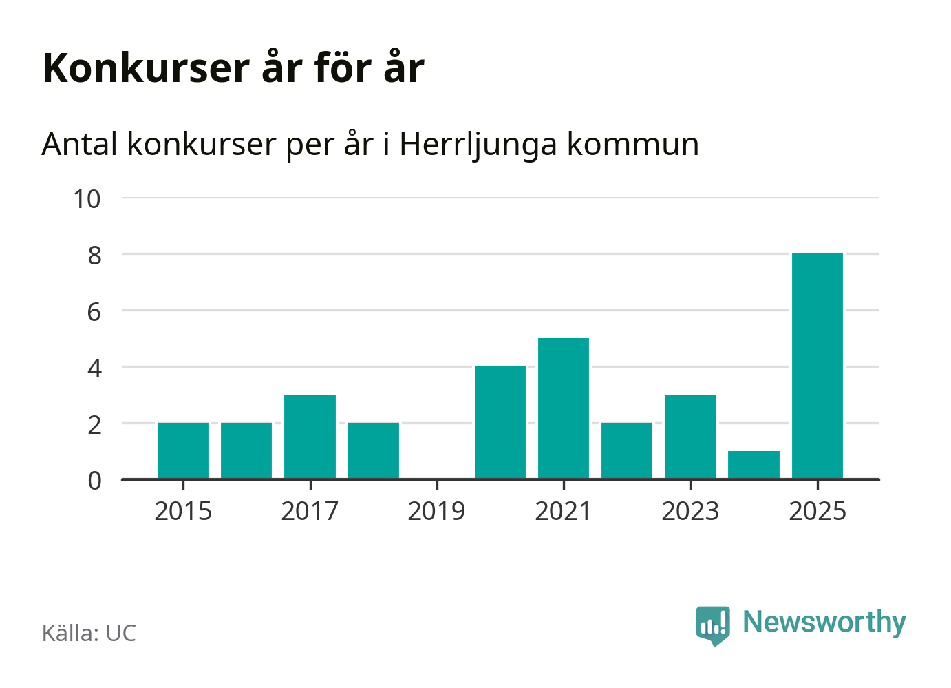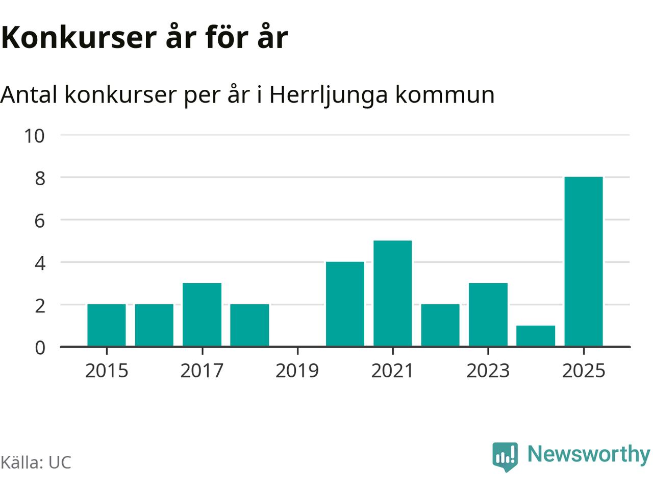 Under år 2025 gick sammanlagt åtta bolag med säte i Herrljunga kommun i konkurs. Det är det högsta antalet sedan åtminstone år 2015. Det visar ny statistik från UC.