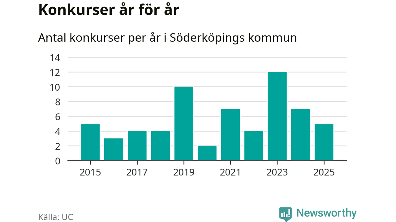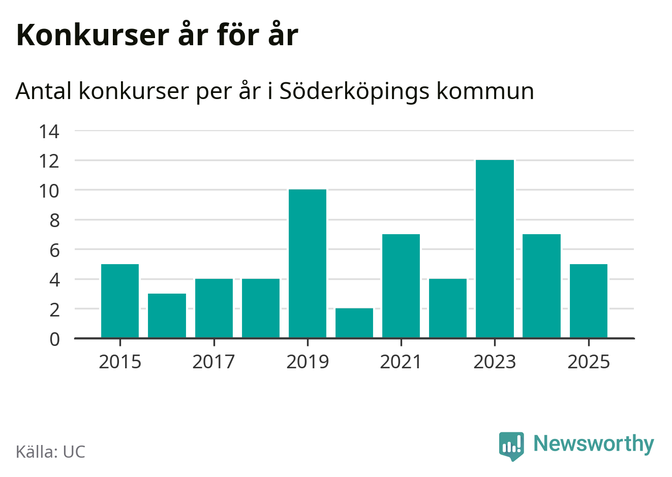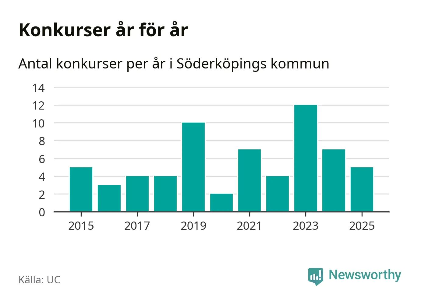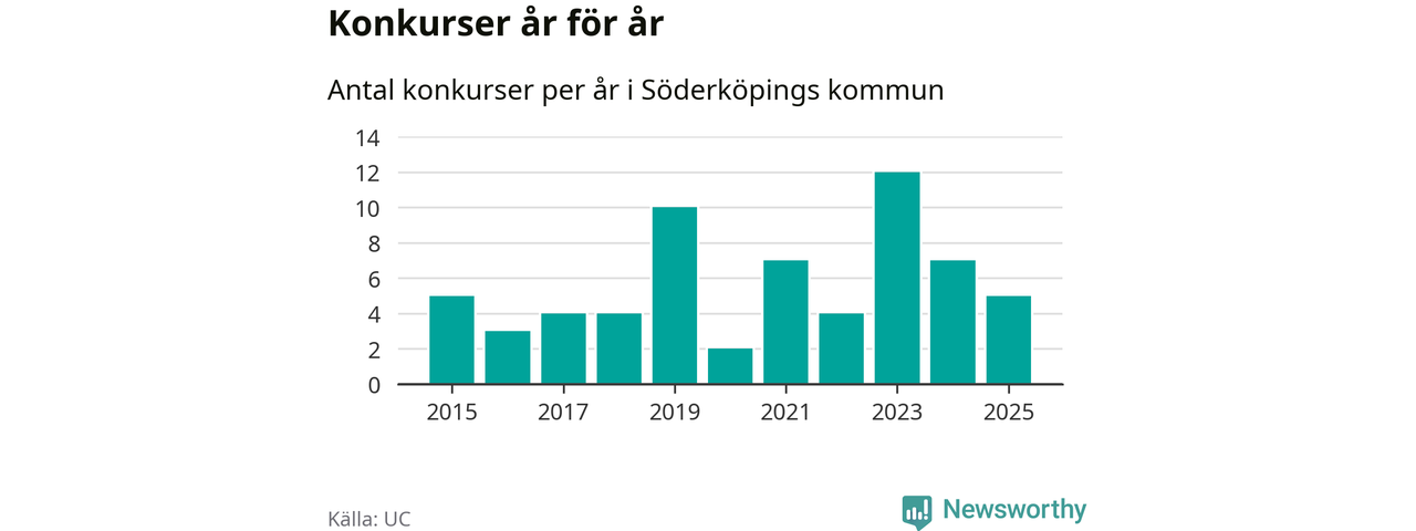 Under år 2025 gick sammanlagt fem bolag med säte i Söderköpings kommun i konkurs. Det är två färre än året innan och andra året i följd som konkurserna minskar. Toppåret, sedan 2015, var 2023 då tolv bolag gick i konkurs. Det visar ny statistik från UC.