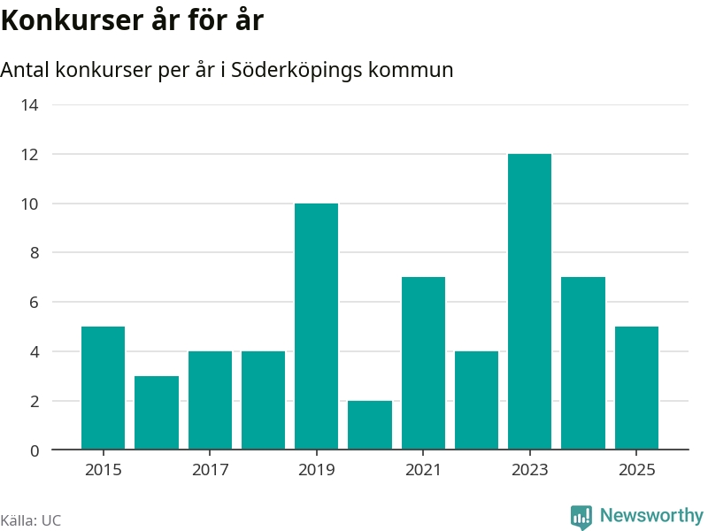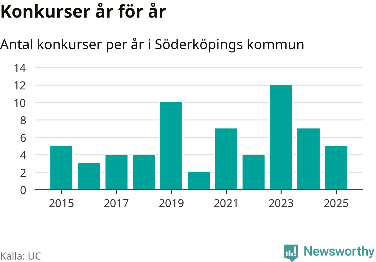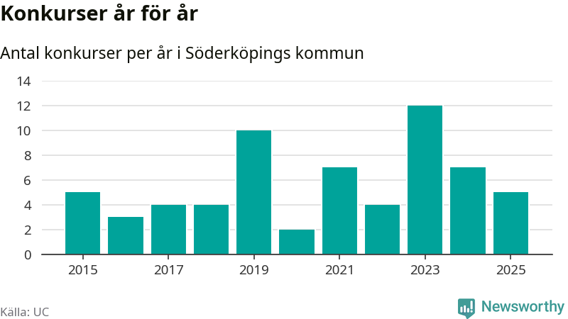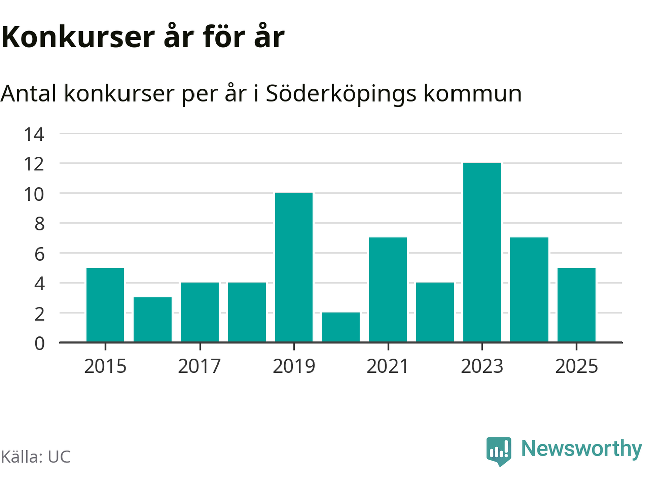 Under år 2025 gick sammanlagt fem bolag med säte i Söderköpings kommun i konkurs. Det är två färre än året innan och andra året i följd som konkurserna minskar. Toppåret, sedan 2015, var 2023 då tolv bolag gick i konkurs. Det visar ny statistik från UC.