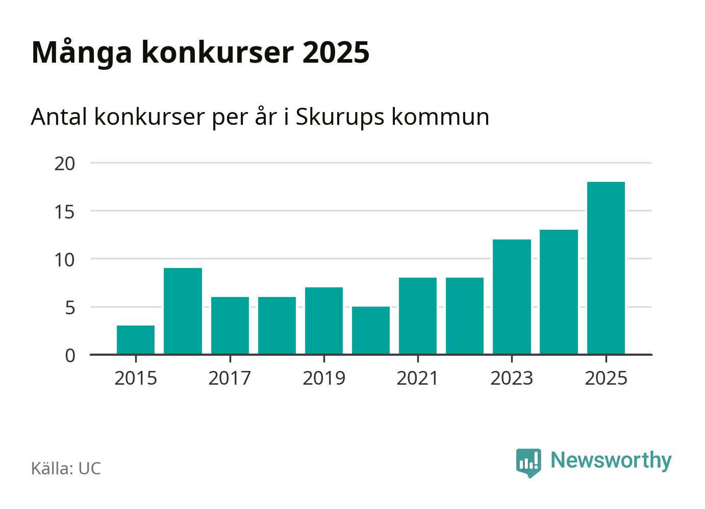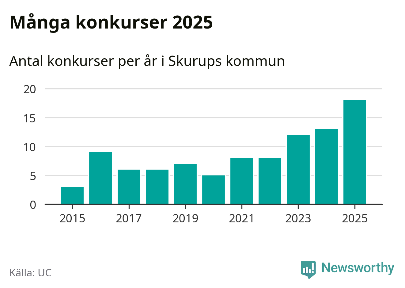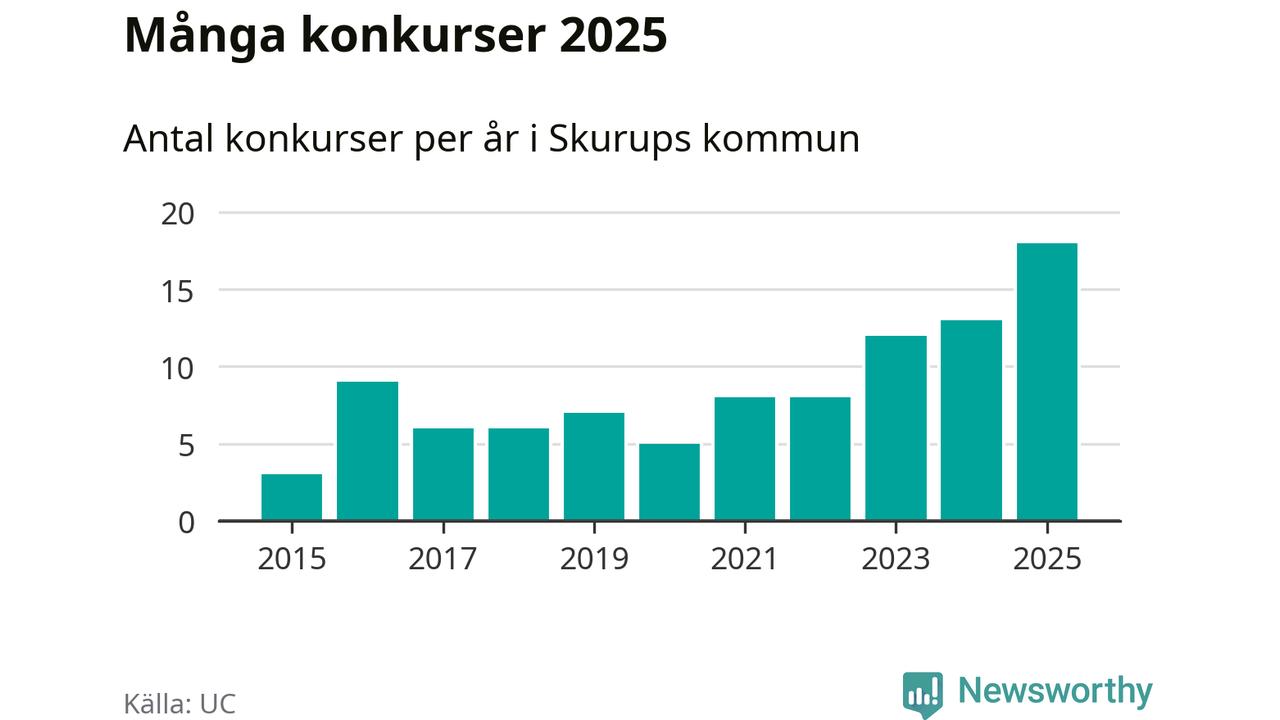 Under år 2025 gick sammanlagt 18 bolag med säte i Skurups kommun i konkurs. Det är det högsta antalet sedan åtminstone år 2015. Det visar ny statistik från UC.