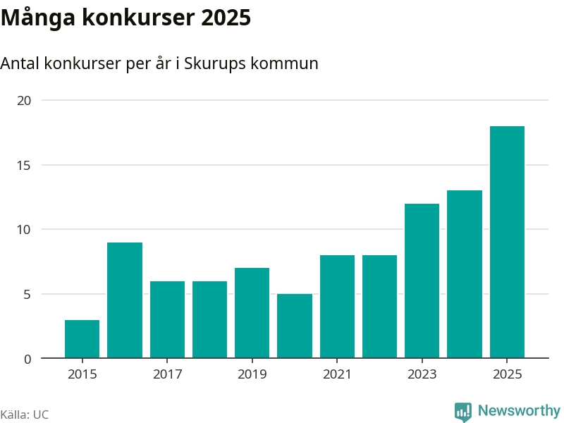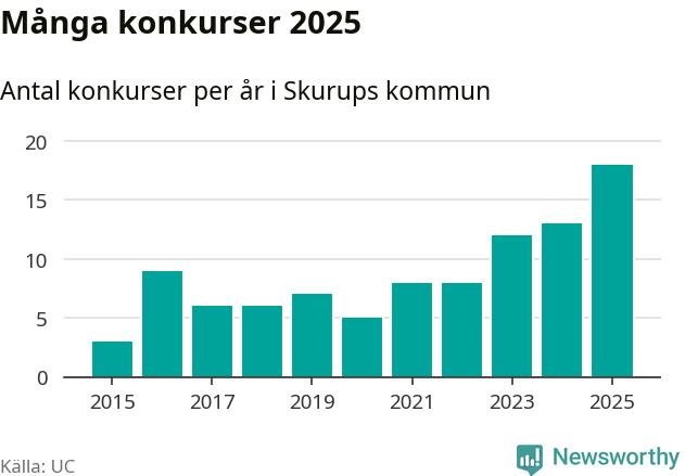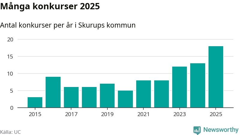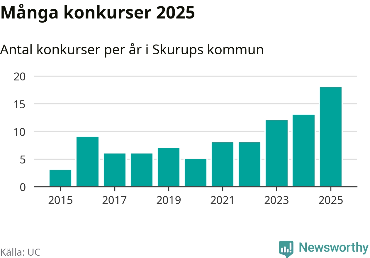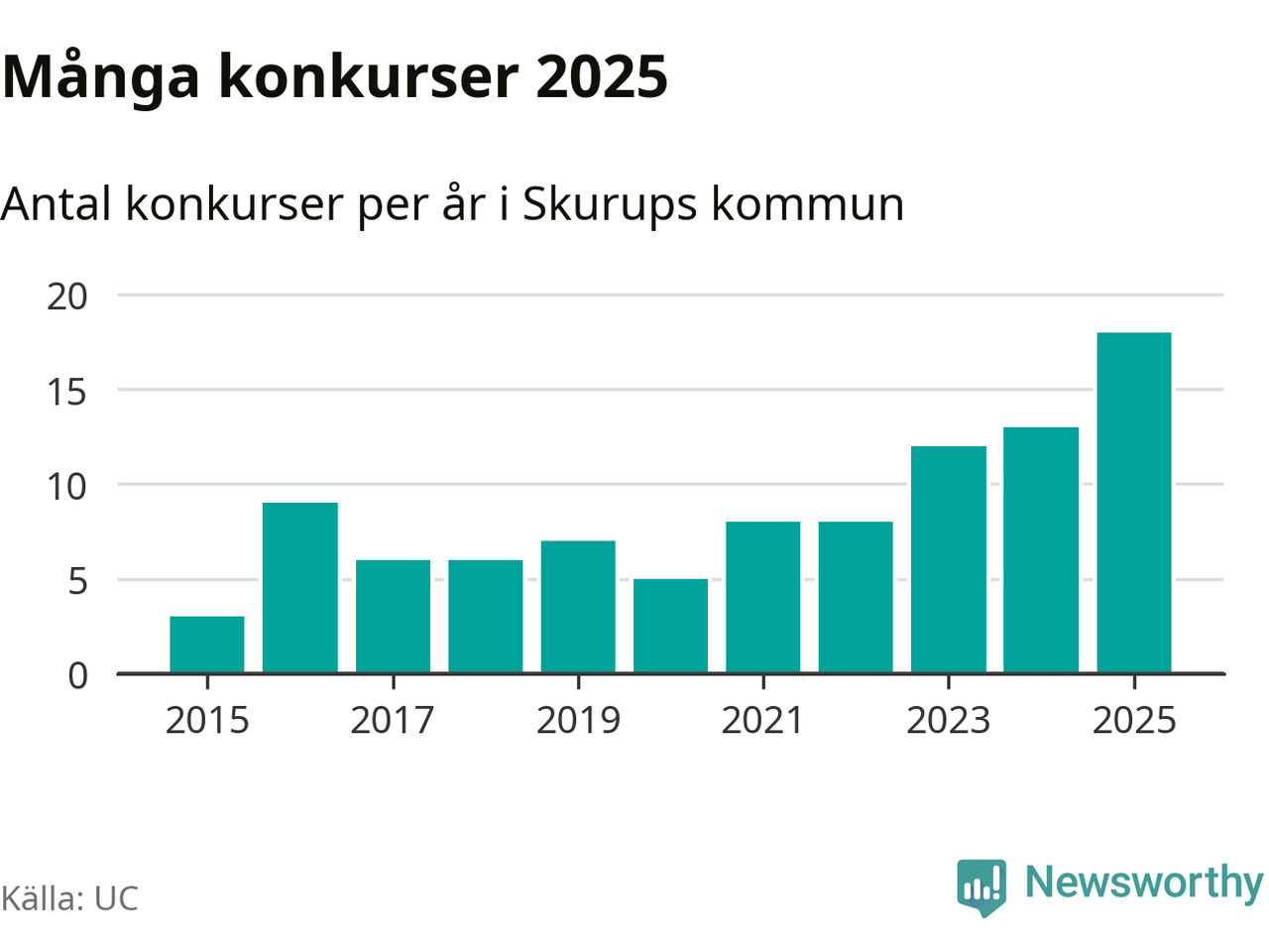 Under år 2025 gick sammanlagt 18 bolag med säte i Skurups kommun i konkurs. Det är det högsta antalet sedan åtminstone år 2015. Det visar ny statistik från UC.