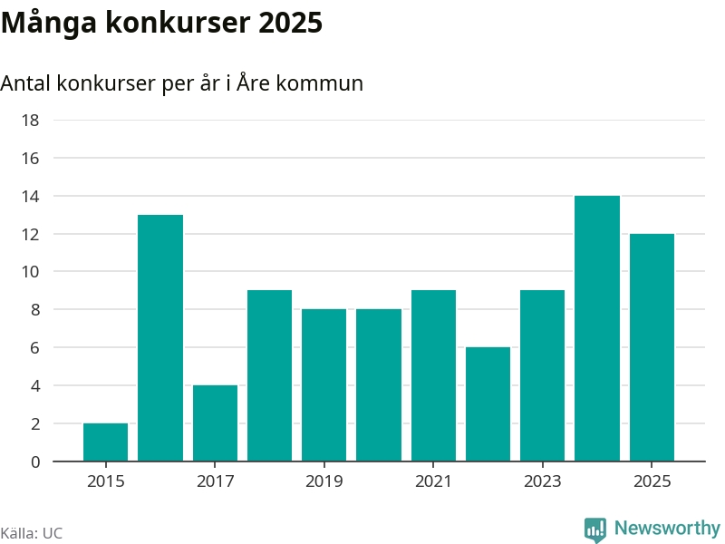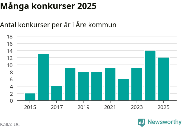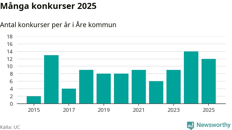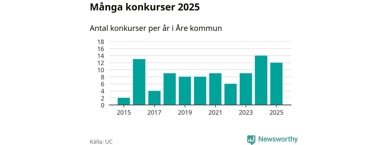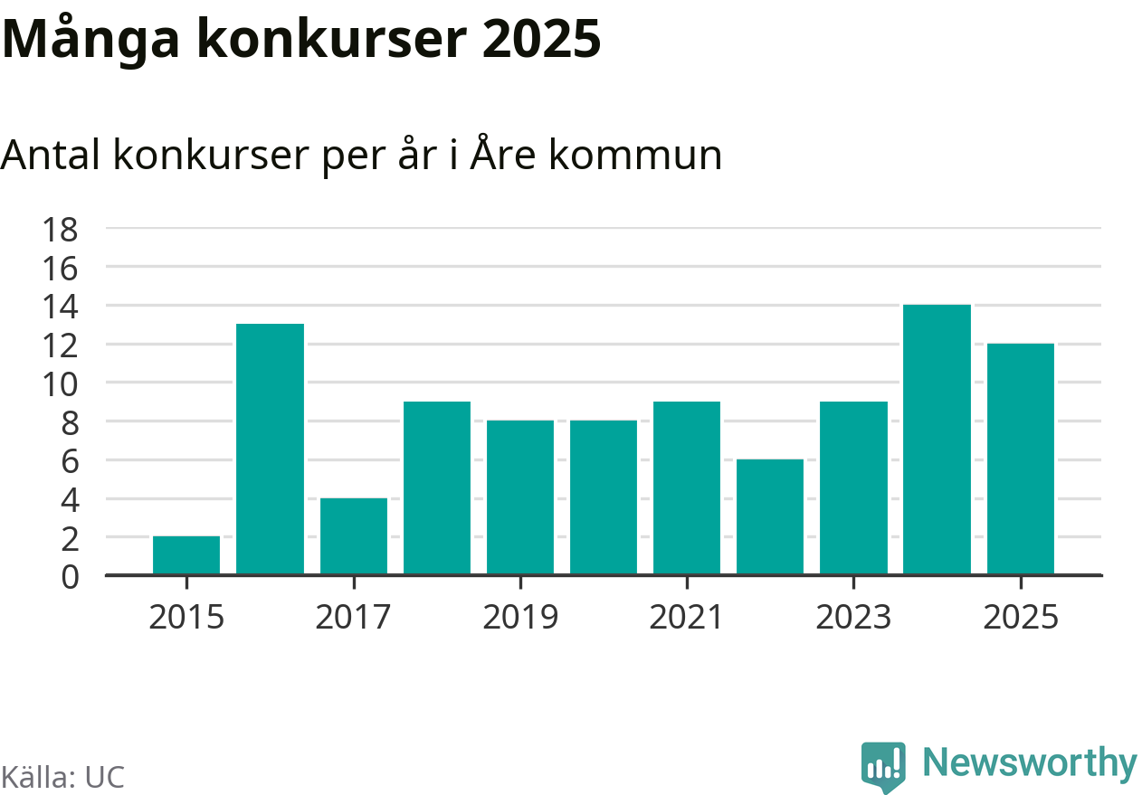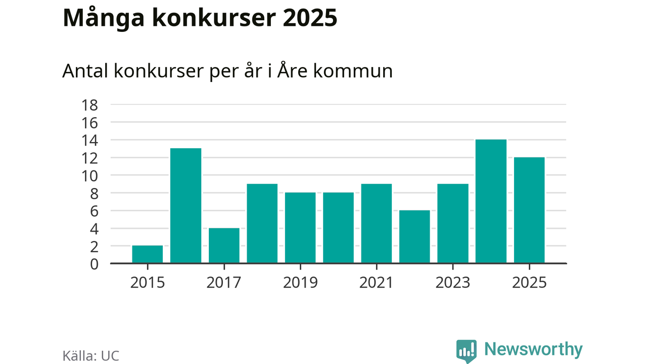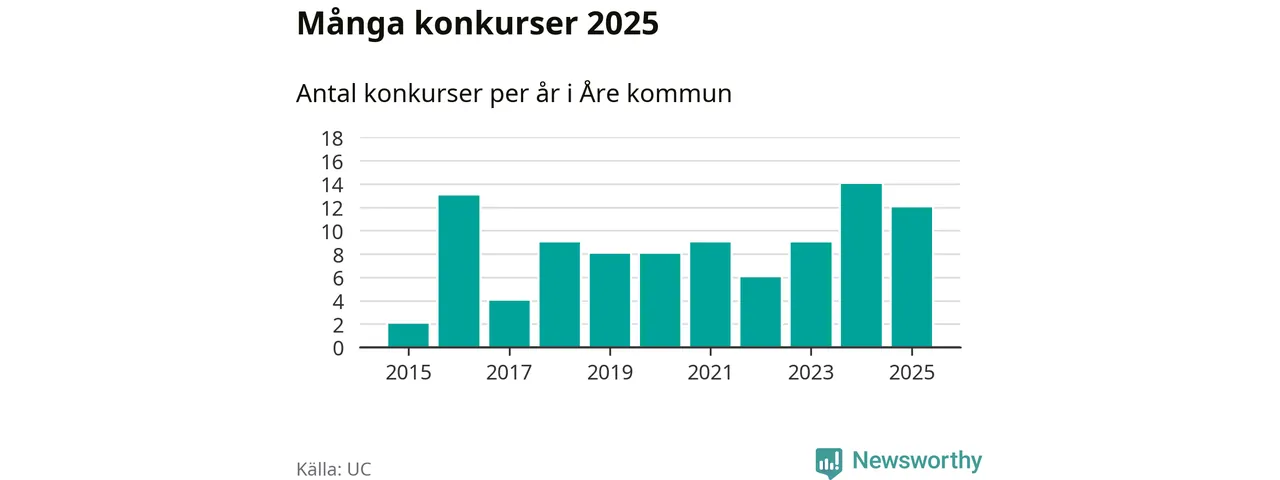Under år 2025 gick sammanlagt tolv bolag med säte i Åre kommun i konkurs. Det är två färre än året innan. Toppåret, sedan 2015, var just 2024 sett till antalet konkursföretag. Det visar ny statistik från UC.