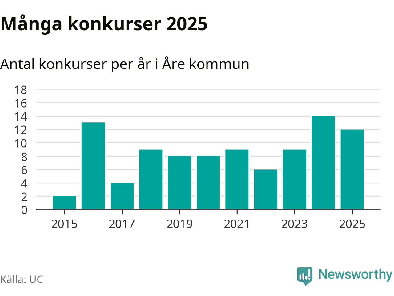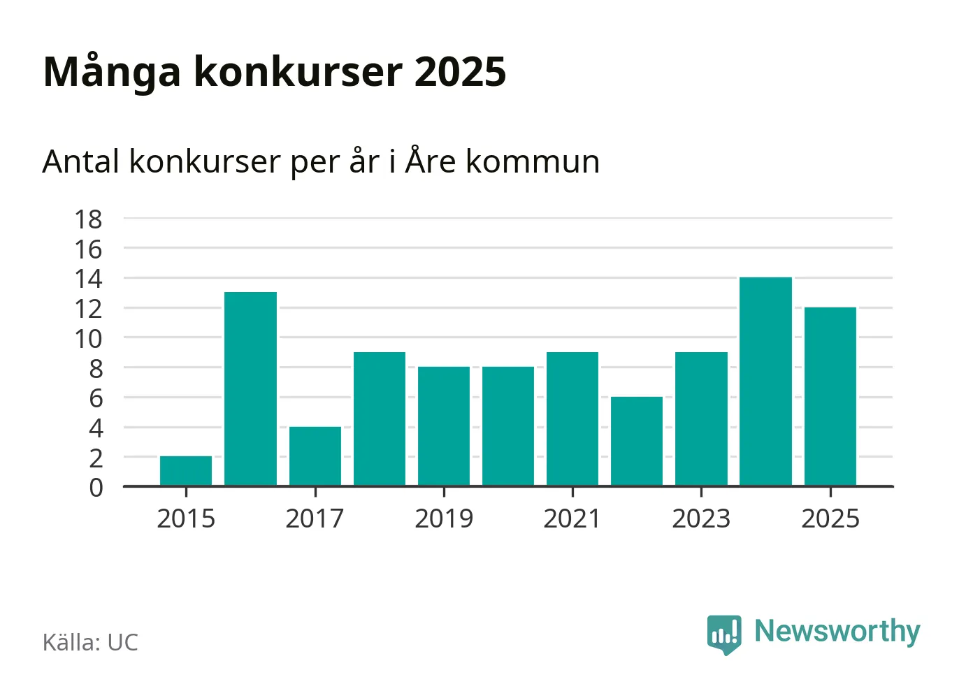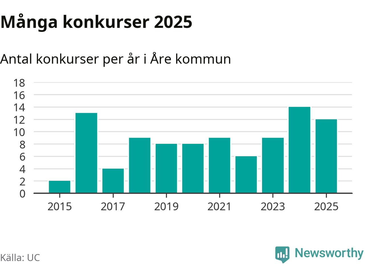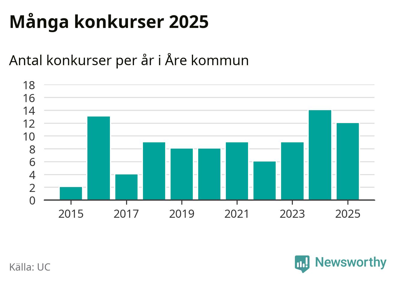 Under år 2025 gick sammanlagt tolv bolag med säte i Åre kommun i konkurs. Det är två färre än året innan. Toppåret, sedan 2015, var just 2024 sett till antalet konkursföretag. Det visar ny statistik från UC.