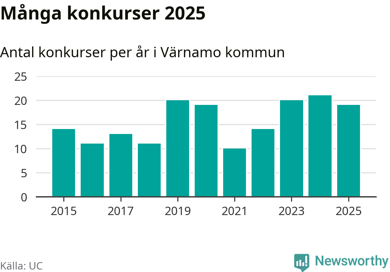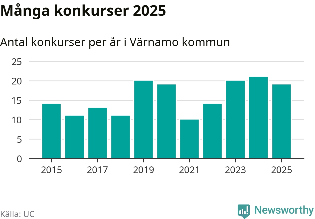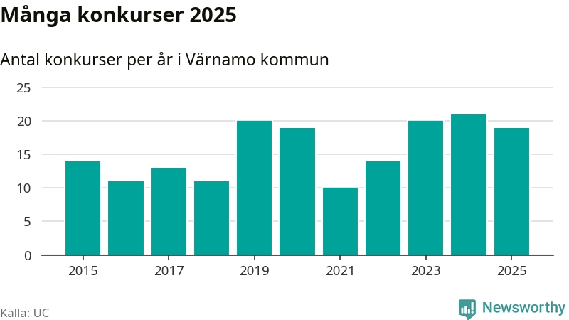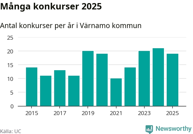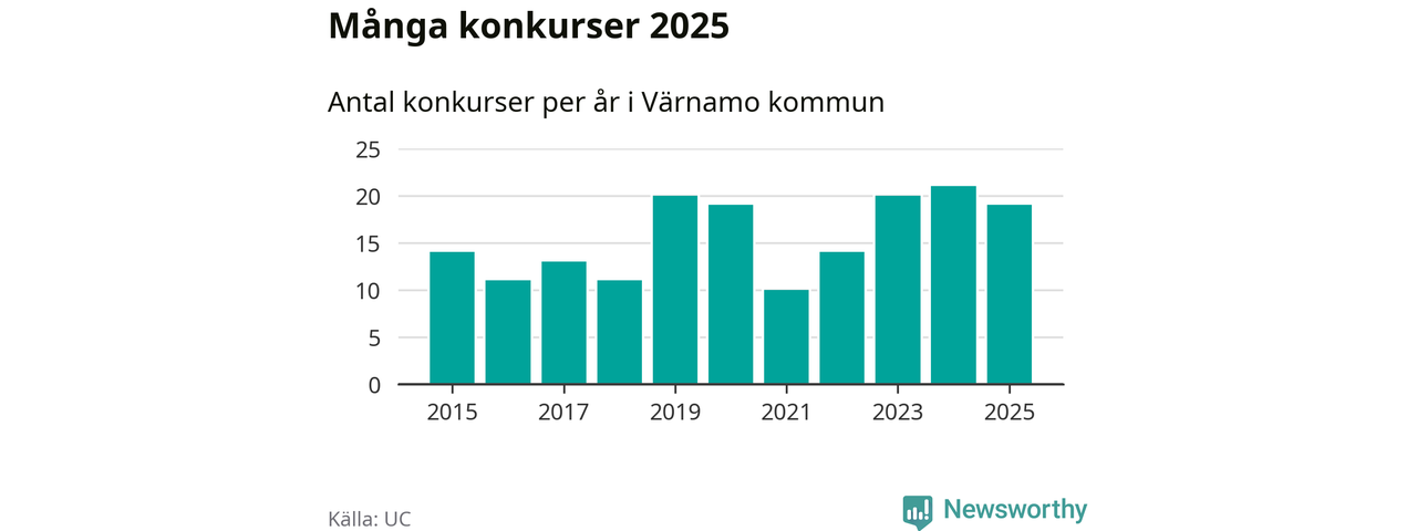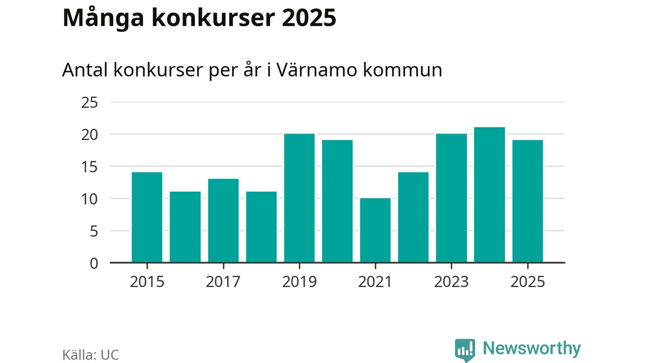 Under år 2025 gick sammanlagt 19 bolag med säte i Värnamo kommun i konkurs. Det är två färre än året innan. Toppåret, sedan 2015, var just 2024 sett till antalet konkursföretag. Det visar ny statistik från UC.
