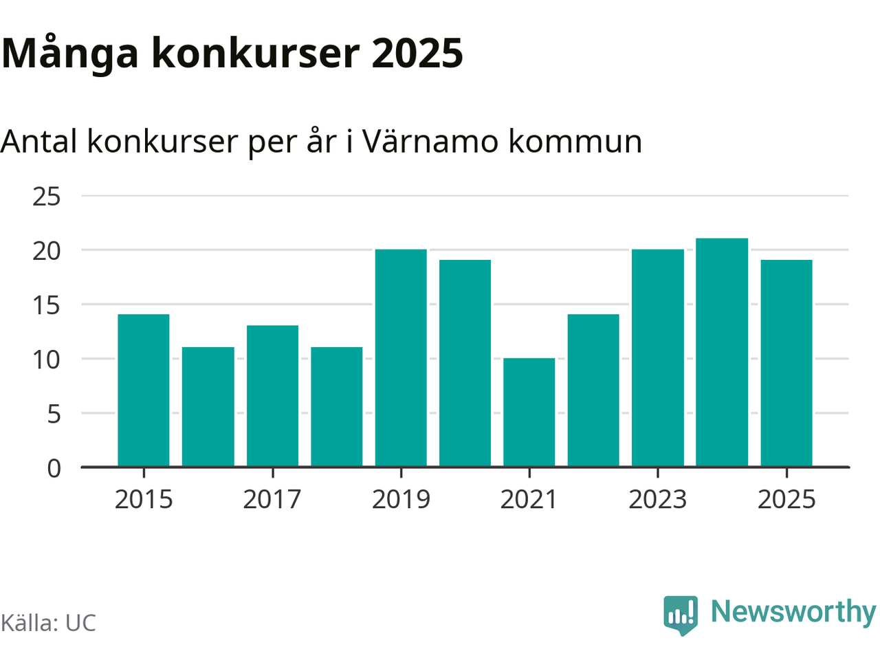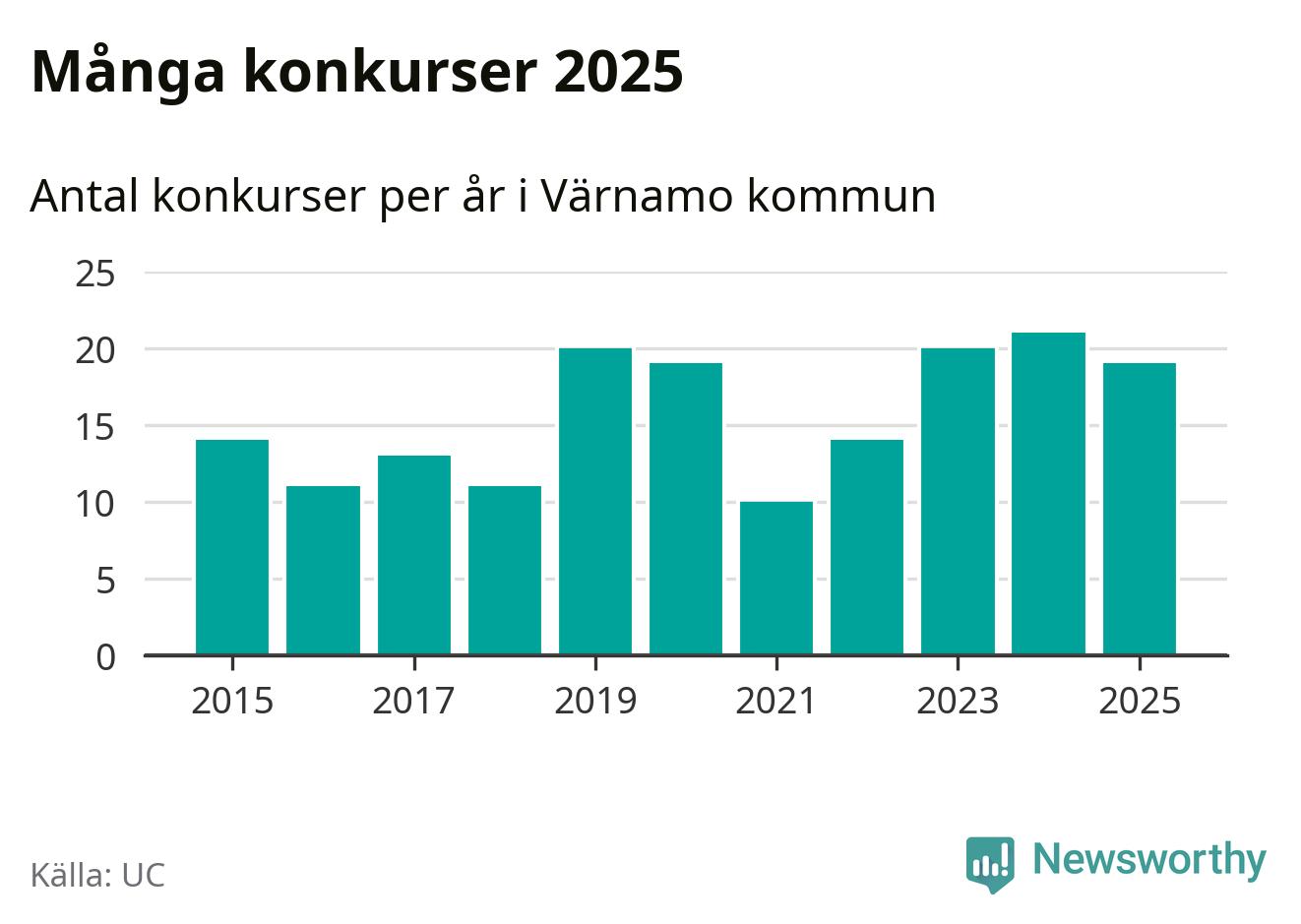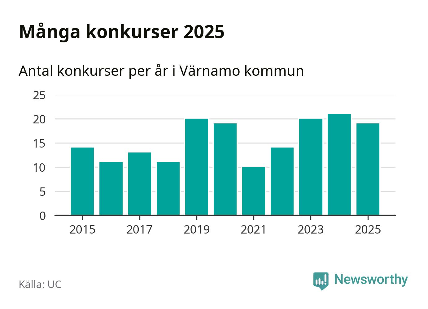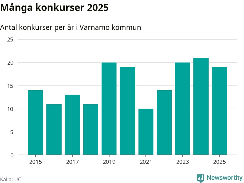 Under år 2025 gick sammanlagt 19 bolag med säte i Värnamo kommun i konkurs. Det är två färre än året innan. Toppåret, sedan 2015, var just 2024 sett till antalet konkursföretag. Det visar ny statistik från UC.
