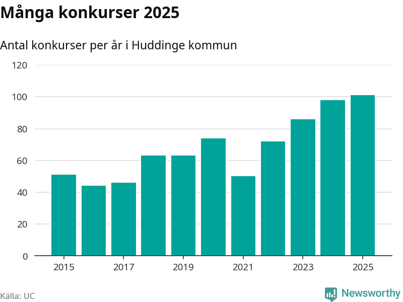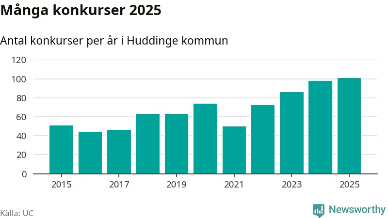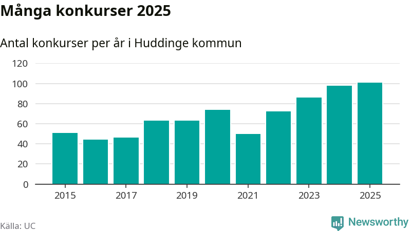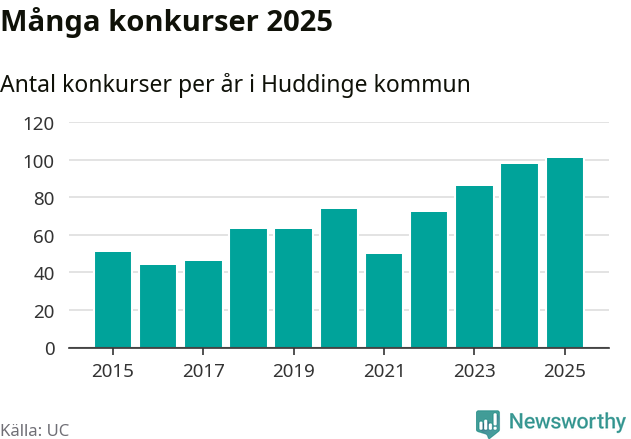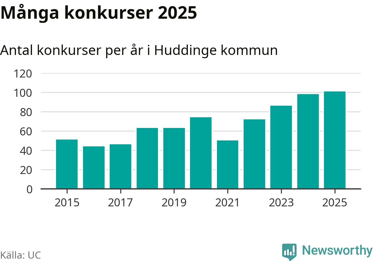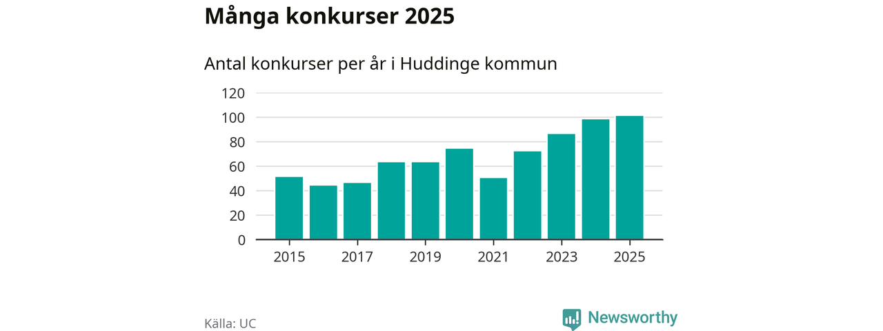 Under år 2025 gick sammanlagt 101 bolag med säte i Huddinge kommun i konkurs. Det är det högsta antalet sedan åtminstone år 2015. Det visar ny statistik från UC.