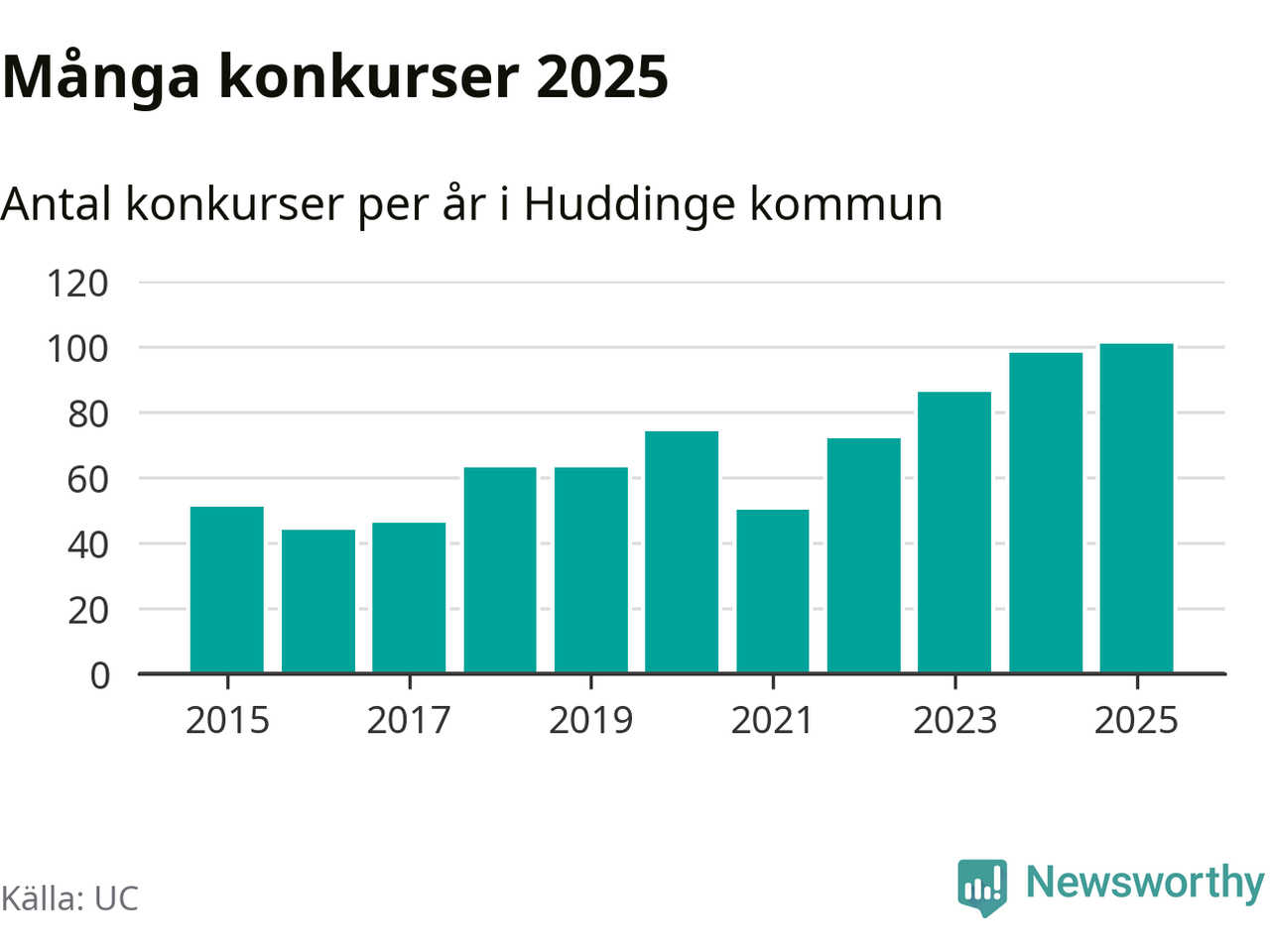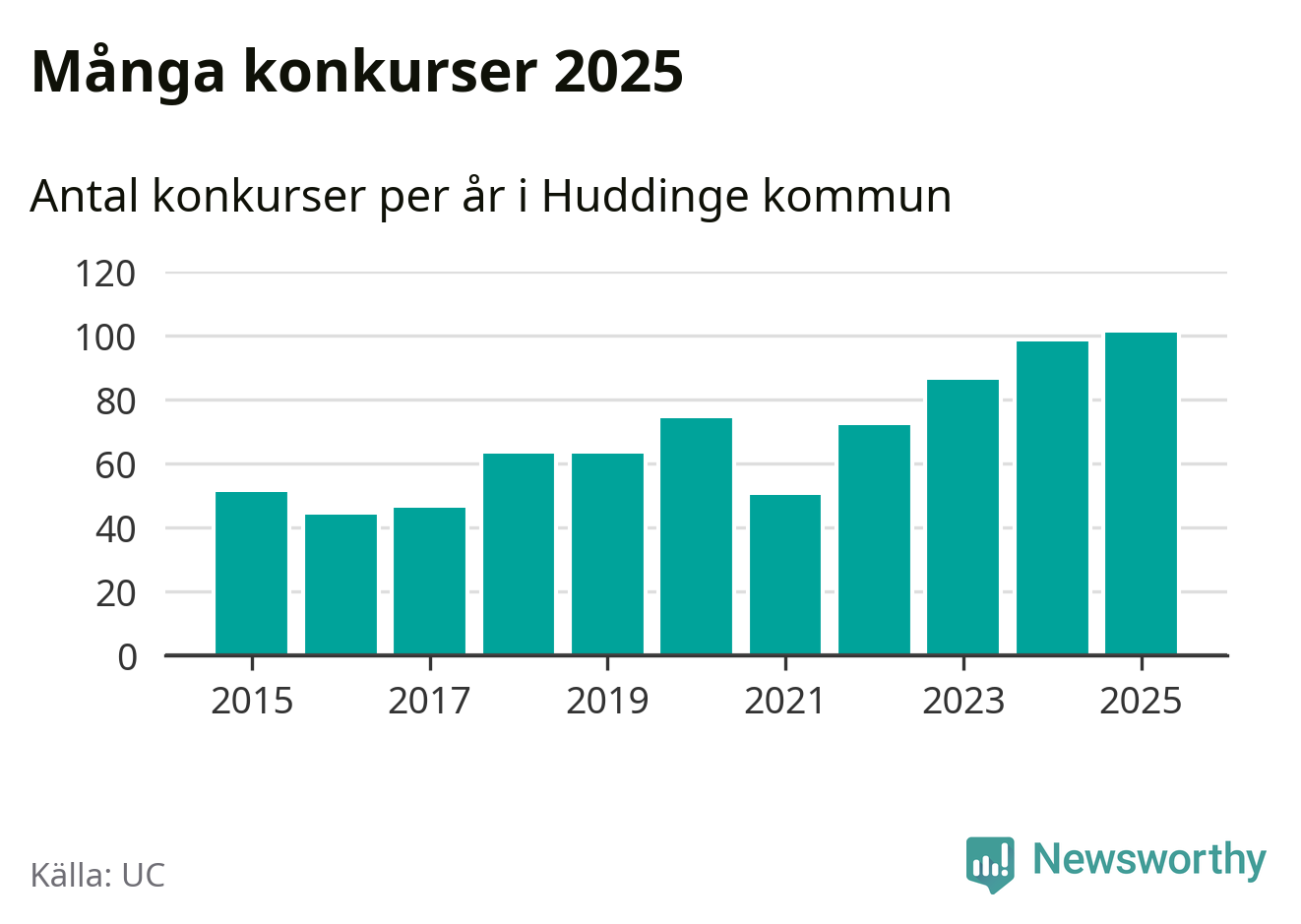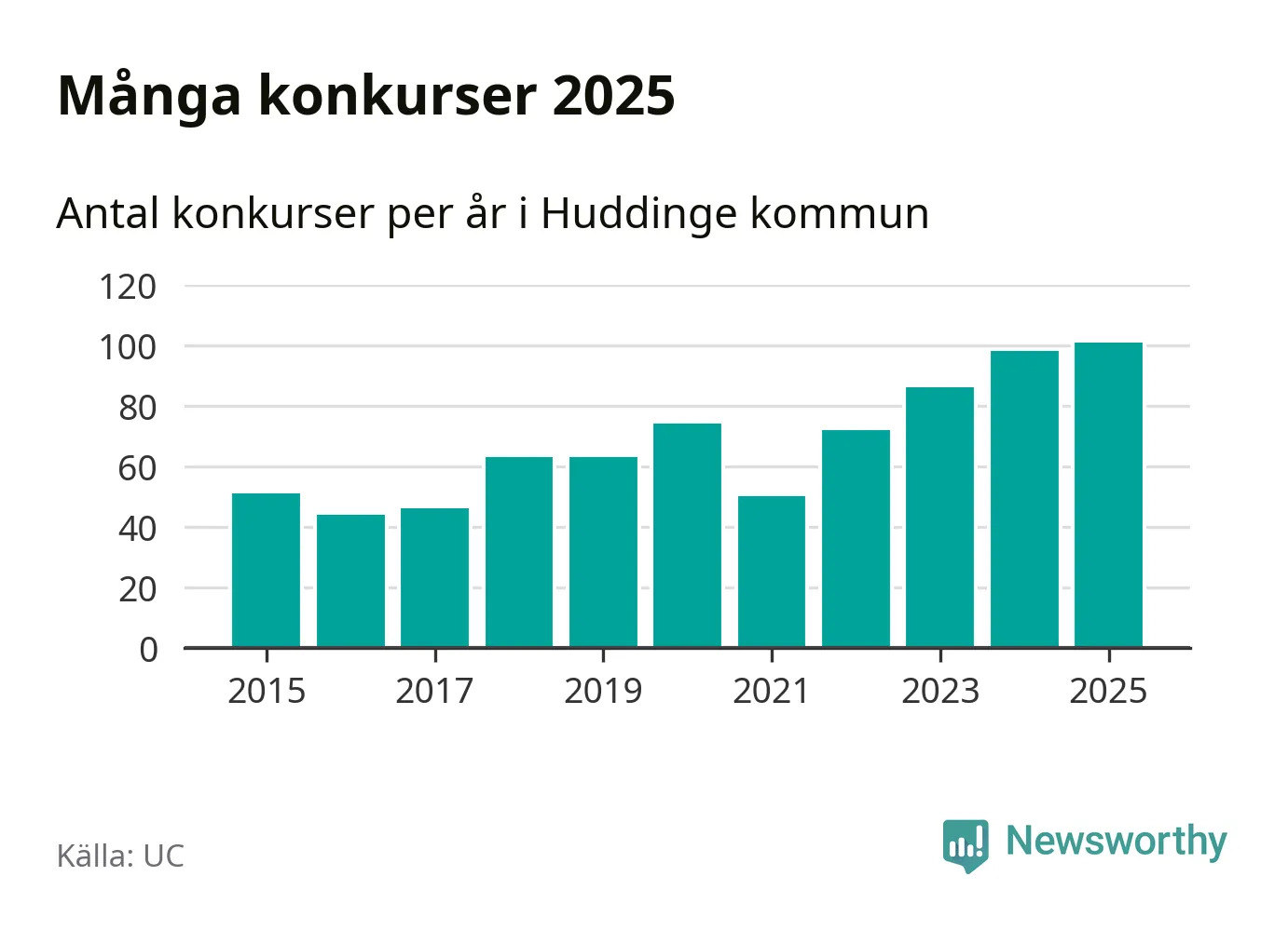 Under år 2025 gick sammanlagt 101 bolag med säte i Huddinge kommun i konkurs. Det är det högsta antalet sedan åtminstone år 2015. Det visar ny statistik från UC.
