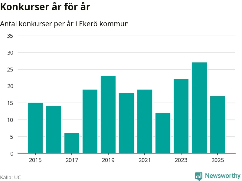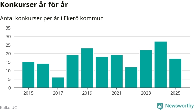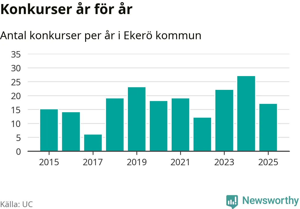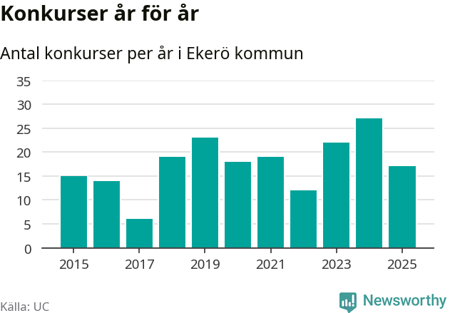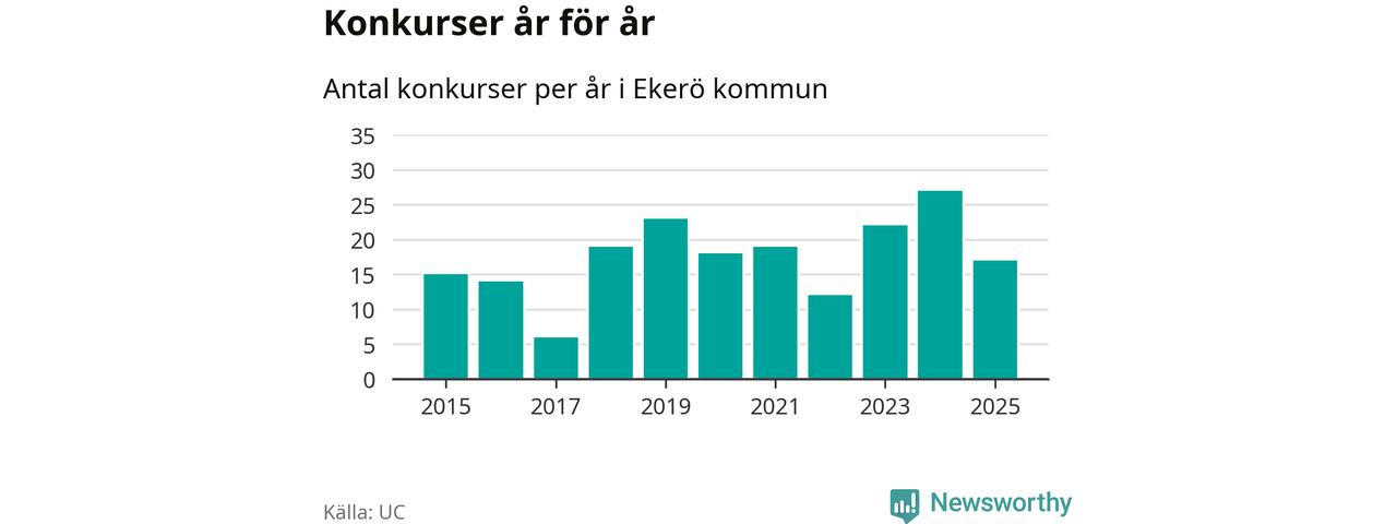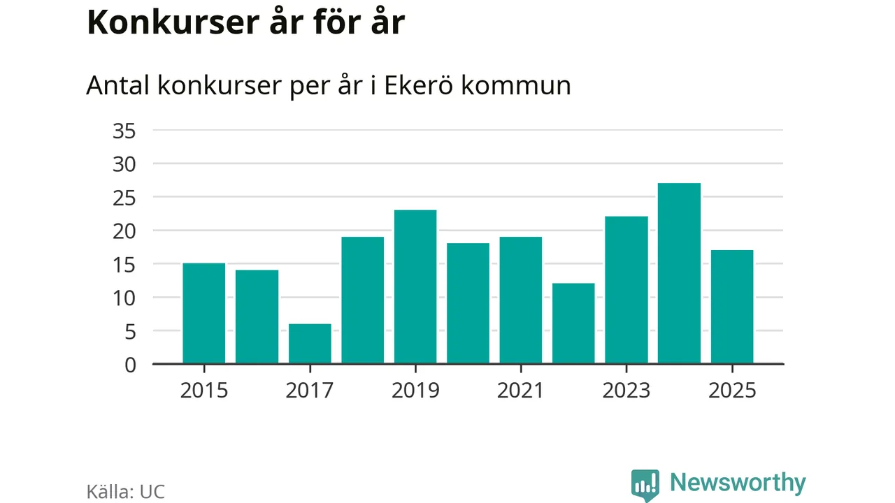 Under år 2025 gick sammanlagt 17 bolag med säte i Ekerö kommun i konkurs. Det är tio färre än året innan då 27 bolag gick i konkurs. Toppåret, sedan 2015, var just 2024 sett till antalet konkursföretag. Det visar ny statistik från UC.