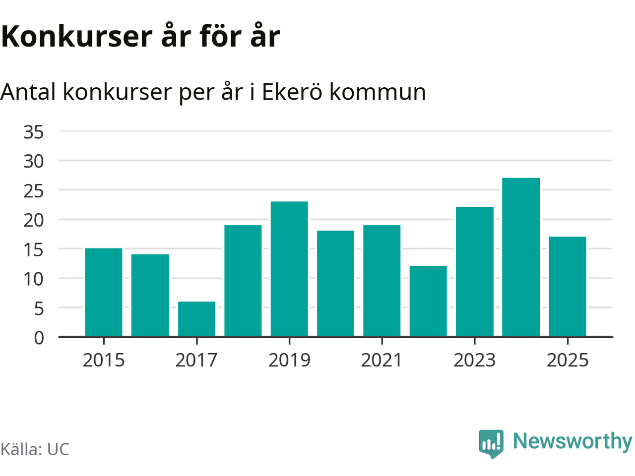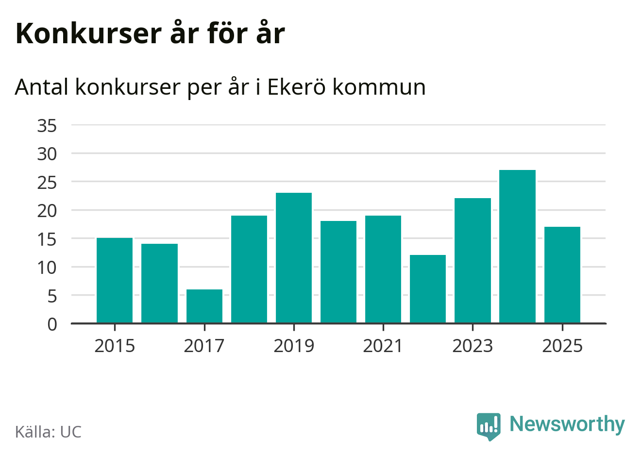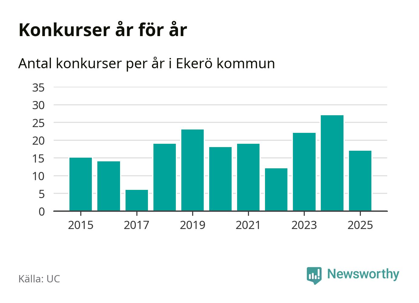 Under år 2025 gick sammanlagt 17 bolag med säte i Ekerö kommun i konkurs. Det är tio färre än året innan då 27 bolag gick i konkurs. Toppåret, sedan 2015, var just 2024 sett till antalet konkursföretag. Det visar ny statistik från UC.