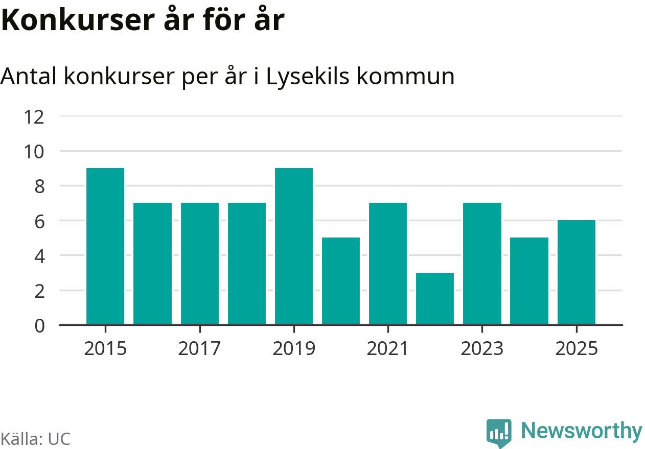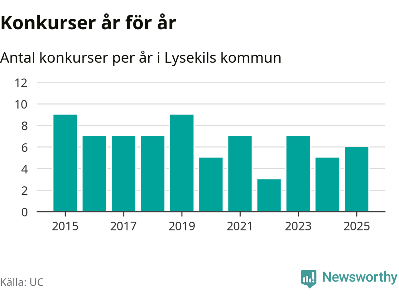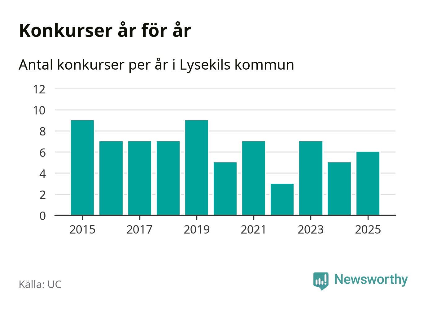 Under år 2025 gick sammanlagt sex bolag med säte i Lysekils kommun i konkurs. Det är fler än året innan, men samtidigt färre än toppåren 2015 och 2019 då nio bolag gick i konkurs. Det visar ny statistik från UC.