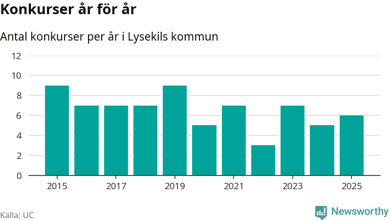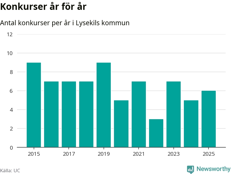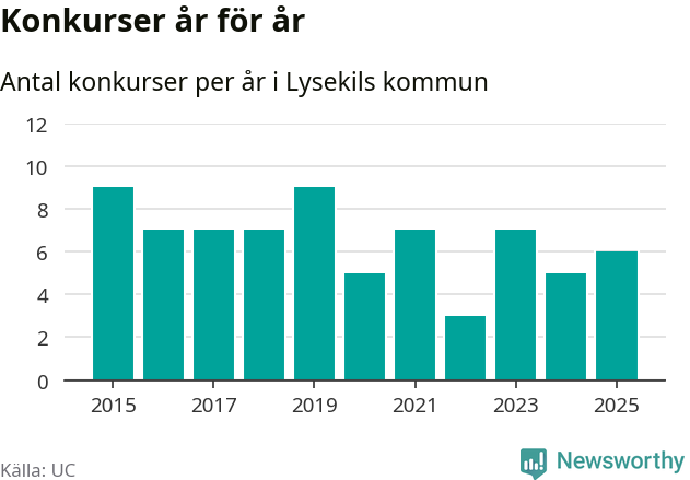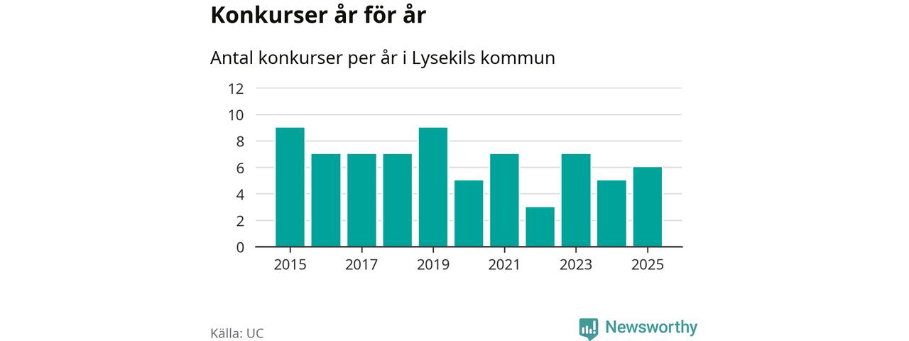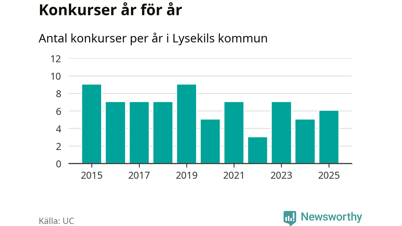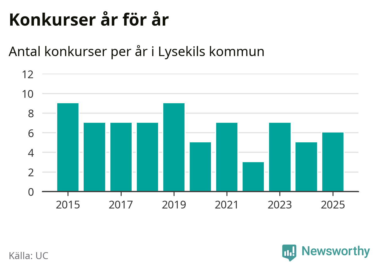 Under år 2025 gick sammanlagt sex bolag med säte i Lysekils kommun i konkurs. Det är fler än året innan, men samtidigt färre än toppåren 2015 och 2019 då nio bolag gick i konkurs. Det visar ny statistik från UC.