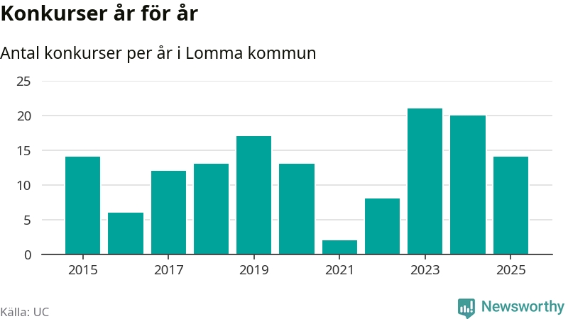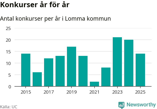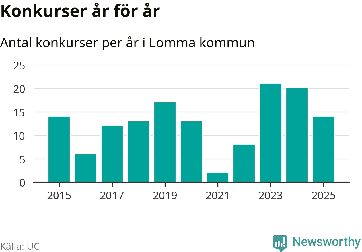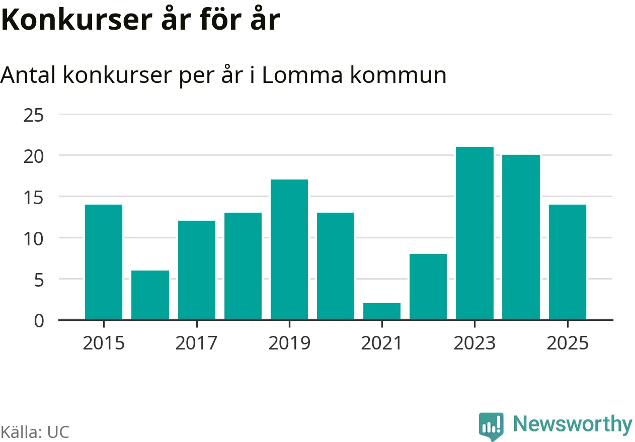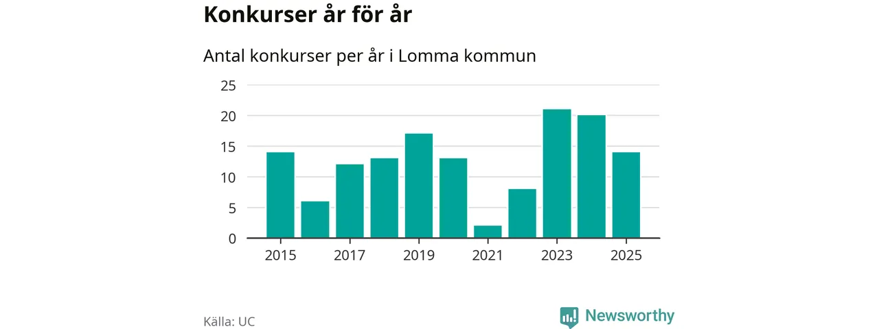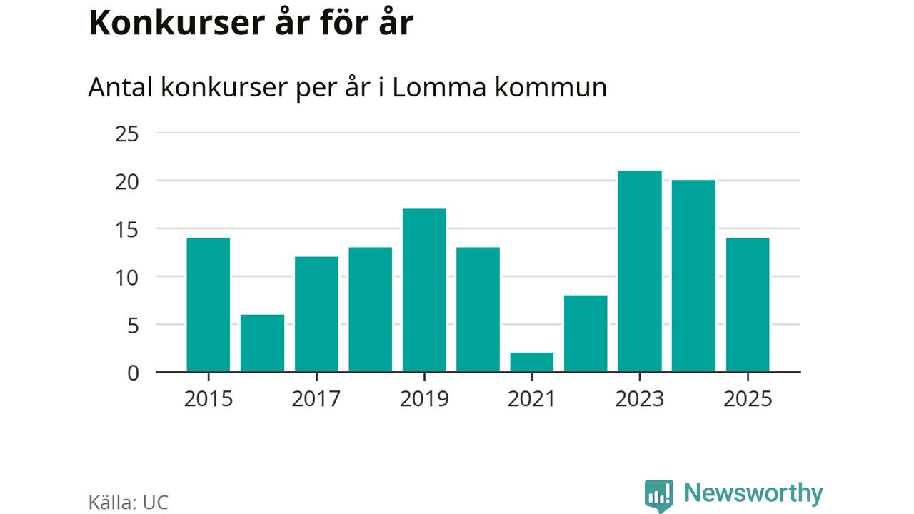 Under år 2025 gick sammanlagt 14 bolag med säte i Lomma kommun i konkurs. Det är sex färre än året innan då 20 bolag gick i konkurs och andra året i följd som konkurserna minskar. Toppåret, sedan 2015, var 2023 då 21 bolag gick i konkurs. Det visar ny statistik från UC.