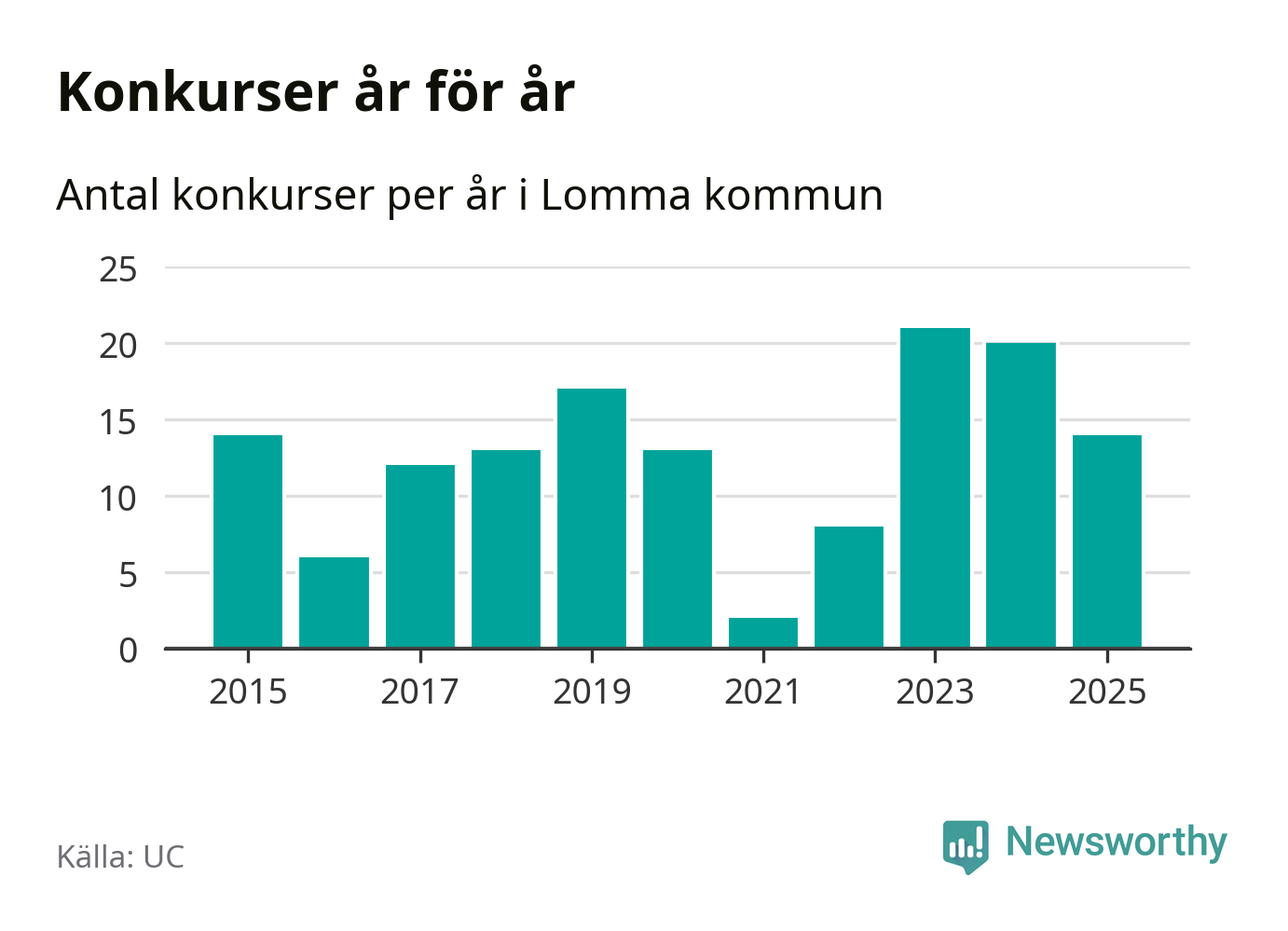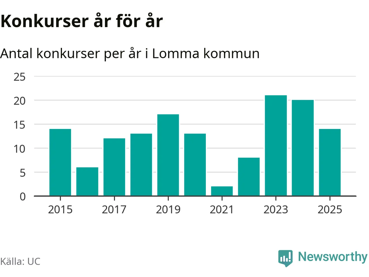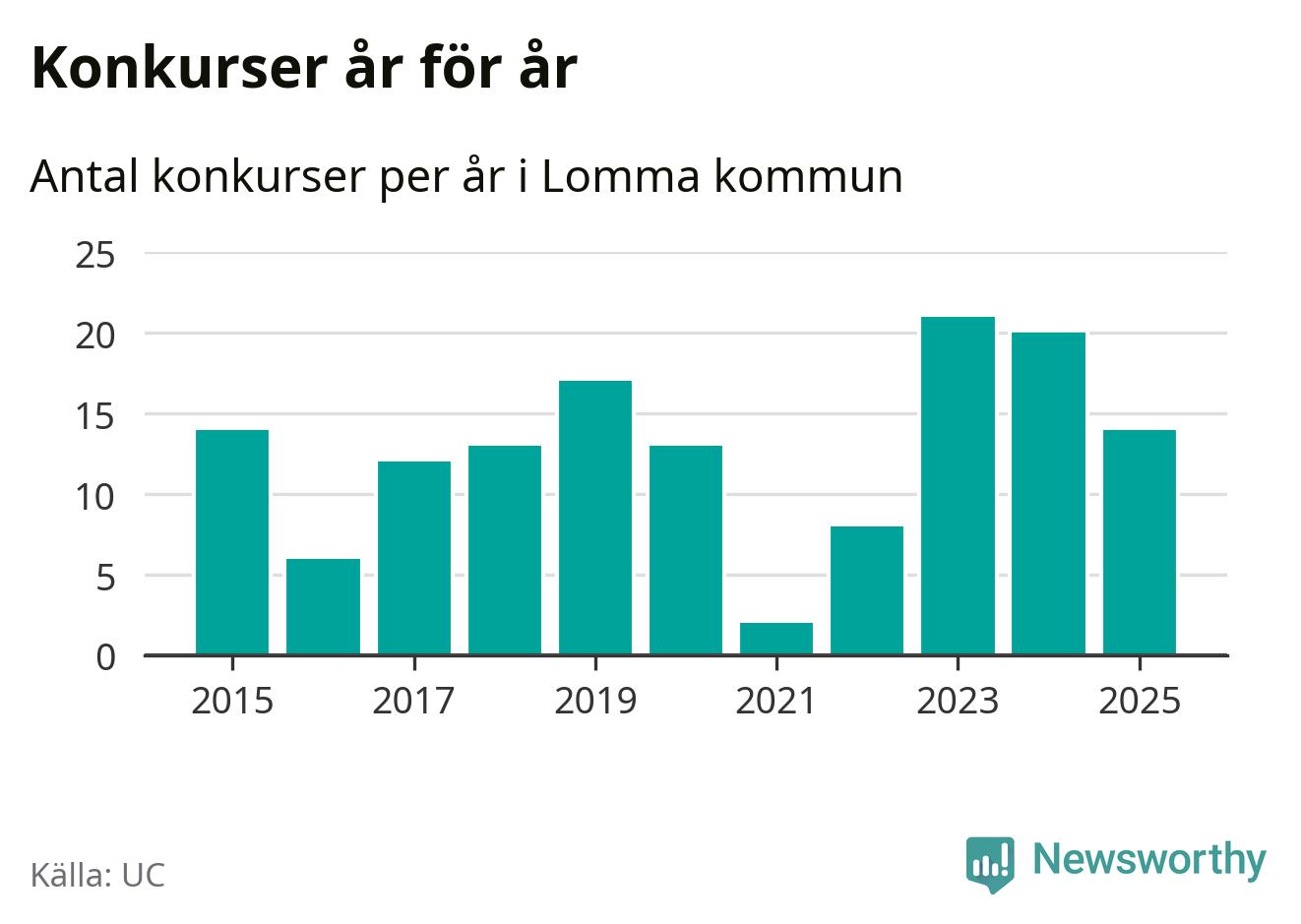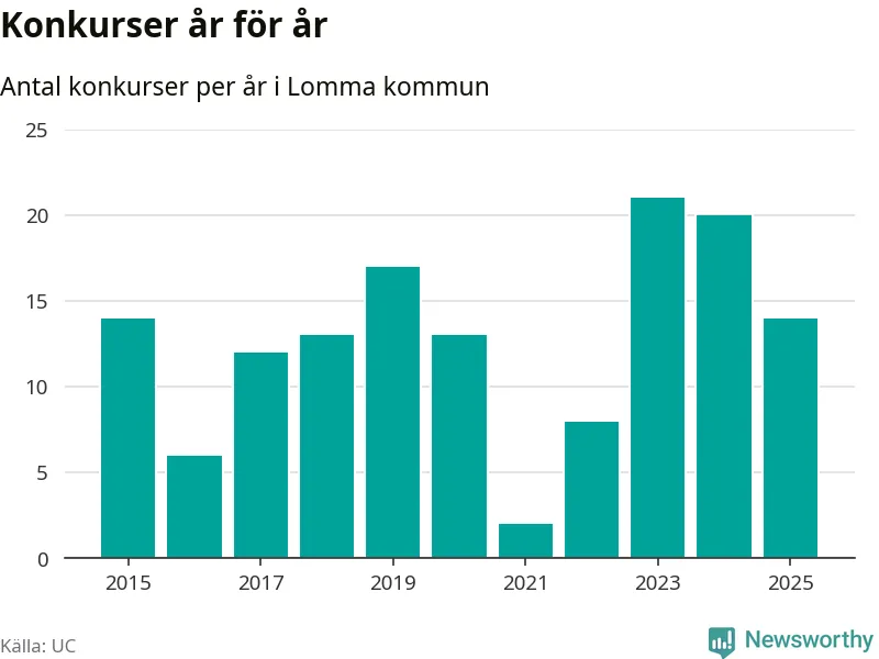 Under år 2025 gick sammanlagt 14 bolag med säte i Lomma kommun i konkurs. Det är sex färre än året innan då 20 bolag gick i konkurs och andra året i följd som konkurserna minskar. Toppåret, sedan 2015, var 2023 då 21 bolag gick i konkurs. Det visar ny statistik från UC.