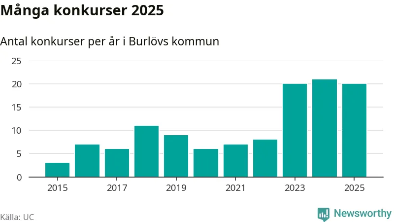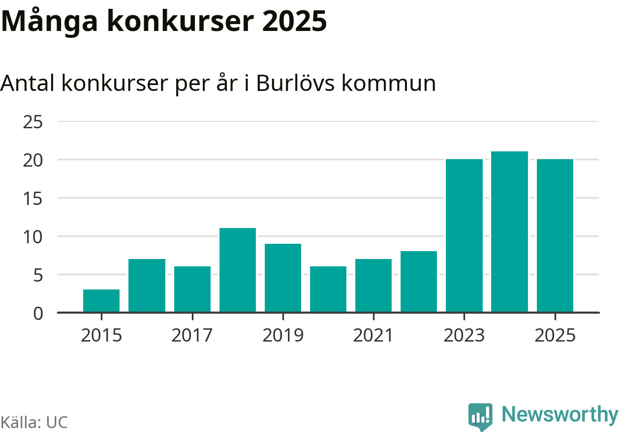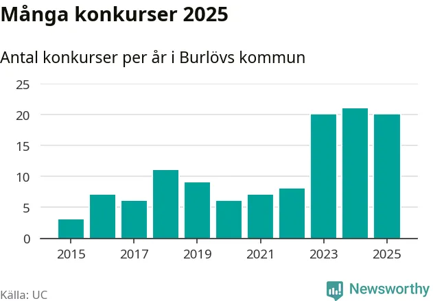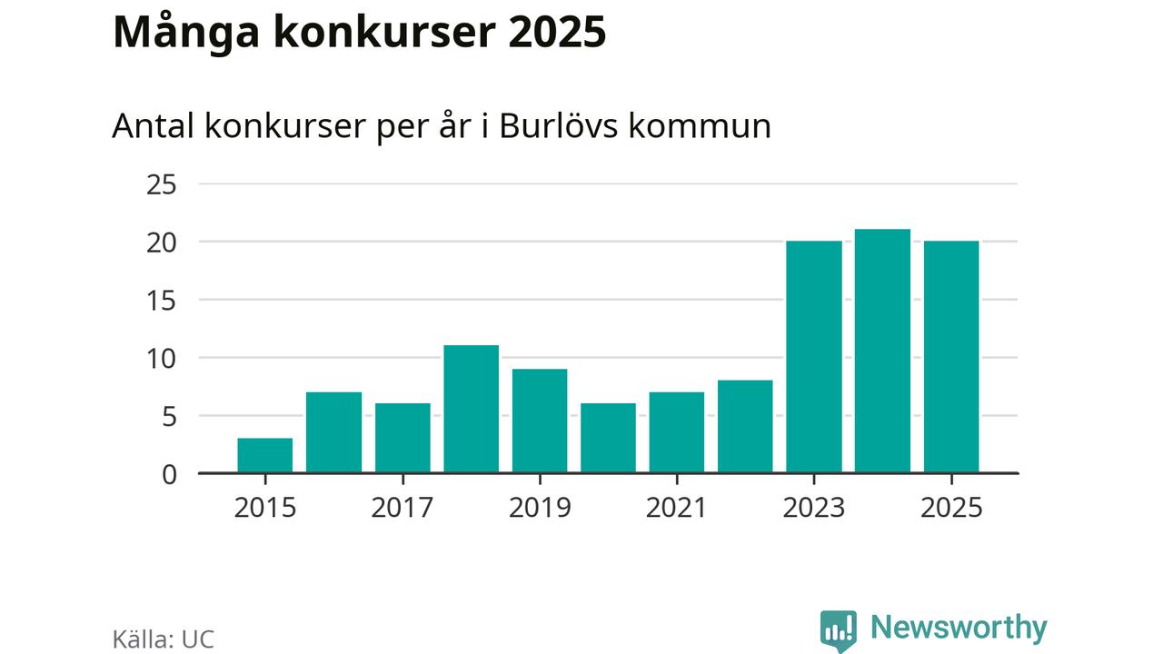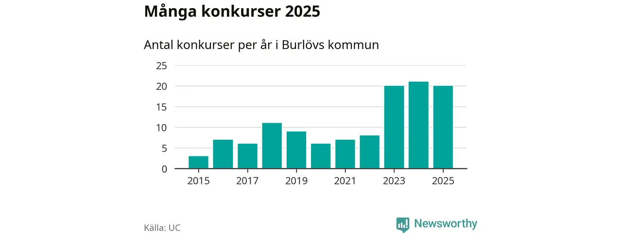 Under år 2025 gick sammanlagt 20 bolag med säte i Burlövs kommun i konkurs. Det är ett färre än året innan. Toppåret, sedan 2015, var just 2024 sett till antalet konkursföretag. Det visar ny statistik från UC.