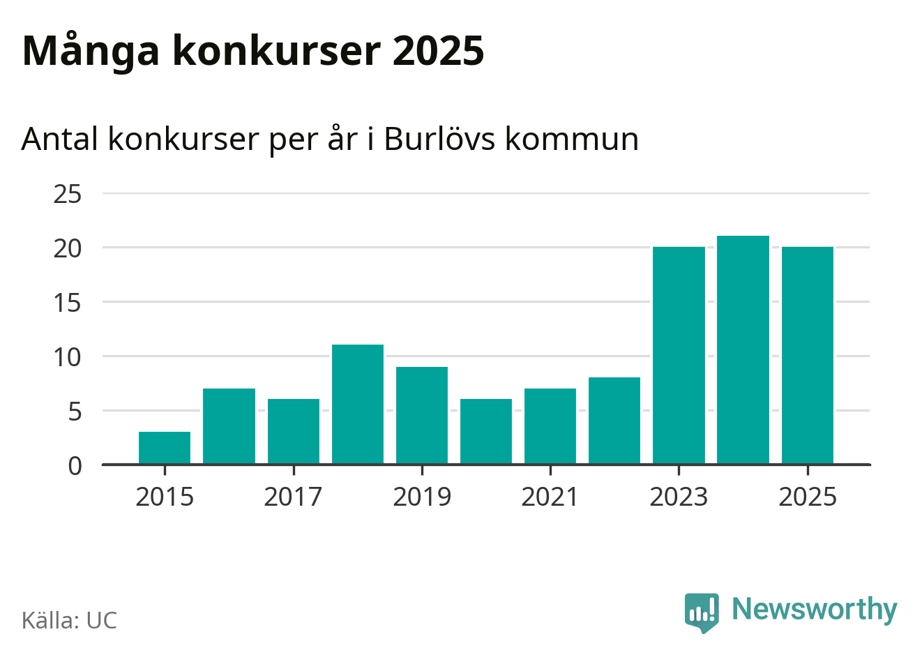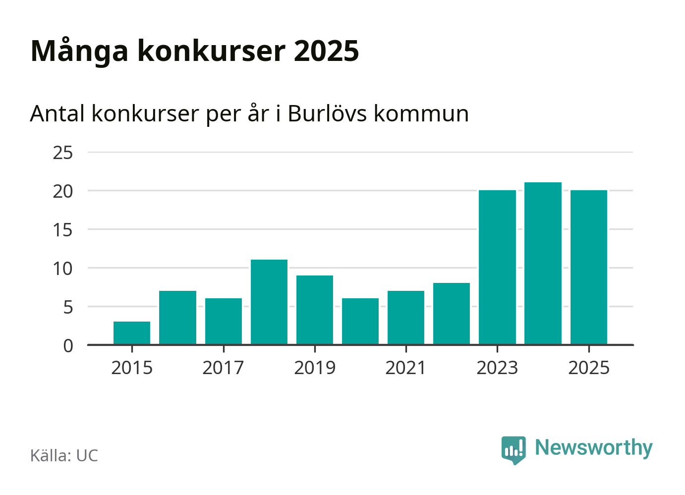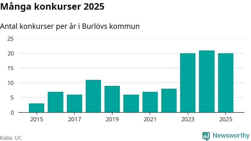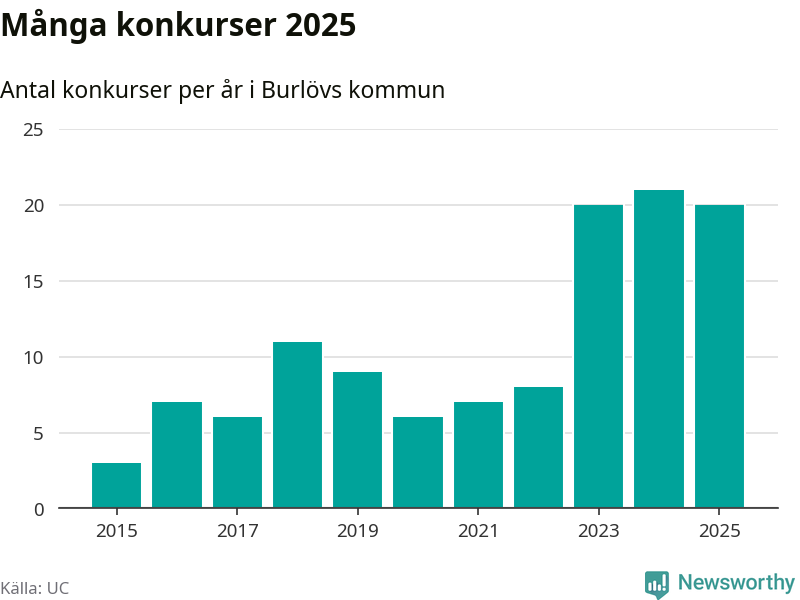 Under år 2025 gick sammanlagt 20 bolag med säte i Burlövs kommun i konkurs. Det är ett färre än året innan. Toppåret, sedan 2015, var just 2024 sett till antalet konkursföretag. Det visar ny statistik från UC.