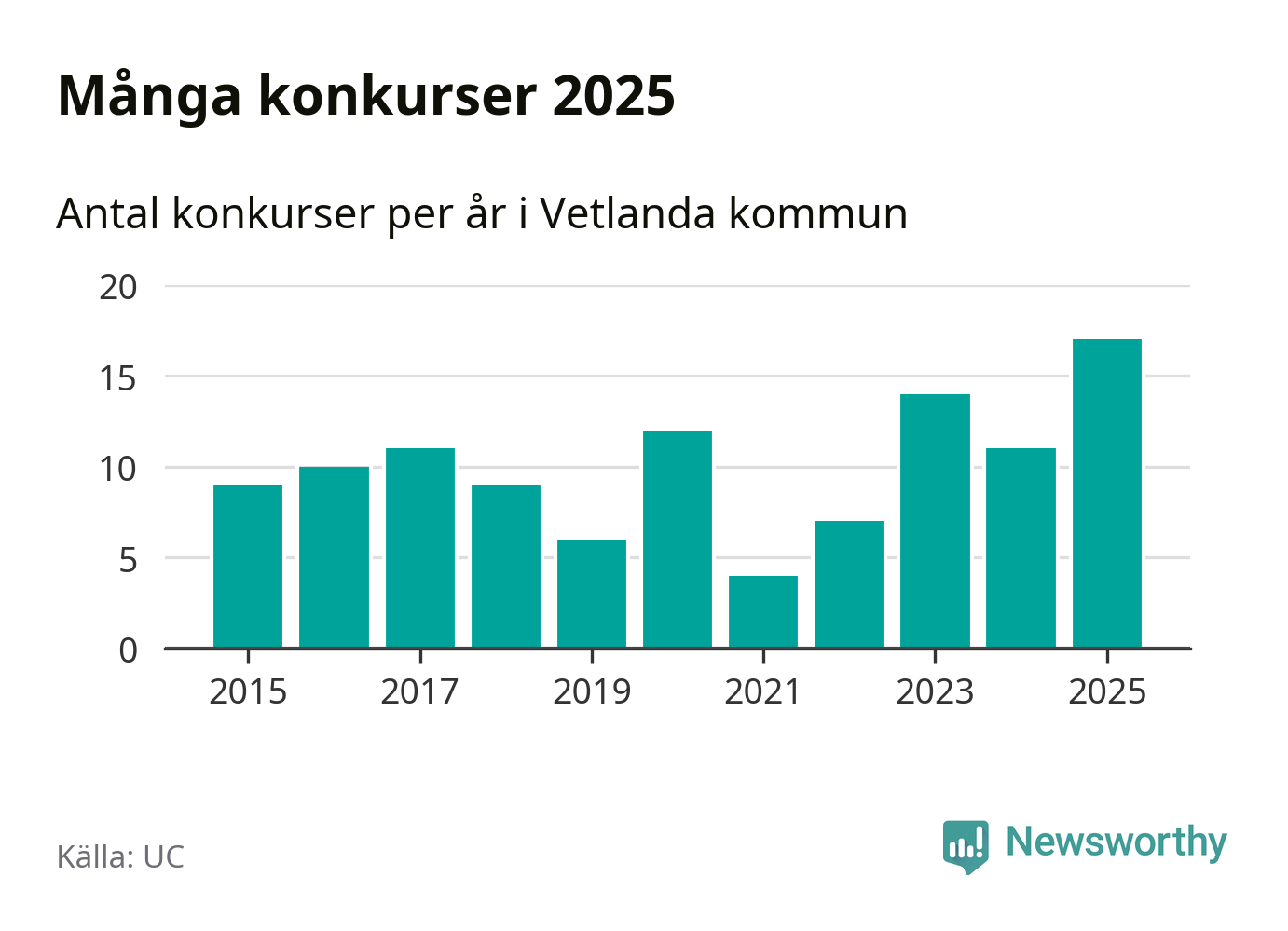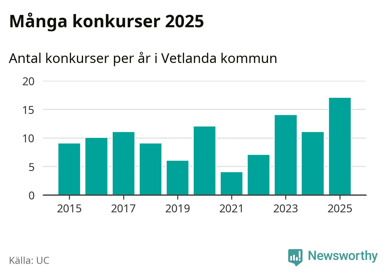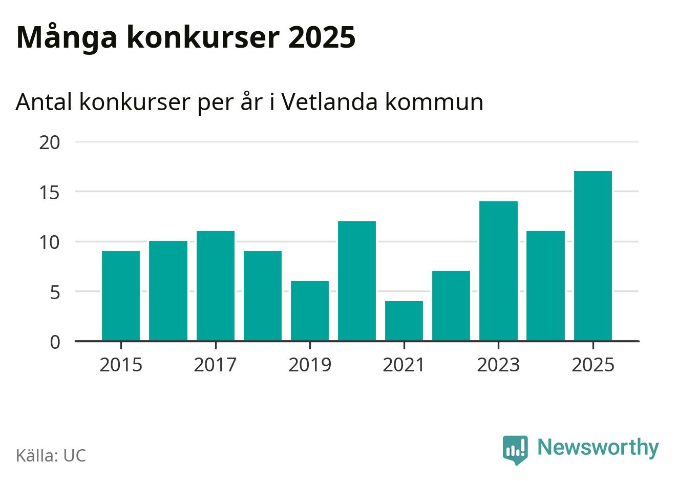 Under år 2025 gick sammanlagt 17 bolag med säte i Vetlanda kommun i konkurs. Det är det högsta antalet sedan åtminstone år 2015. Det visar ny statistik från UC.