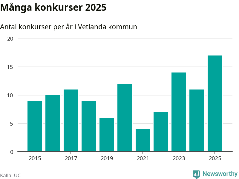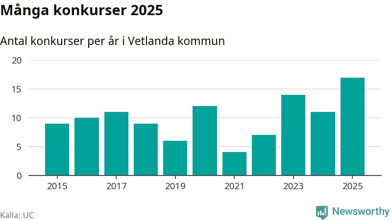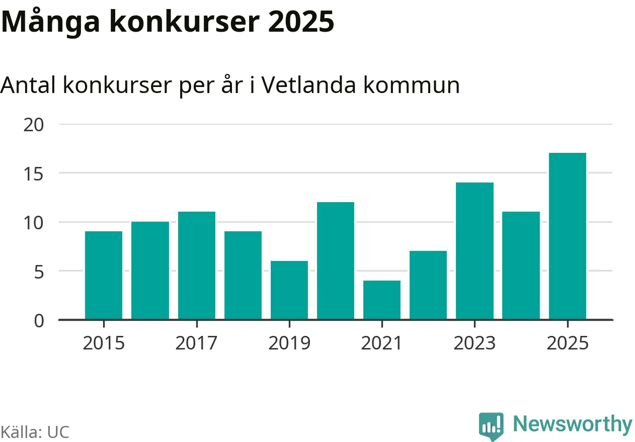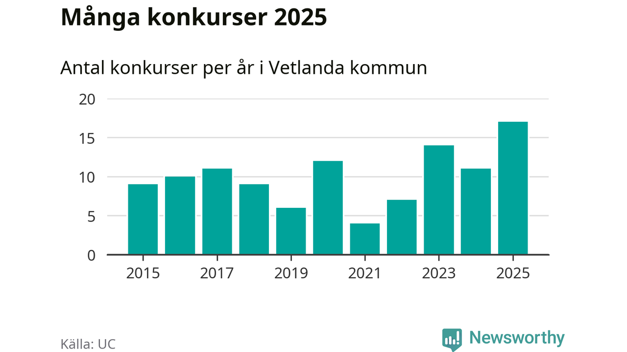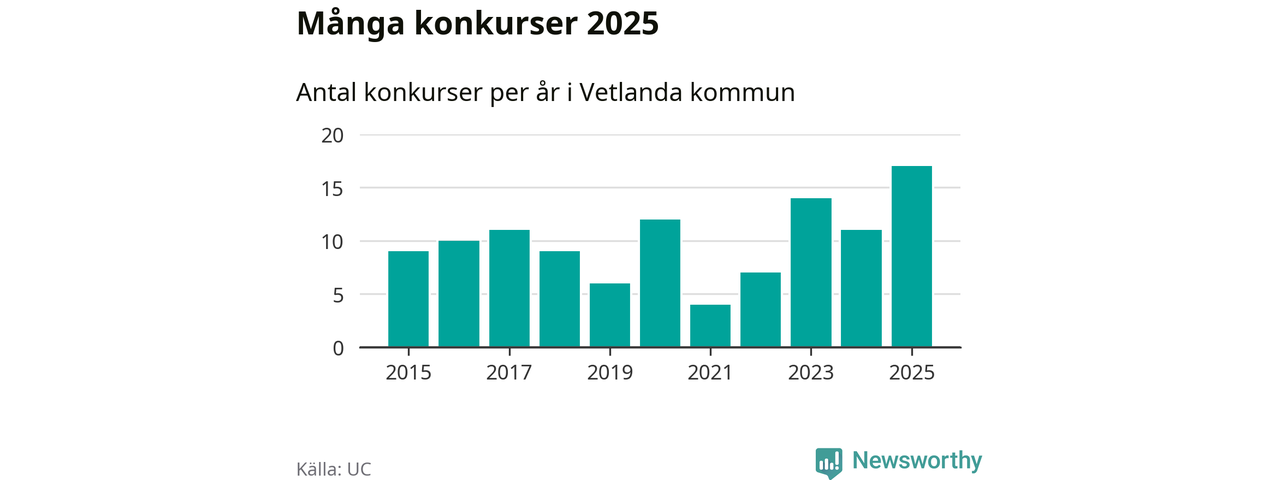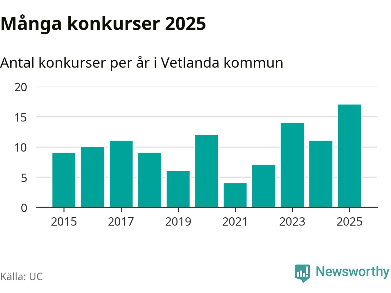 Under år 2025 gick sammanlagt 17 bolag med säte i Vetlanda kommun i konkurs. Det är det högsta antalet sedan åtminstone år 2015. Det visar ny statistik från UC.