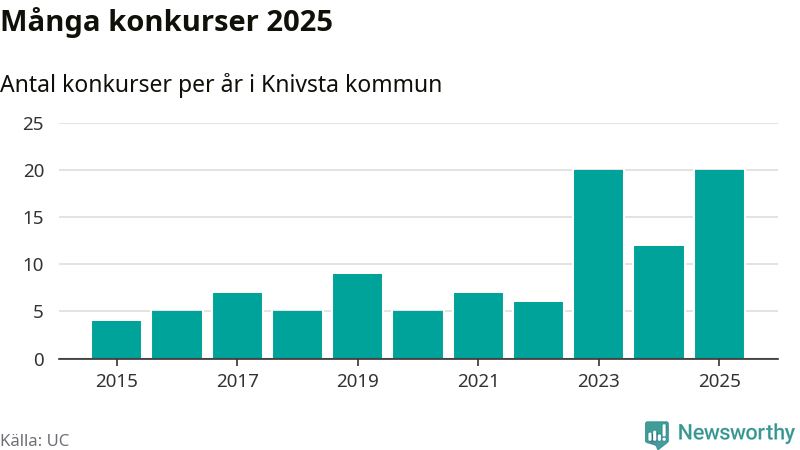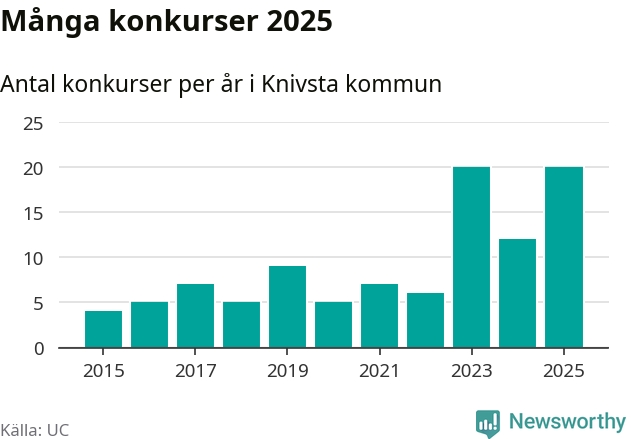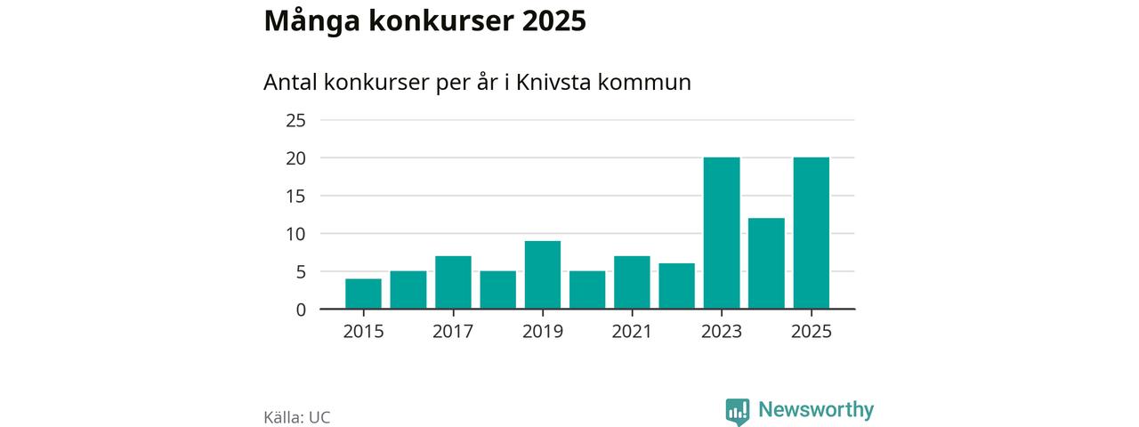 Under år 2025 gick sammanlagt 20 bolag med säte i Knivsta kommun i konkurs. Det är, tillsammans med 2023, det högsta antalet sedan åtminstone år 2015. Det visar ny statistik från UC.