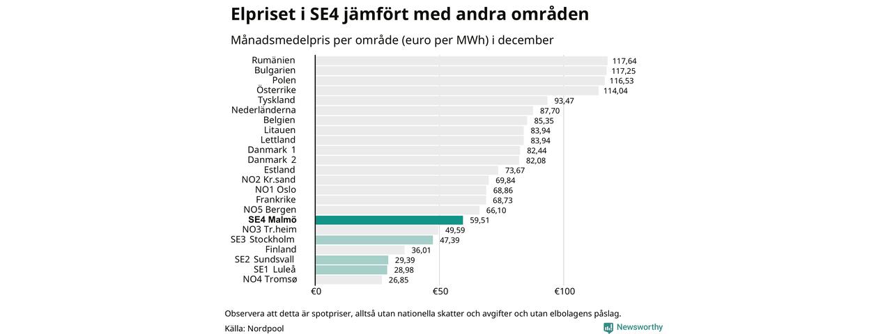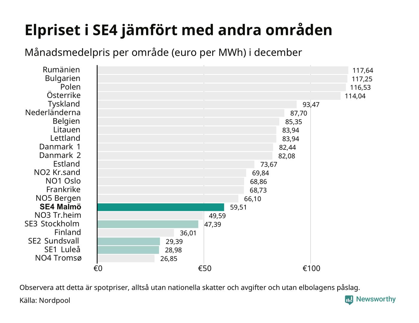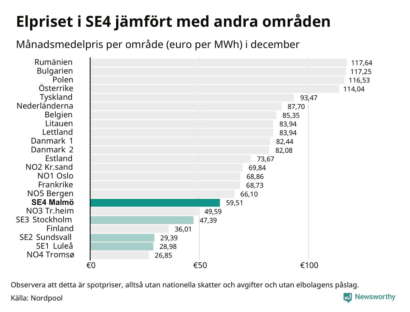 Om man tittar på månadsmedelpriset brukar de svenska elområdena oftast tillhöra de med lägst spotpriser i en europeisk jämförelse. Värt att notera är att detta handlar om spotpriser, de priser konsumenten sedan betalar beror på nationella avgifter och skatter samt elbolagens påslag. I praktiken ligger de svenska konsumentpriserna närmare det europeiska snittet efter skatter och påslag.