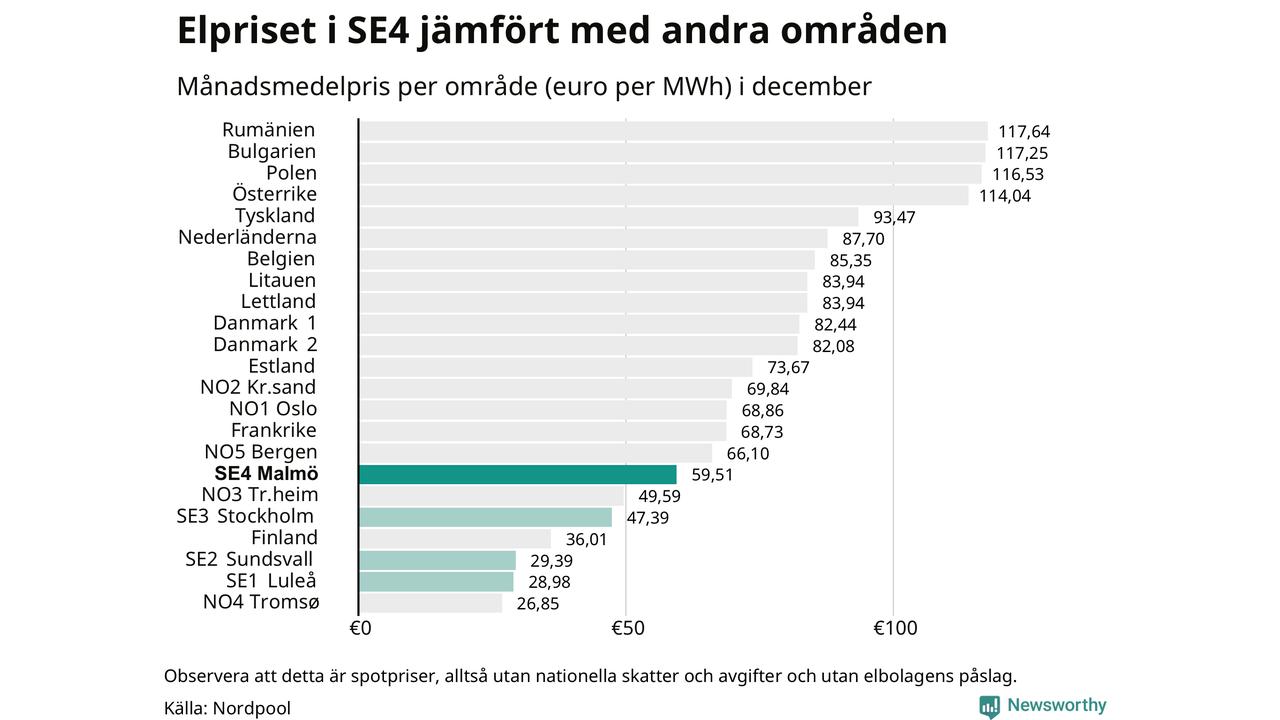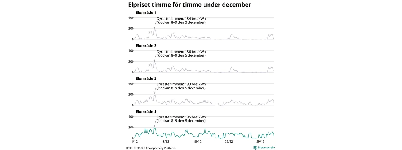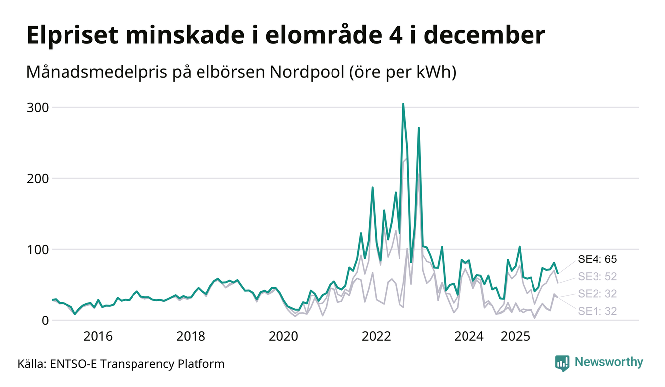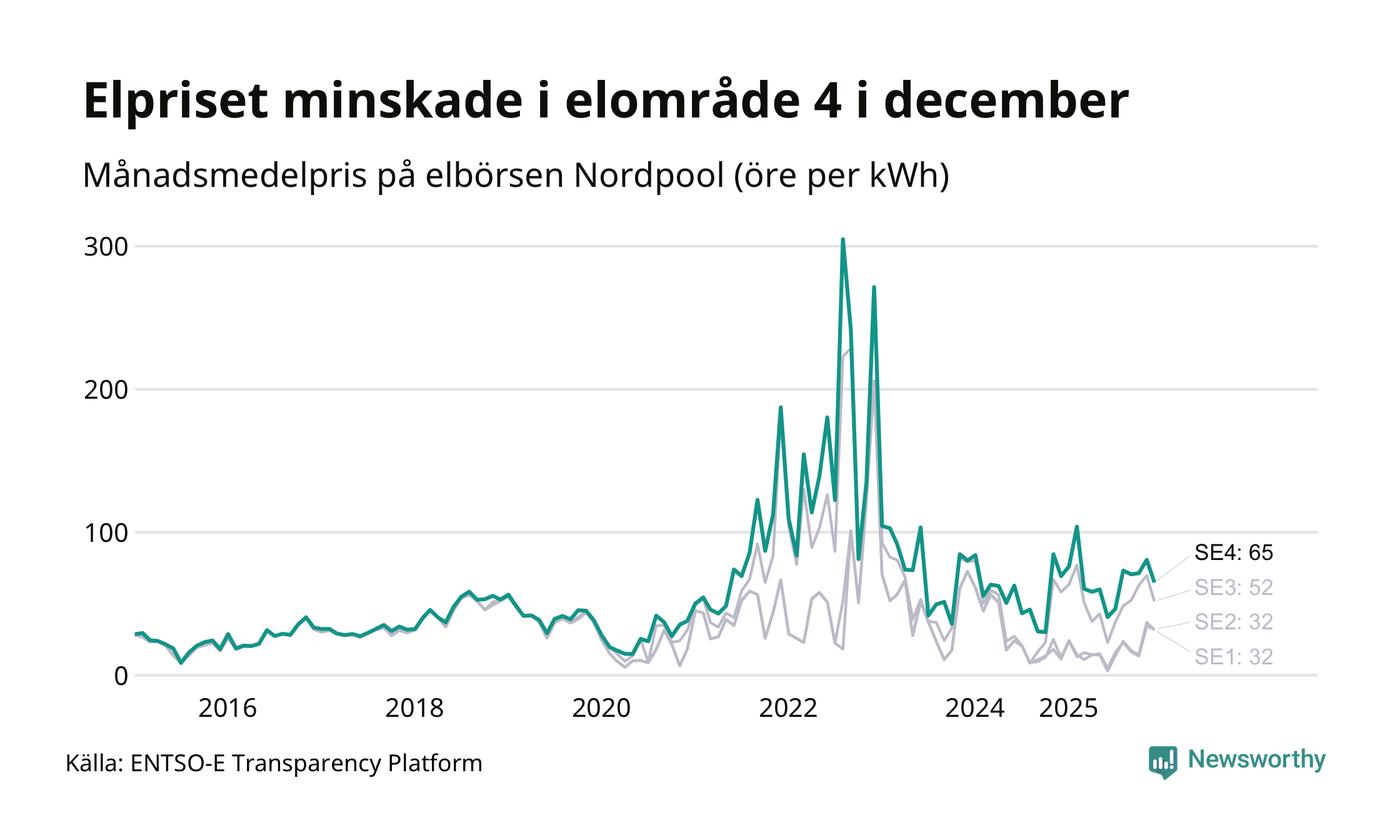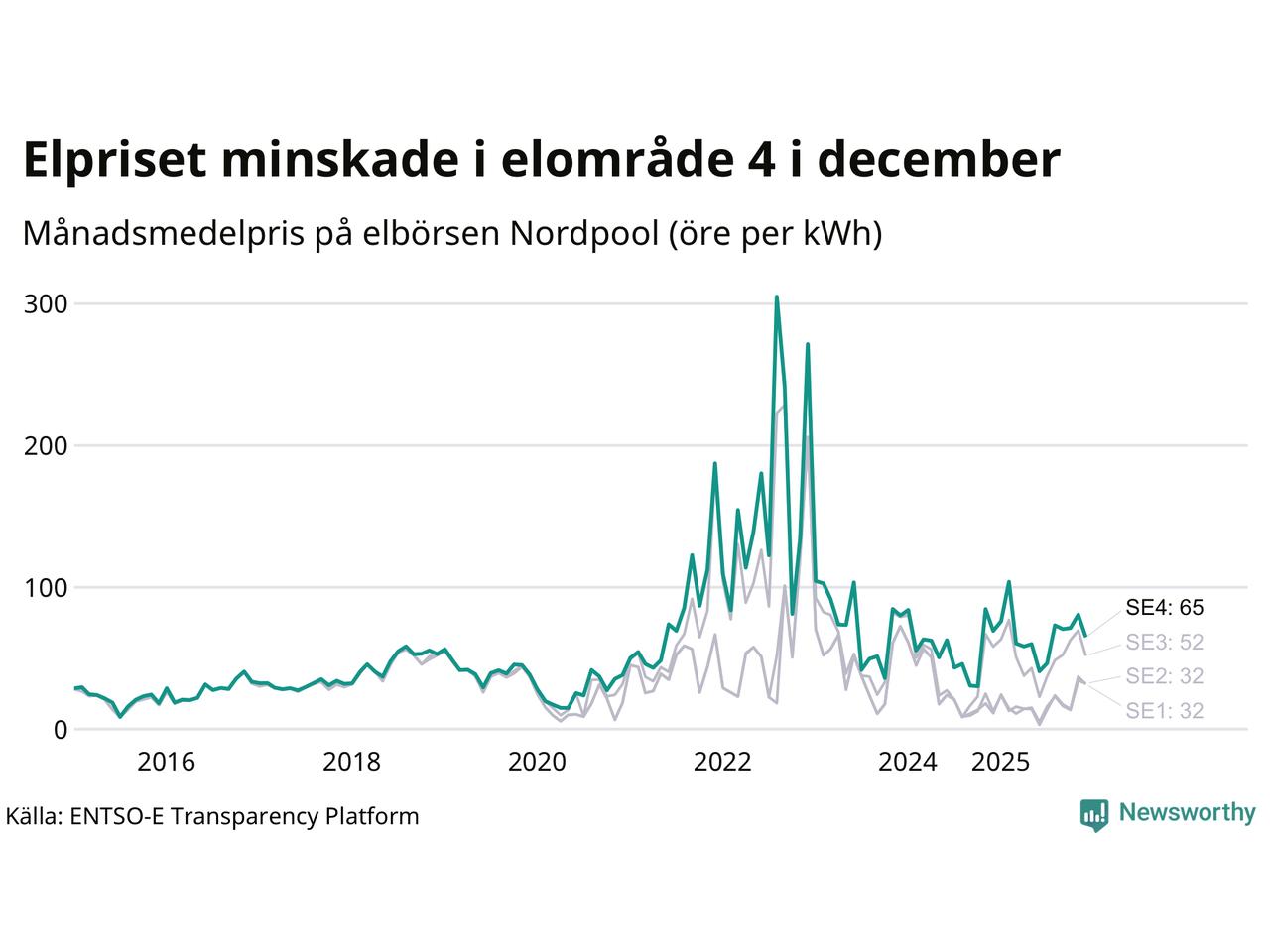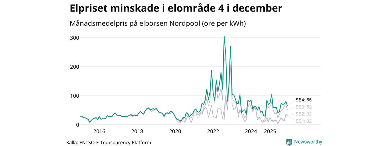 Spotpriset – alltså priset som elbolagen köper in elen för – sjönk i elområde 4 som Älmhult tillhör. Månadspriset i december var 65 öre per kilowattimme, vilket är 16 öre billigare än i november. Det är det lägsta priset i området sedan juli 2025. Det högsta priset i elområdet hittills noterades i augusti 2022, då en kilowattimme kostade 305 öre. För ett år sedan – i december 2024 – kostade en kilowattimme 69 öre.