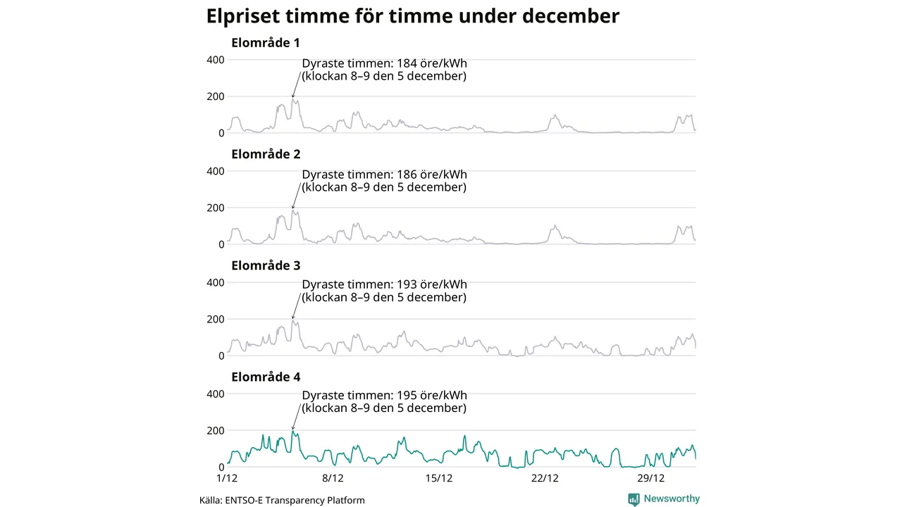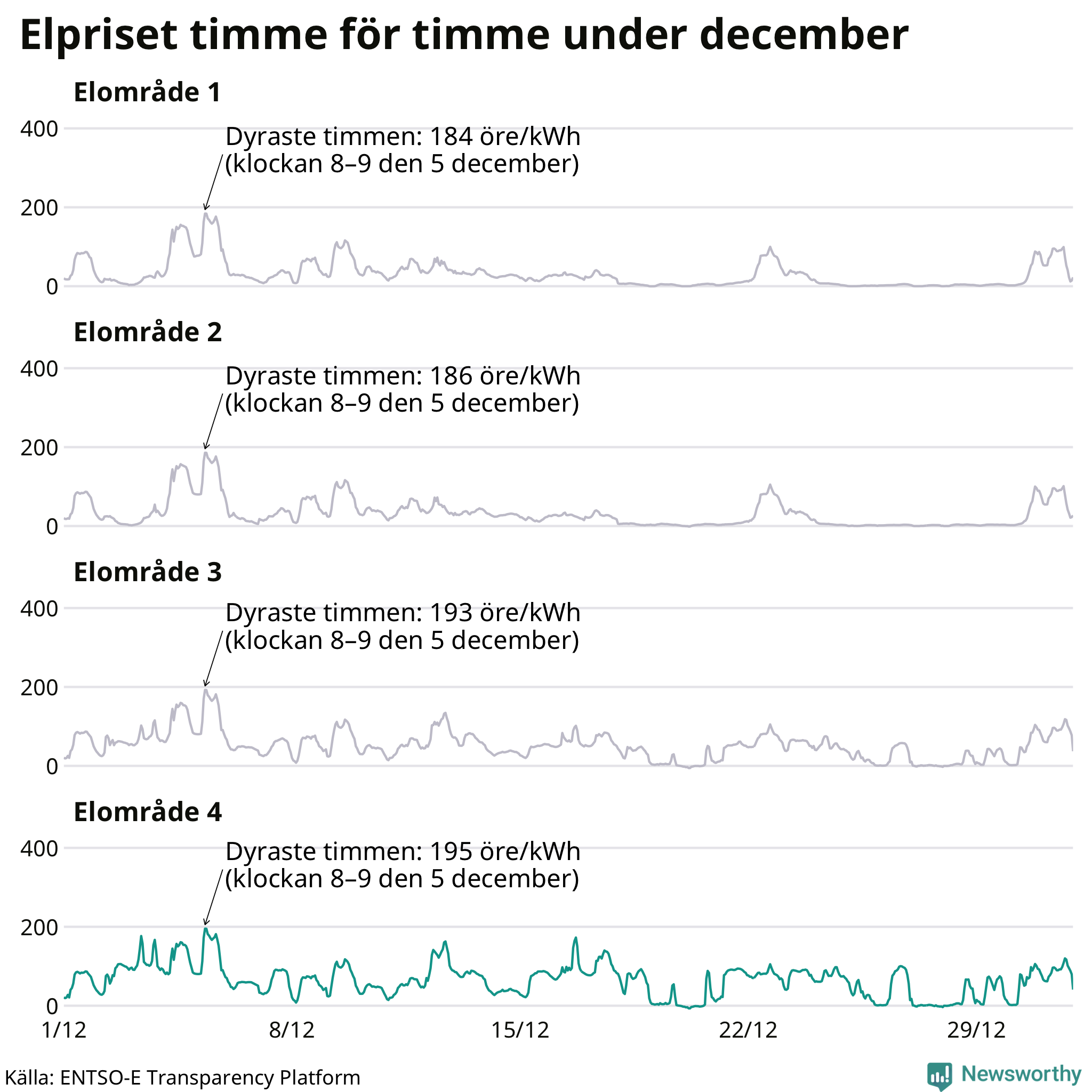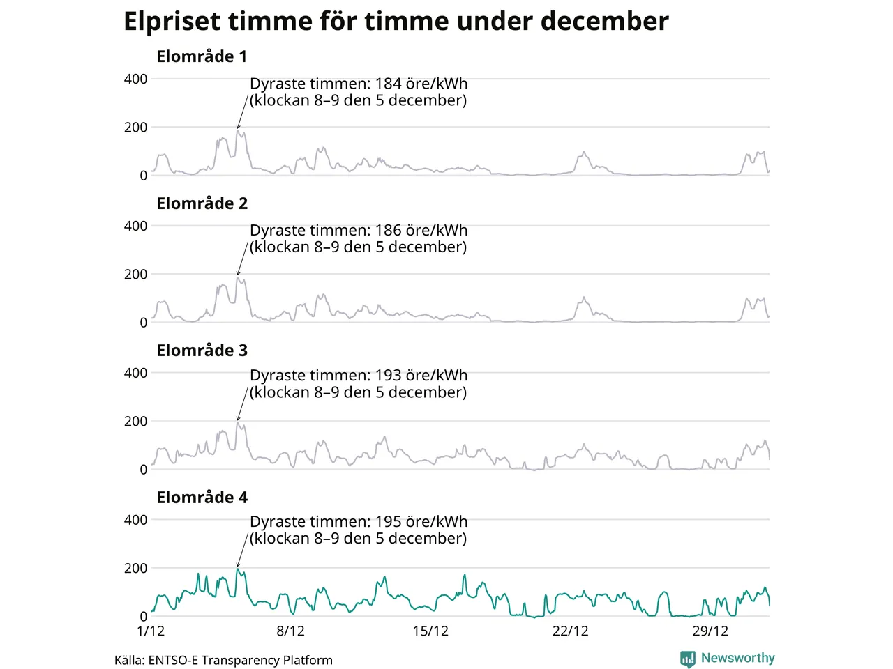 Det är inte bara prisskillnaderna mellan prisområdena som har ökat de senaste åren, även inom områdena pendlar priserna mer över tid. Sedan oktober sätts priserna varje kvart. Dyraste timmen i december i Älmhult inträffade mellan klockan 7 och 8 den 5 december, då kostade en kilowattimme i snitt 195 öre. Som lägst var snittpriset per timme i området −7 öre. Under december var timpriset negativt under 30 timmar. Negativa timpriser har noterats varje månad under det senaste året.
