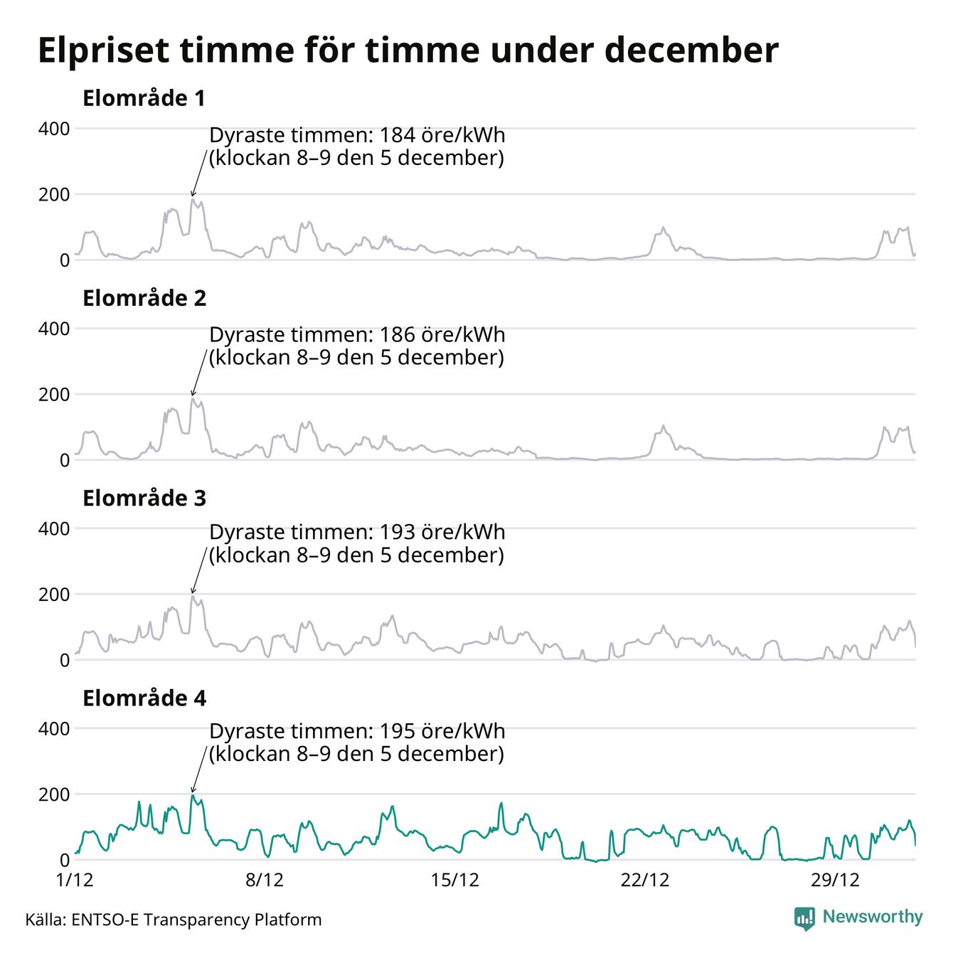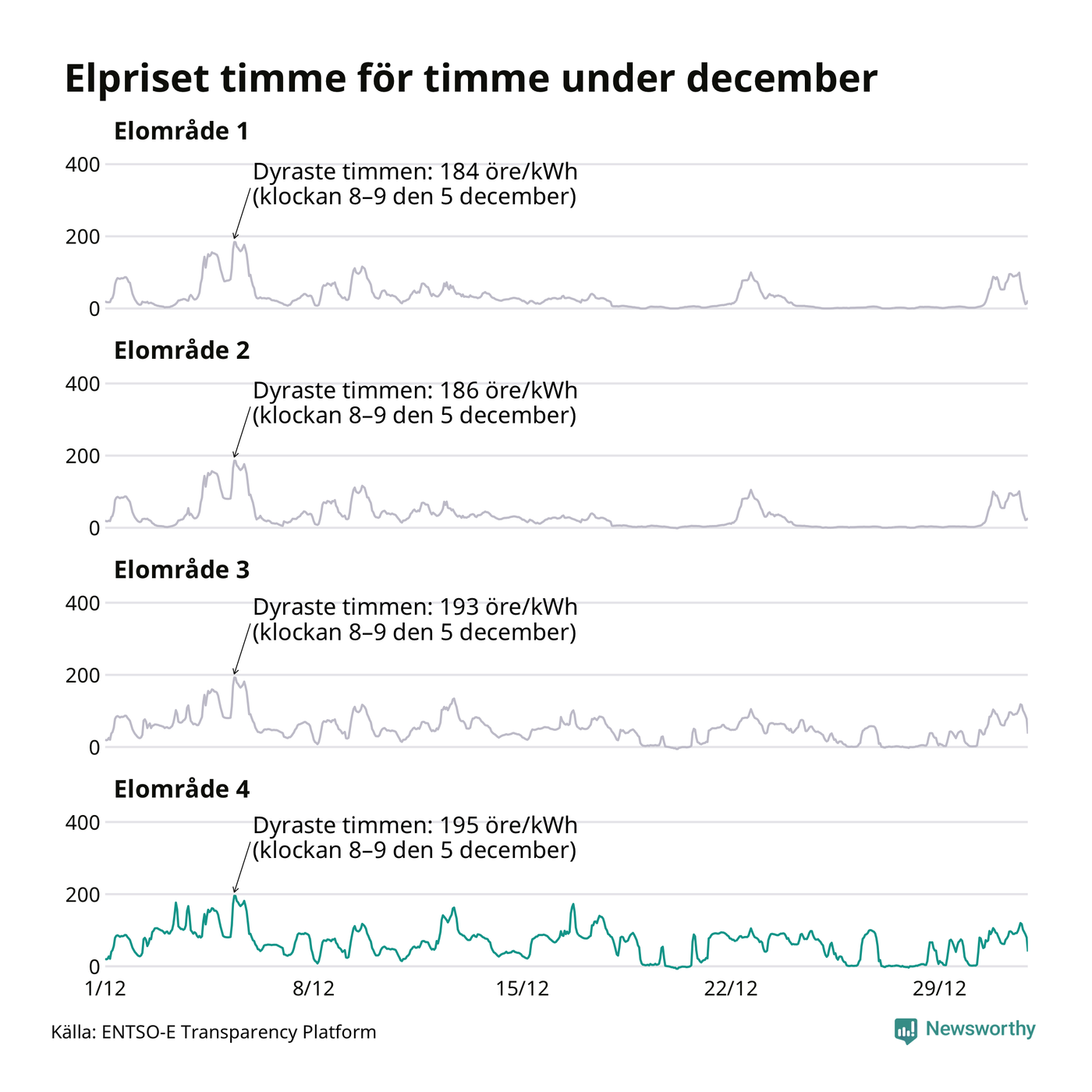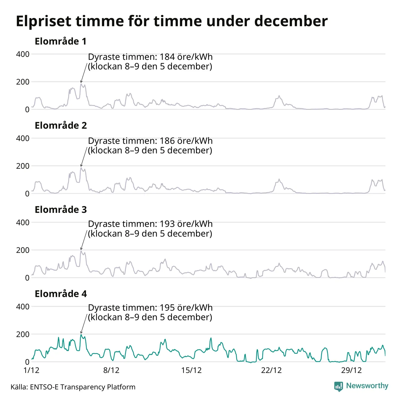 Det är inte bara prisskillnaderna mellan prisområdena som har ökat de senaste åren, även inom områdena pendlar priserna mer över tid. Sedan oktober sätts priserna varje kvart. Dyraste timmen i december i Älmhult inträffade mellan klockan 7 och 8 den 5 december, då kostade en kilowattimme i snitt 195 öre. Som lägst var snittpriset per timme i området −7 öre. Under december var timpriset negativt under 30 timmar. Negativa timpriser har noterats varje månad under det senaste året.