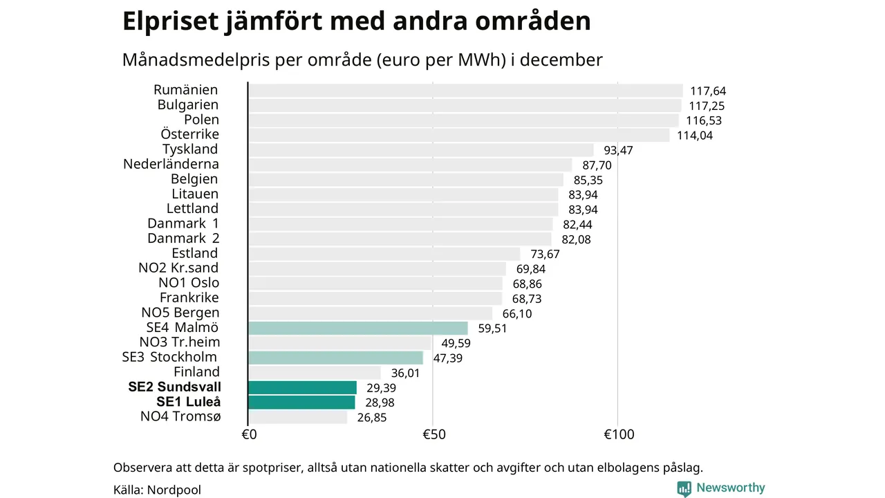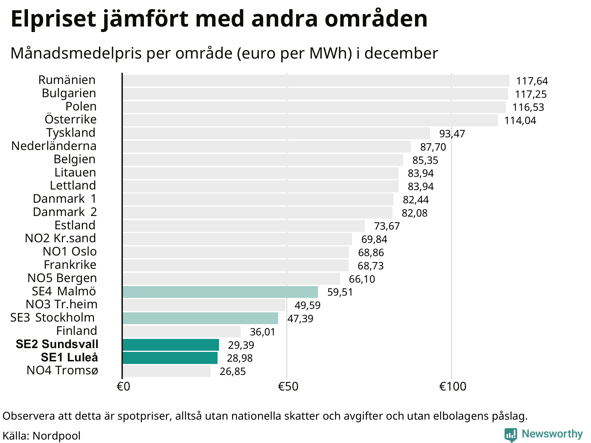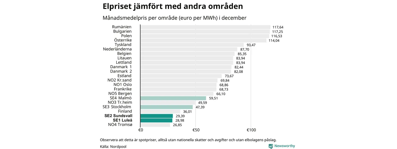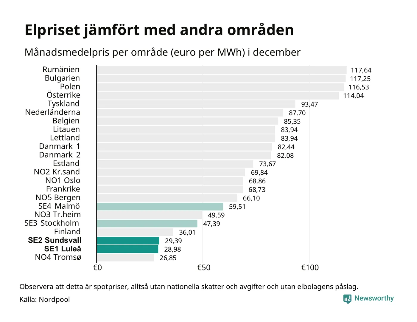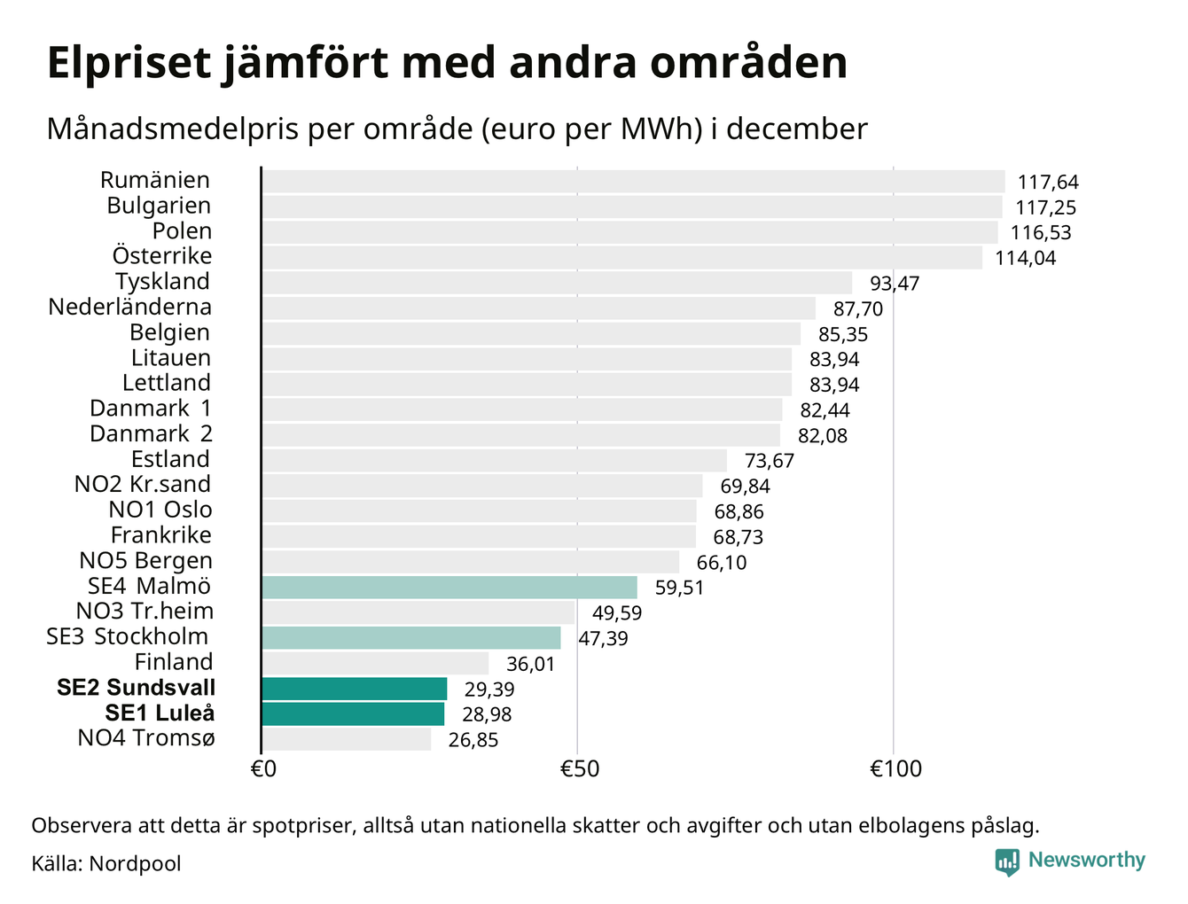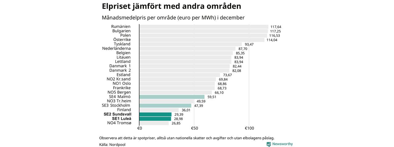 Om man tittar på månadsmedelpriset brukar de svenska elområdena oftast tillhöra de med lägst spotpriser i en europeisk jämförelse. Värt att notera är att detta handlar om spotpriser, de priser konsumenten sedan betalar beror på nationella avgifter och skatter samt elbolagens påslag. I praktiken ligger de svenska konsumentpriserna närmare det europeiska snittet efter skatter och påslag.