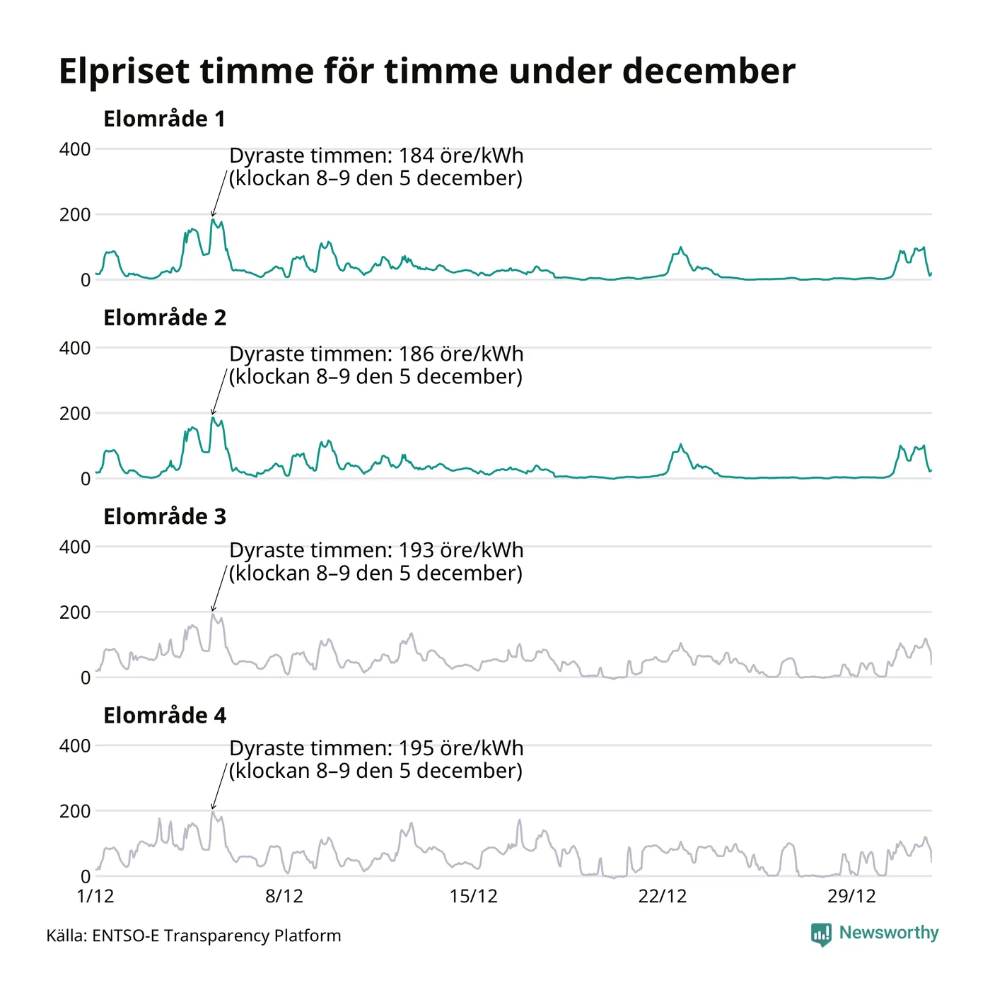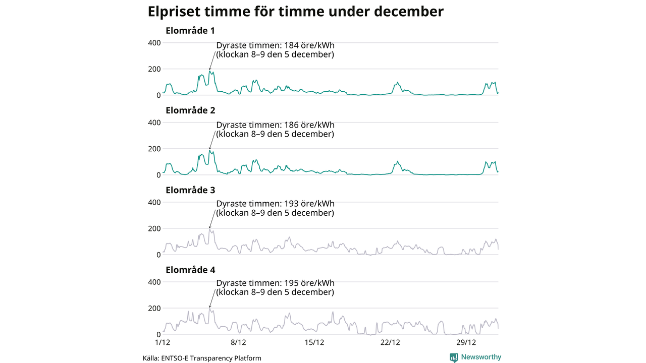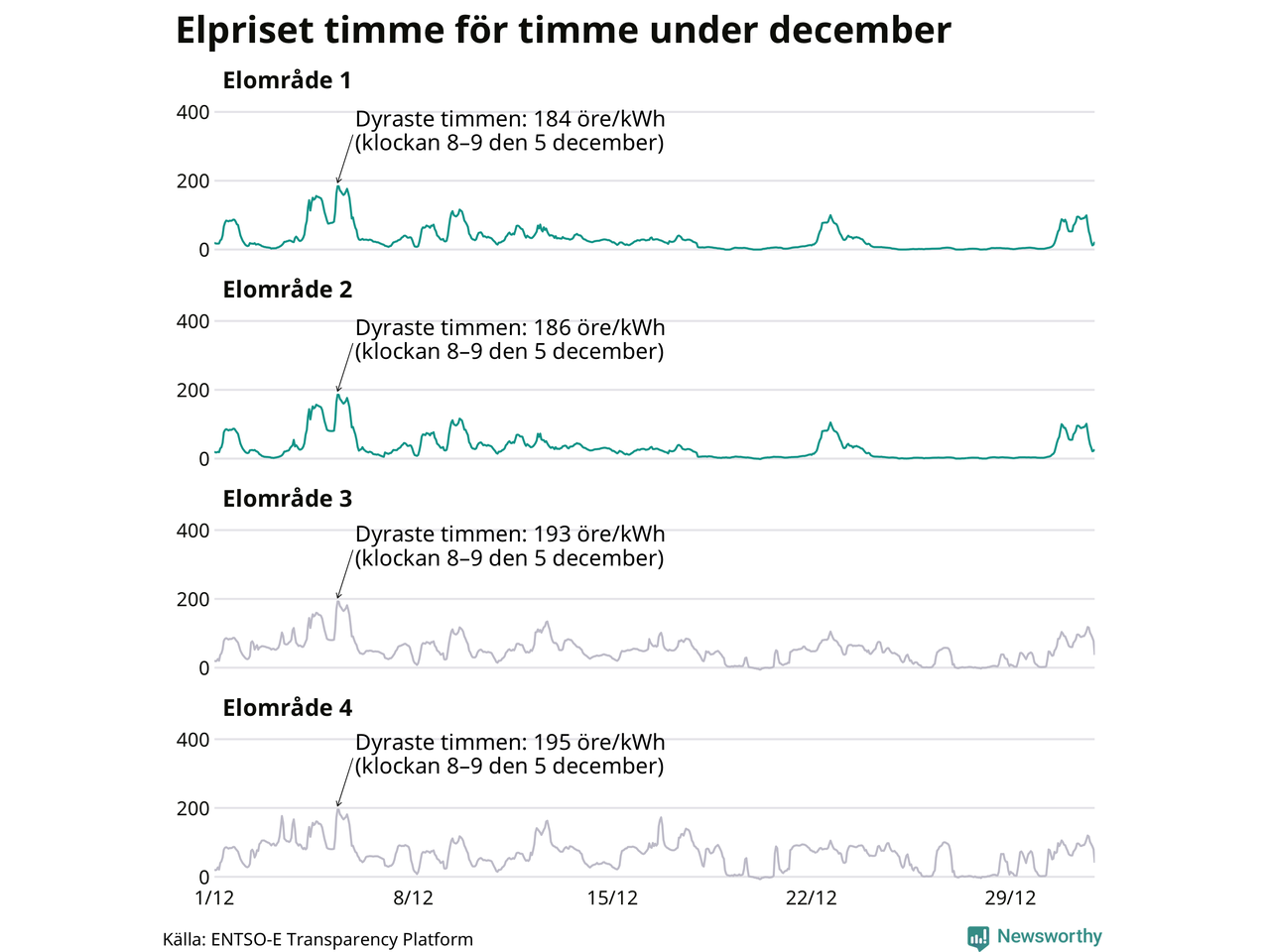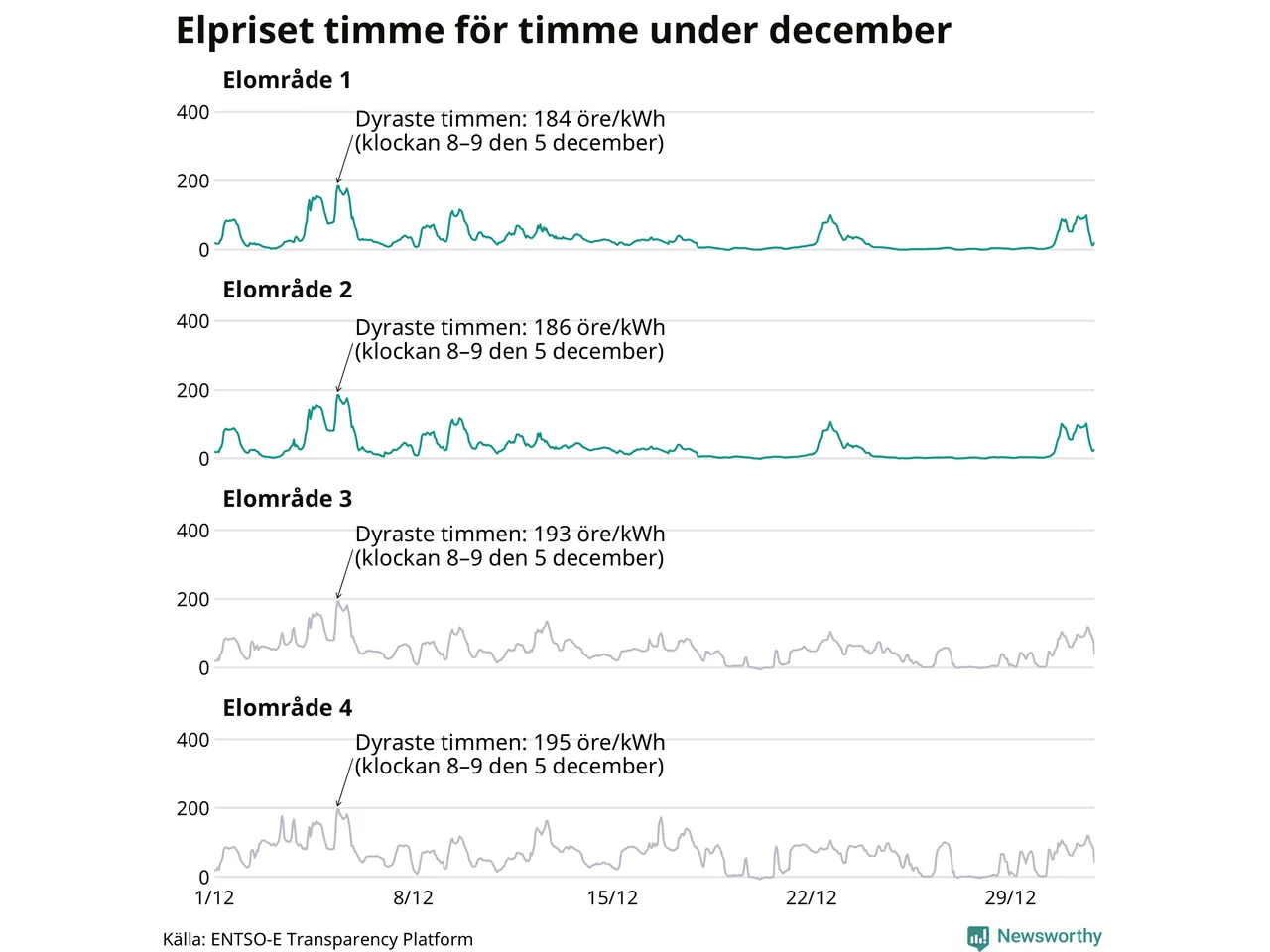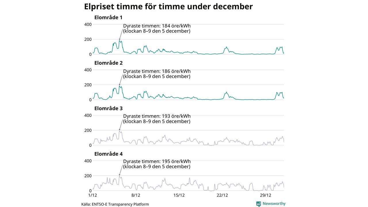 Det är inte bara prisskillnaderna mellan prisområdena som har ökat de senaste åren, även inom områdena pendlar priserna timme för timme – och skillnaderna mellan de dyraste och billigaste timmarna har blivit större sedan 2020. Dyraste timmen i december i elområde 2 inträffade mellan klockan 7 och 8 den 5 december, då kostade en kilowattimme 186 öre. Som lägst var priset i området −1 öre. I elområde 1 toppade priset samtidigt på 184 öre per kilowattimme. Som lägst kostade elen i området 0 öre per kilowattimme.