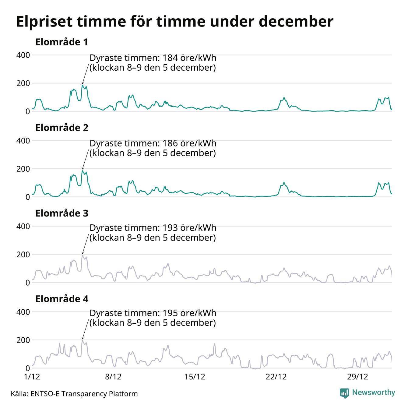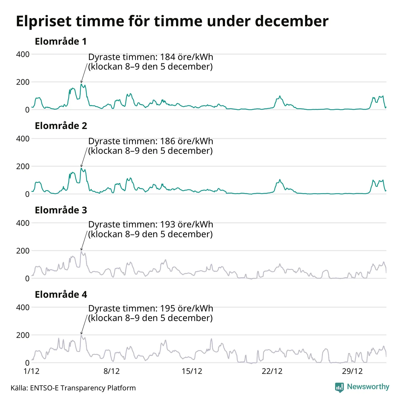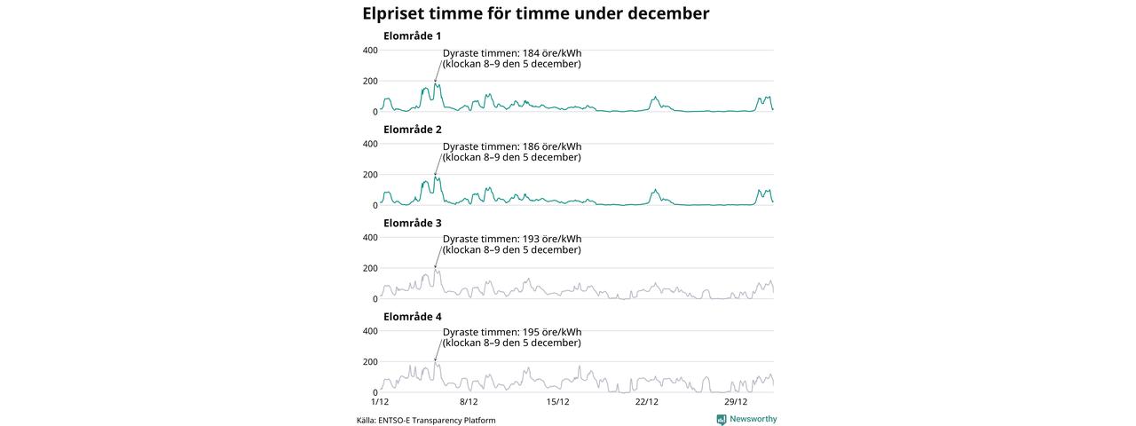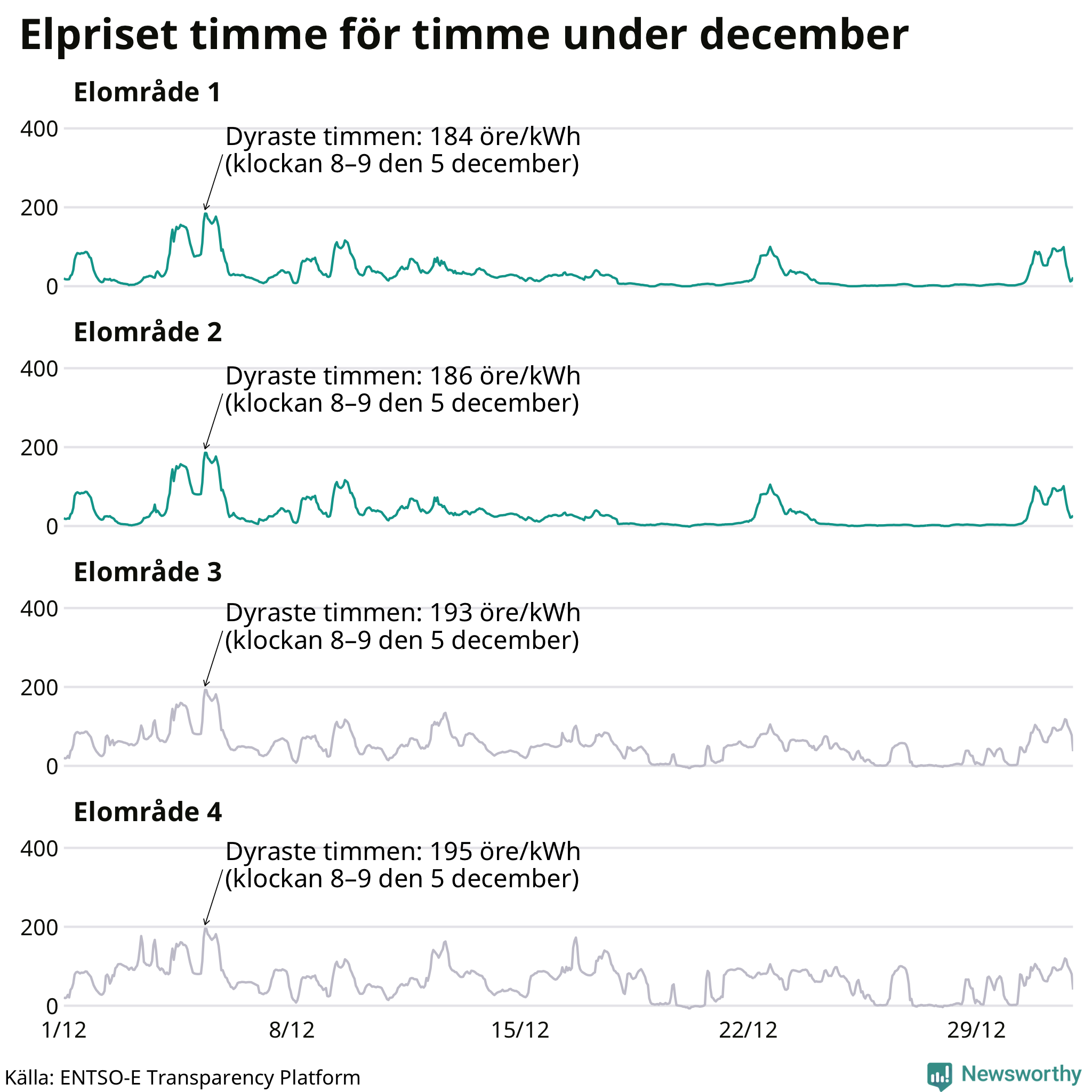 Det är inte bara prisskillnaderna mellan prisområdena som har ökat de senaste åren, även inom områdena pendlar priserna timme för timme – och skillnaderna mellan de dyraste och billigaste timmarna har blivit större sedan 2020. Dyraste timmen i december i elområde 2 inträffade mellan klockan 7 och 8 den 5 december, då kostade en kilowattimme 186 öre. Som lägst var priset i området −1 öre. I elområde 1 toppade priset samtidigt på 184 öre per kilowattimme. Som lägst kostade elen i området 0 öre per kilowattimme.