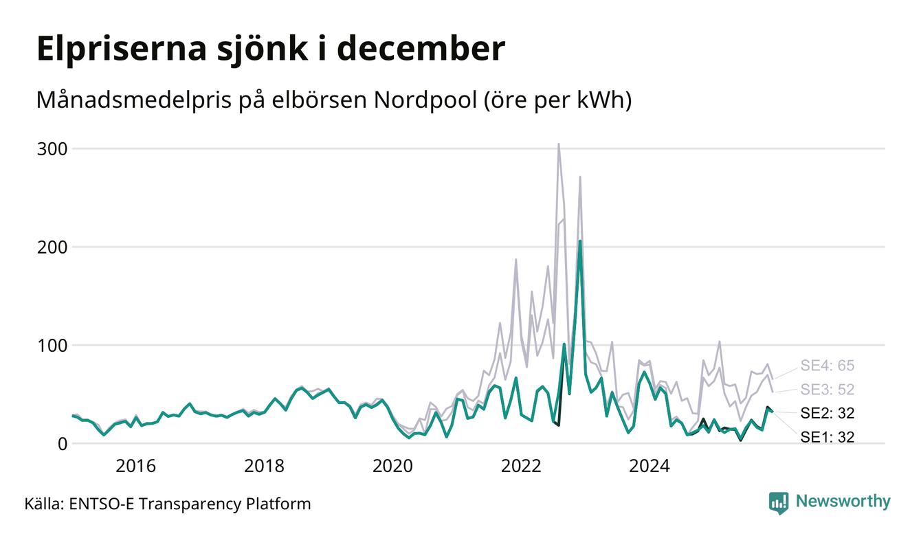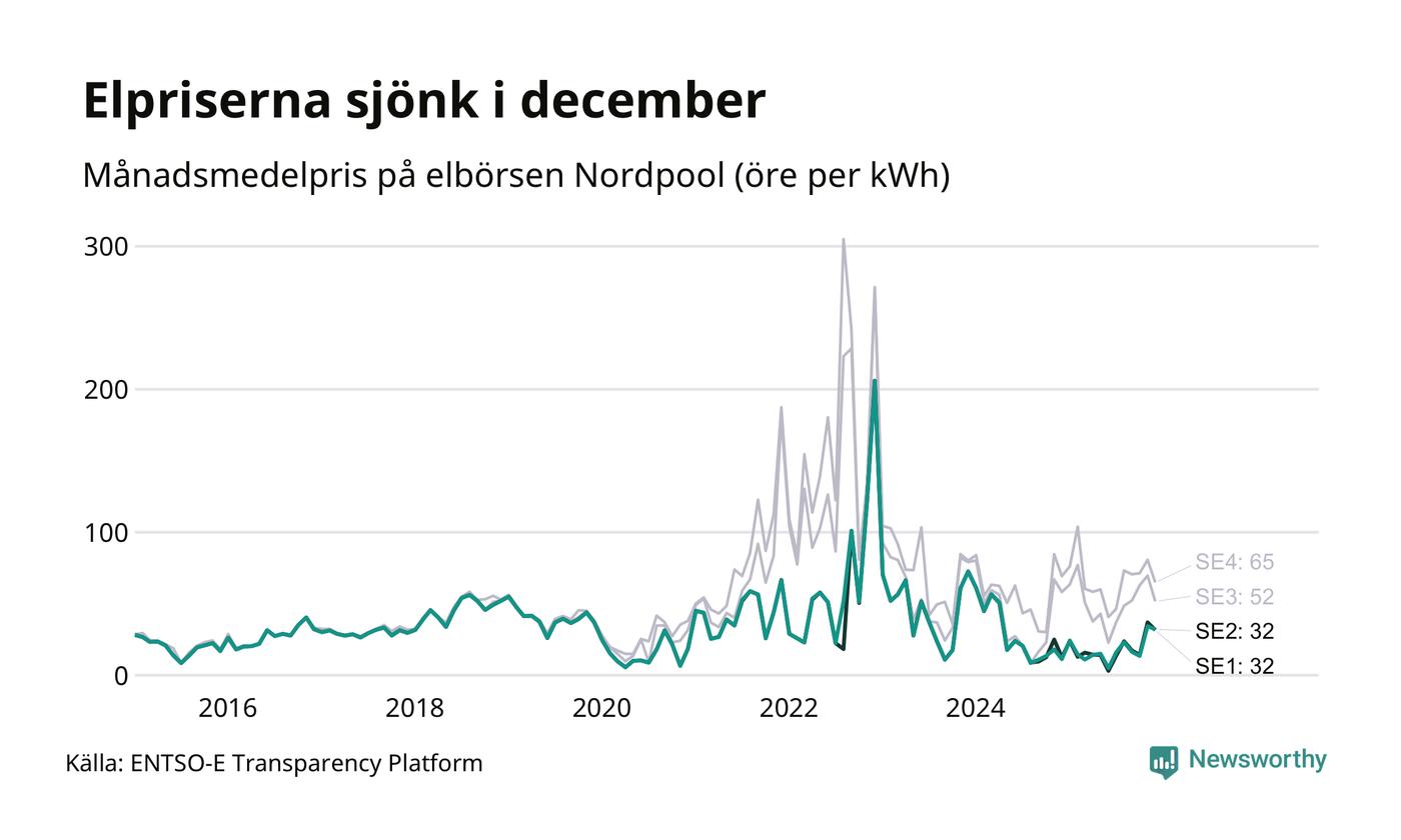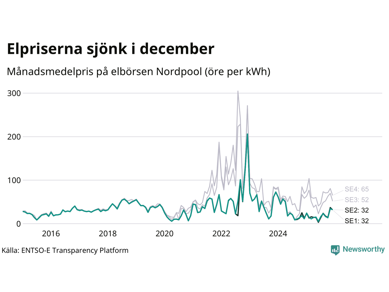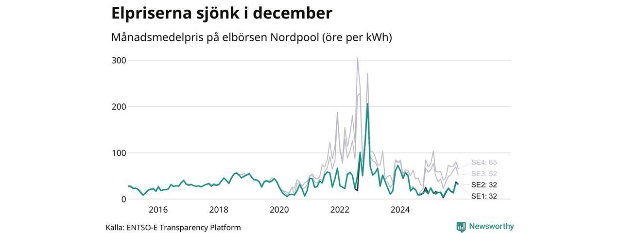 Umeå kommun tillhör två elområden, tätorten Umeå ligger i elområde 2, medan till exempel Botsmark tillhör elområde 1. Spotpriset – alltså priset som elbolagen köper in elen för – minskade i båda områdena i december: I båda elområdena landande månadsmedelpriset per kilowattimme på 32 öre. Motsvarande priser i november var 34 öre (elområde 2) och 37 öre per kilowattimme (elområde 1). Rekordnoteringarna för områdena är på 206 öre per kilowattimme. De noterades i december 2022. För ett år sedan, i december 2024, var snittpriset 11 öre per kilowattimme i elområde 2 och 13 öre per kilowattimme i elområde 1.