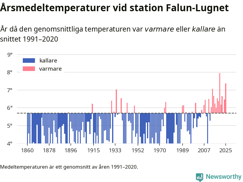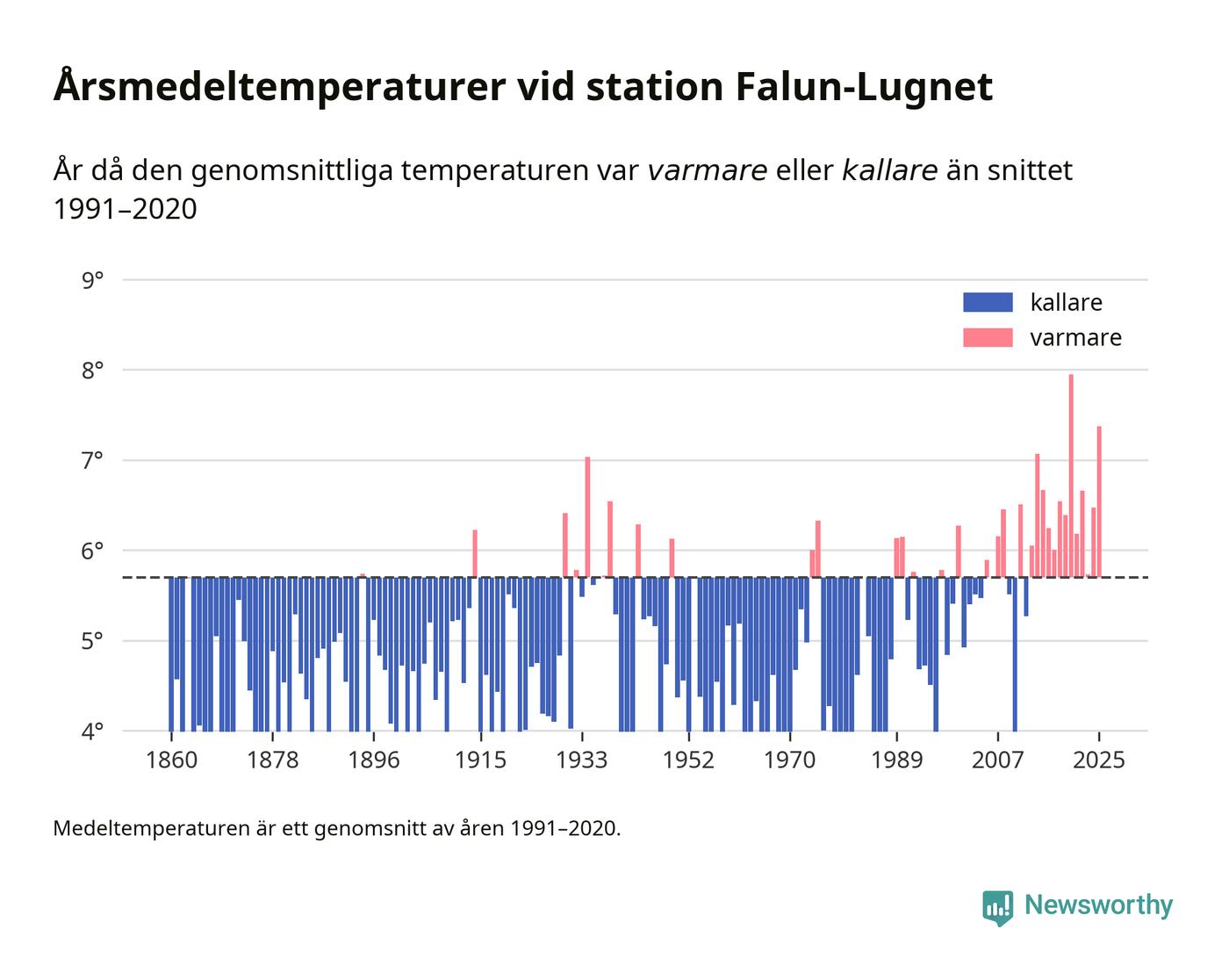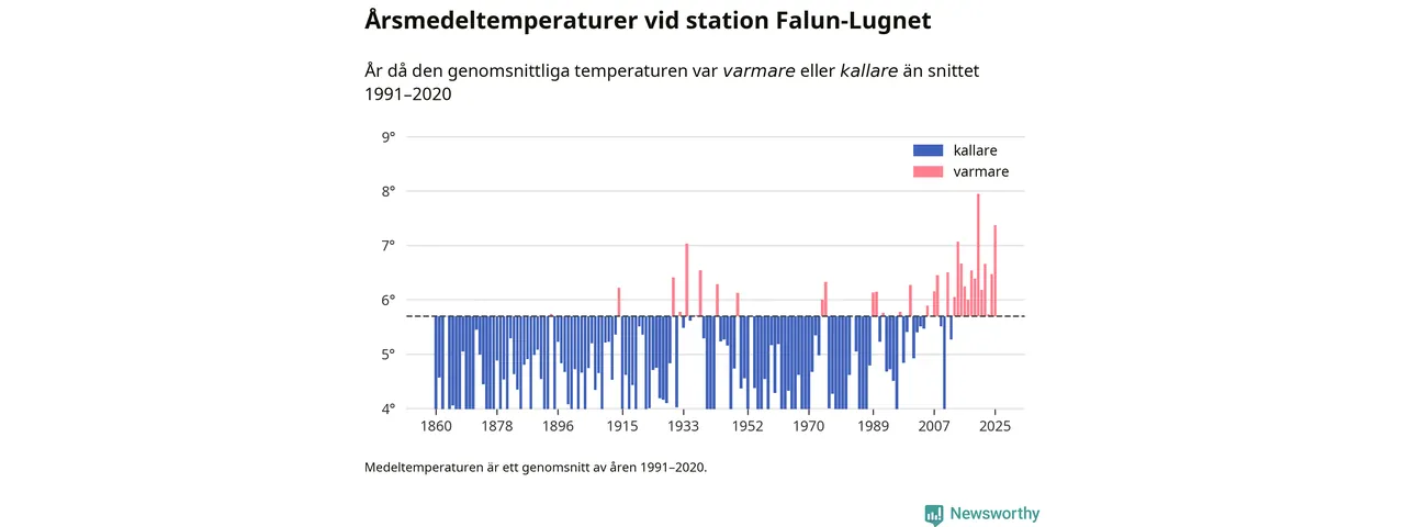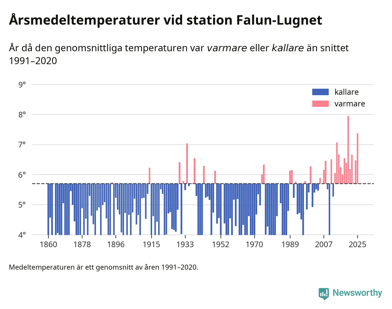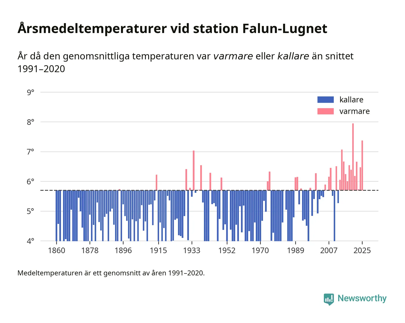 Årsmedeltemperaturen vid Falun-Lugnet i Falun1 – den enda aktiva, SMHI-anslutna stationen som mäter medeltemperaturer i Falu kommun – var under 2025 7,4 grader, 1,7 grader högre än genomsnittet de senaste decennierna. Det är den näst högsta noteringen sedan 1860, visar Newsworthys beräkningar baserade på delvis preliminär observationsdata från SMHI.