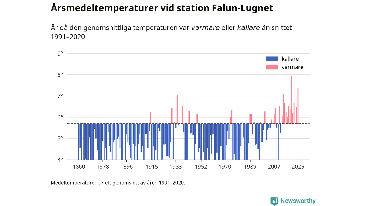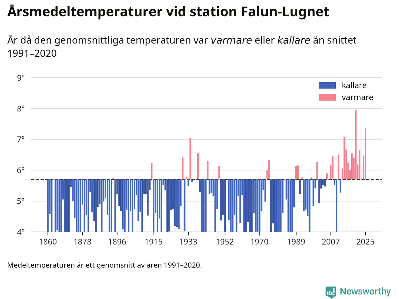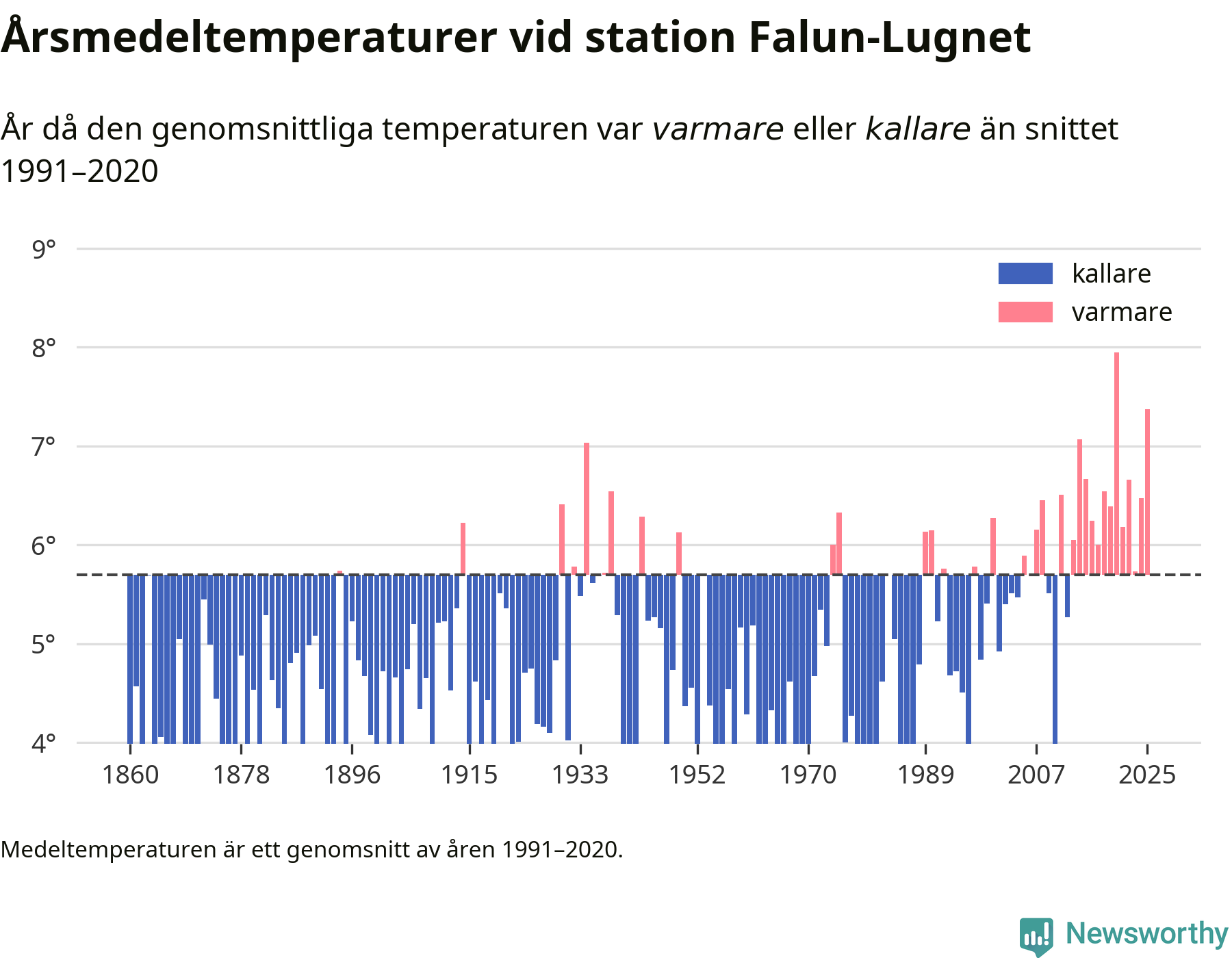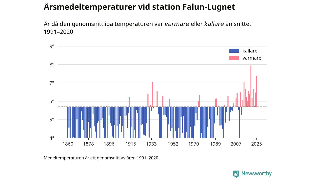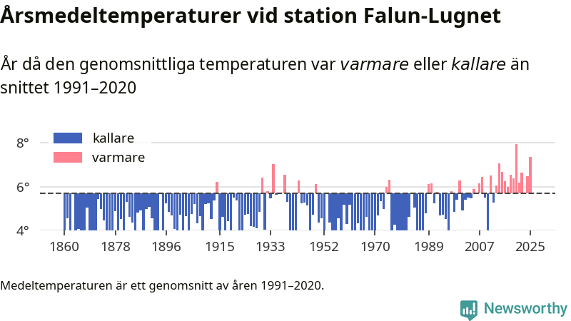 Årsmedeltemperaturen vid Falun-Lugnet i Falun1 – den enda aktiva, SMHI-anslutna stationen som mäter medeltemperaturer i Falu kommun – var under 2025 7,4 grader, 1,7 grader högre än genomsnittet de senaste decennierna. Det är den näst högsta noteringen sedan 1860, visar Newsworthys beräkningar baserade på delvis preliminär observationsdata från SMHI.
