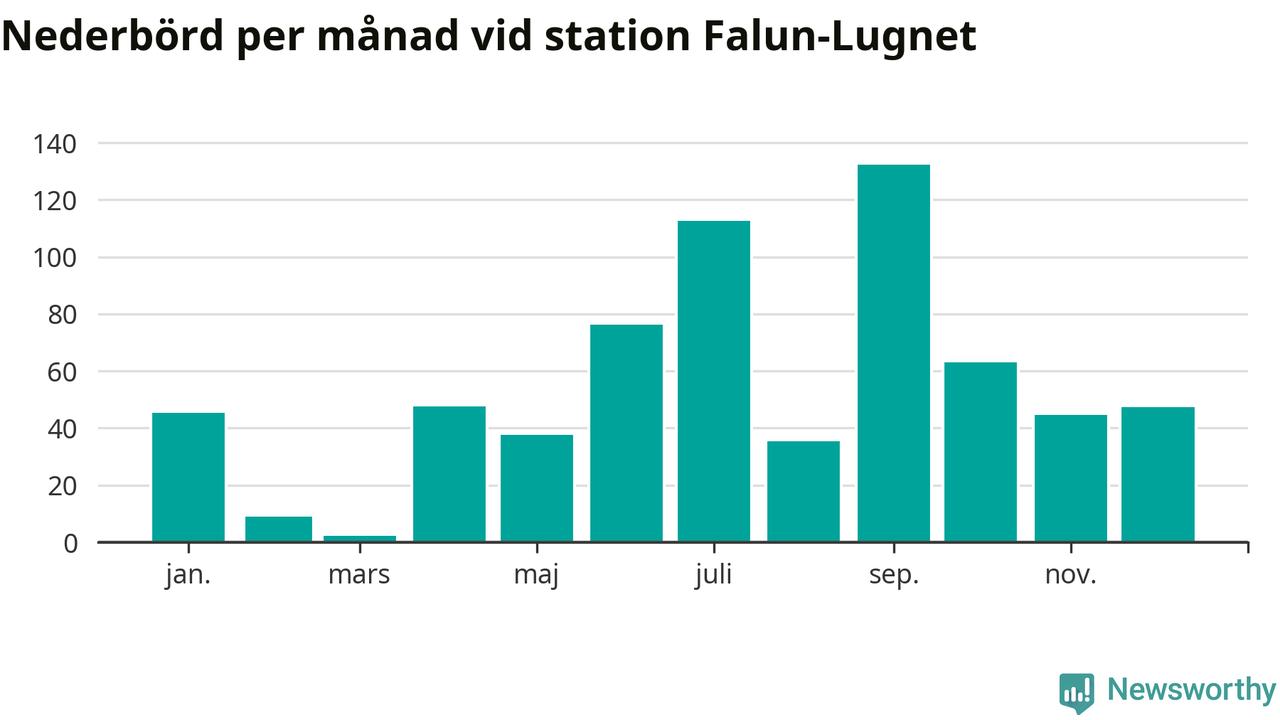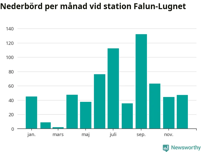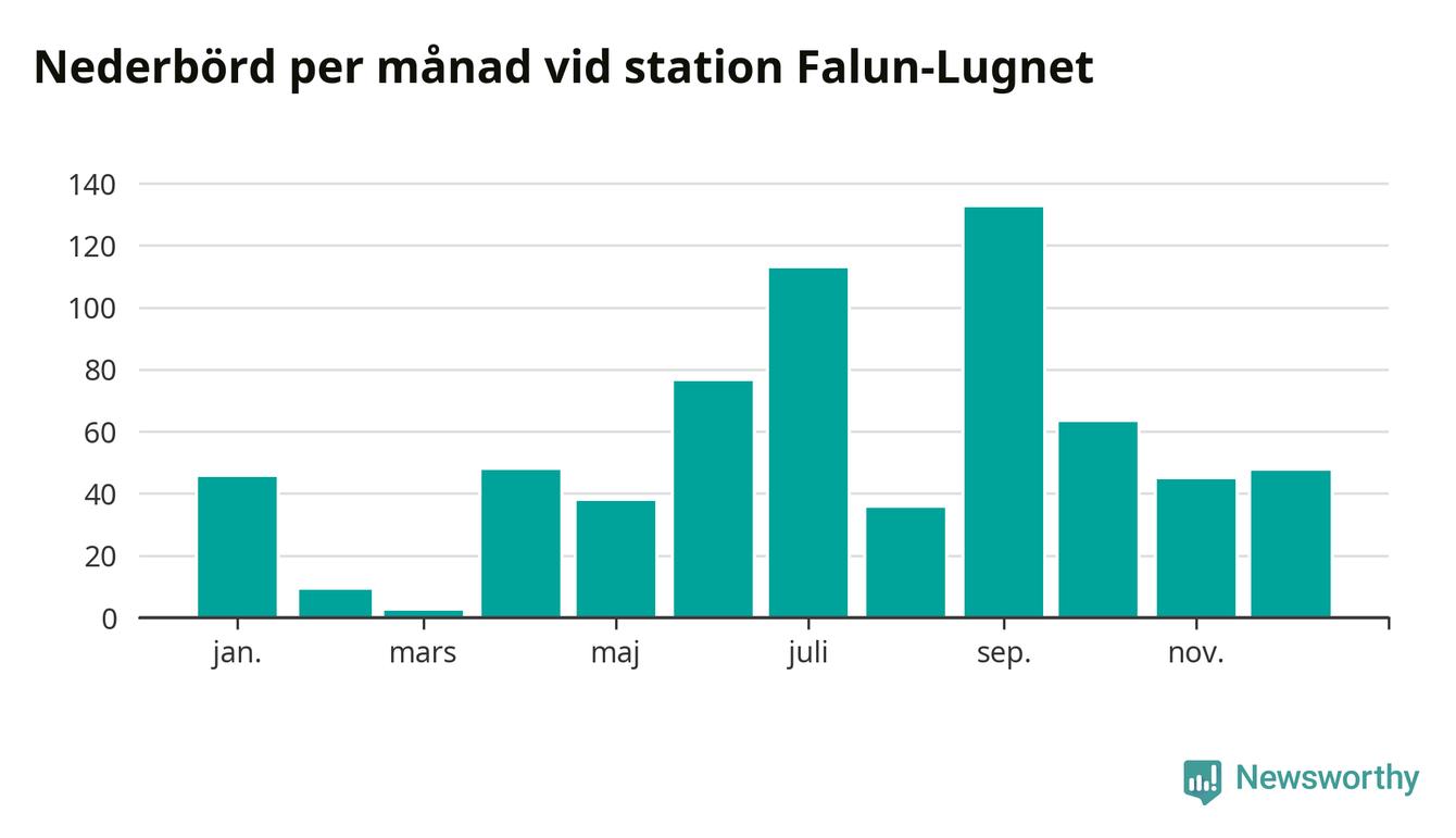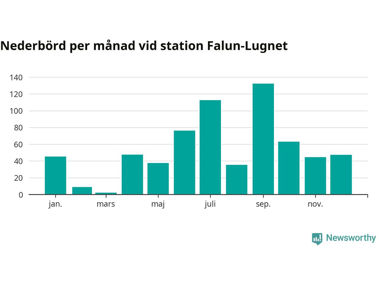 Nederbördsmässigt var 2025 ett blötare år än vanligt vid Falun-Lugnet. Totalt föll 653 millimeter nederbörd vid stationen, att jämföra med de senaste tre decenniernas genomsnitt på 585 millimeter. Månaden med mest nederbörd var september, med 132 millimeter.