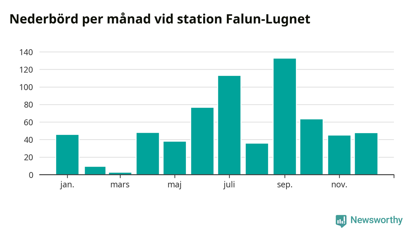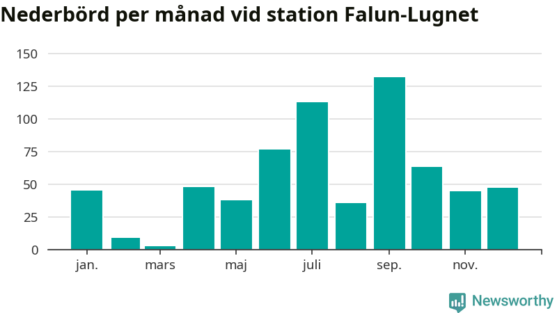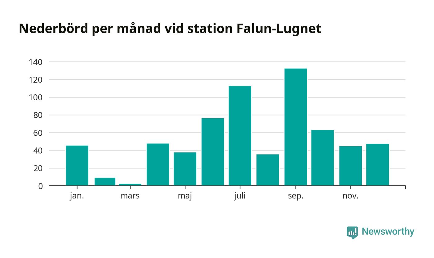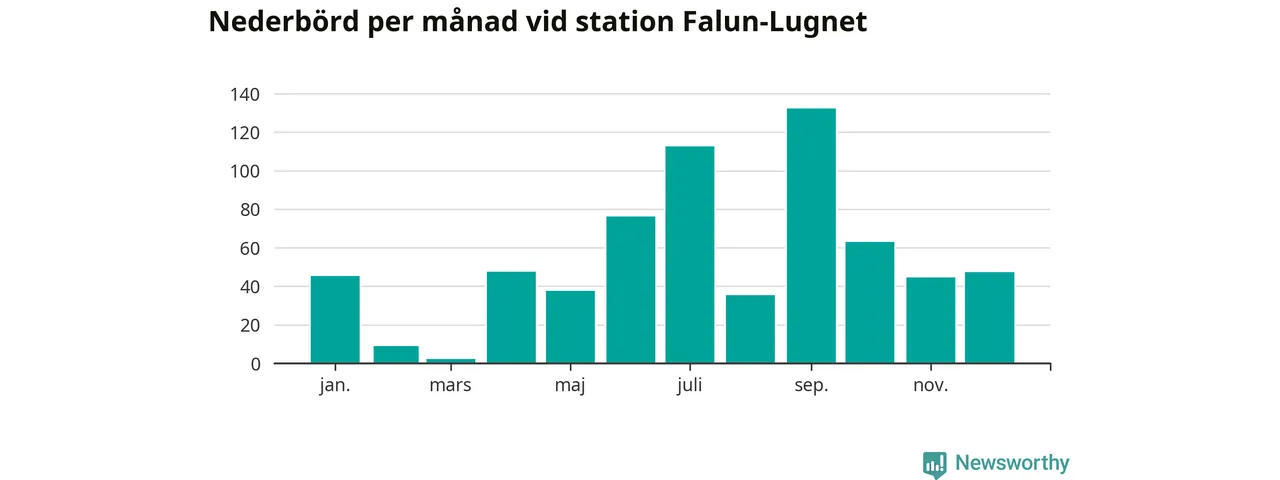 Nederbördsmässigt var 2025 ett blötare år än vanligt vid Falun-Lugnet. Totalt föll 653 millimeter nederbörd vid stationen, att jämföra med de senaste tre decenniernas genomsnitt på 585 millimeter. Månaden med mest nederbörd var september, med 132 millimeter.