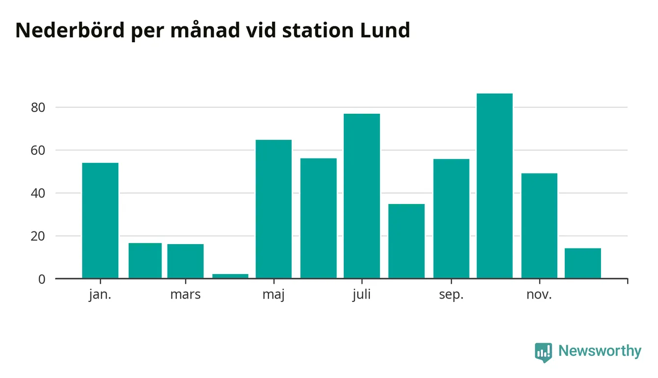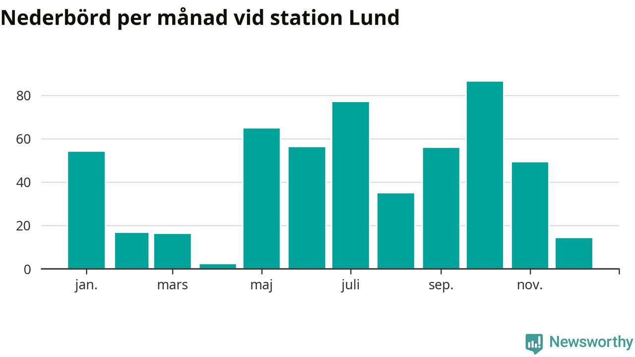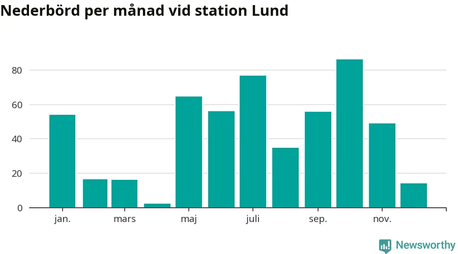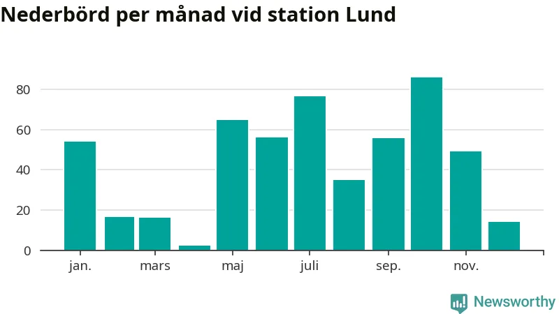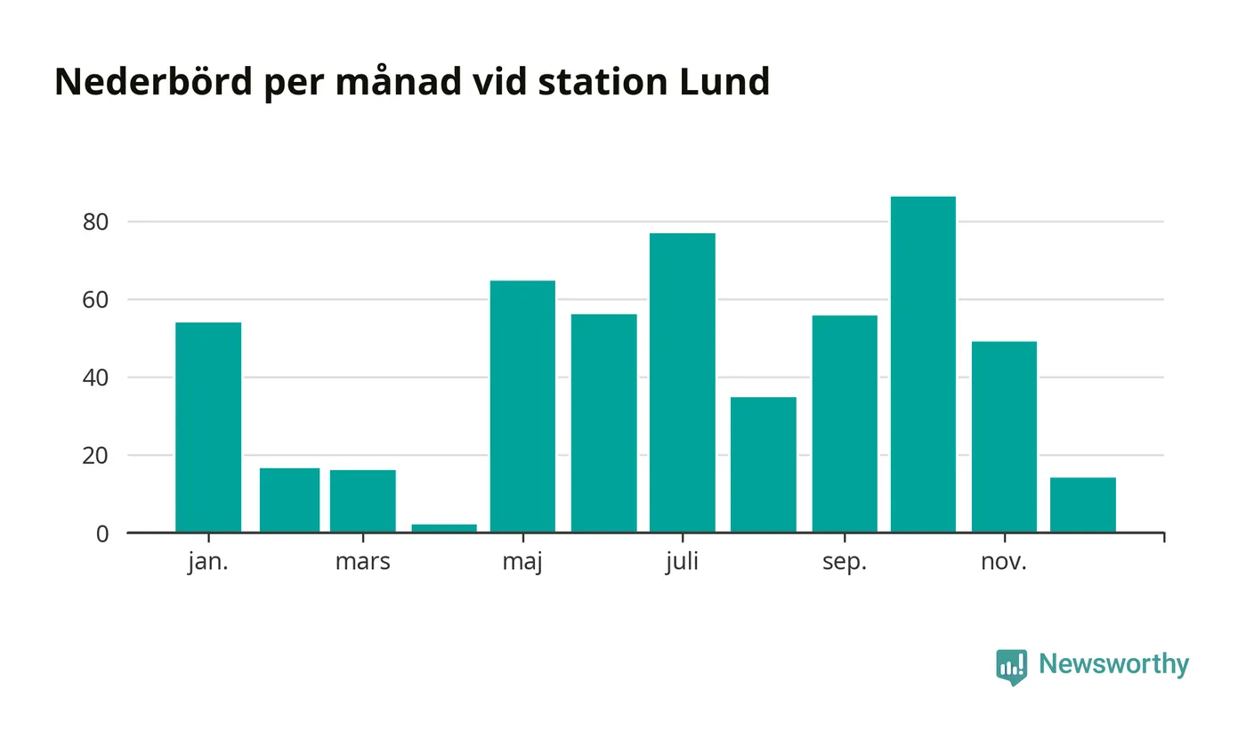 Nederbördsmässigt var 2025 ett torrare år än vanligt vid Lund. Totalt föll 526 millimeter nederbörd vid stationen, att jämföra med de senaste tre decenniernas genomsnitt på 676 millimeter. Månaden med mest nederbörd var oktober, med 86 millimeter.