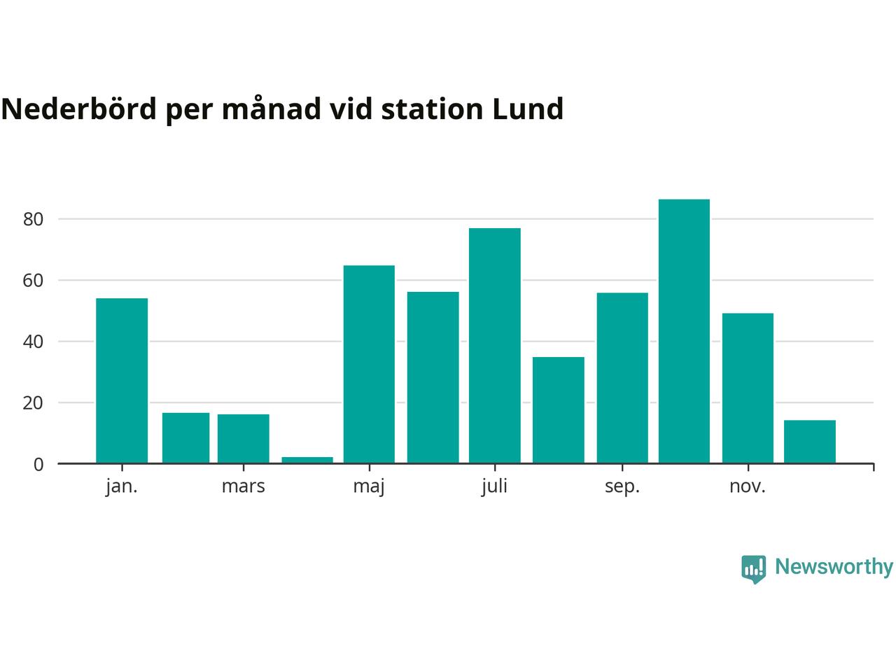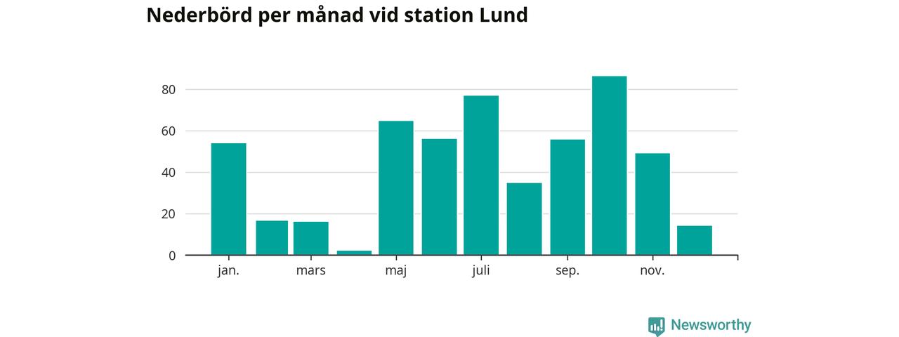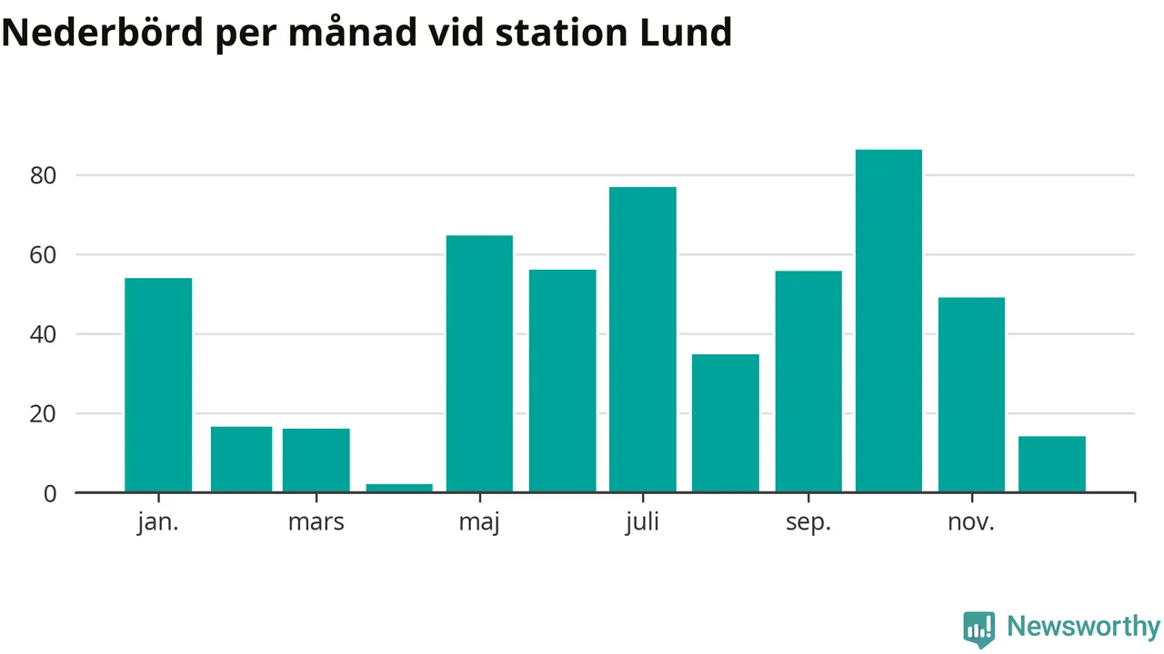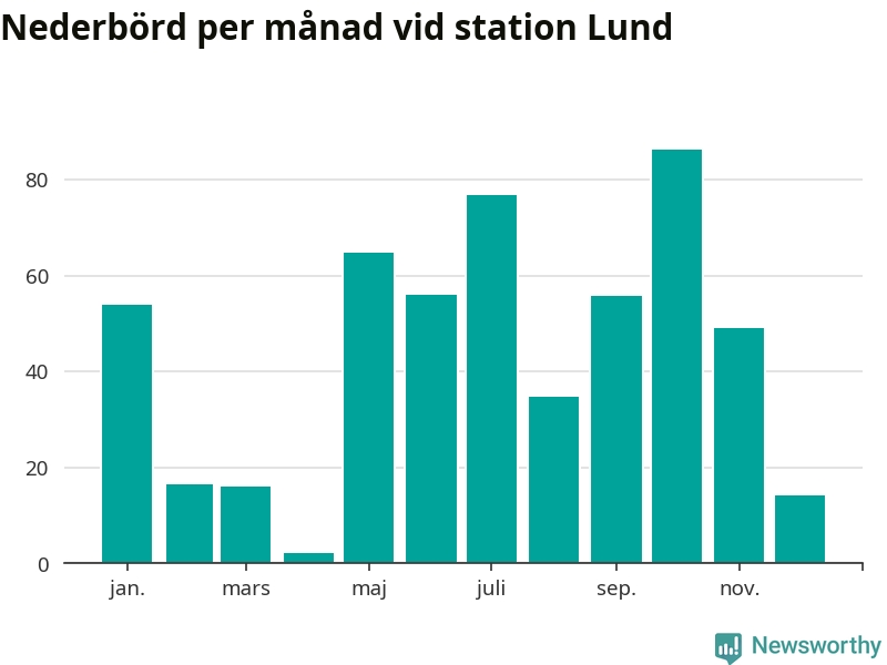 Nederbördsmässigt var 2025 ett torrare år än vanligt vid Lund. Totalt föll 526 millimeter nederbörd vid stationen, att jämföra med de senaste tre decenniernas genomsnitt på 676 millimeter. Månaden med mest nederbörd var oktober, med 86 millimeter.