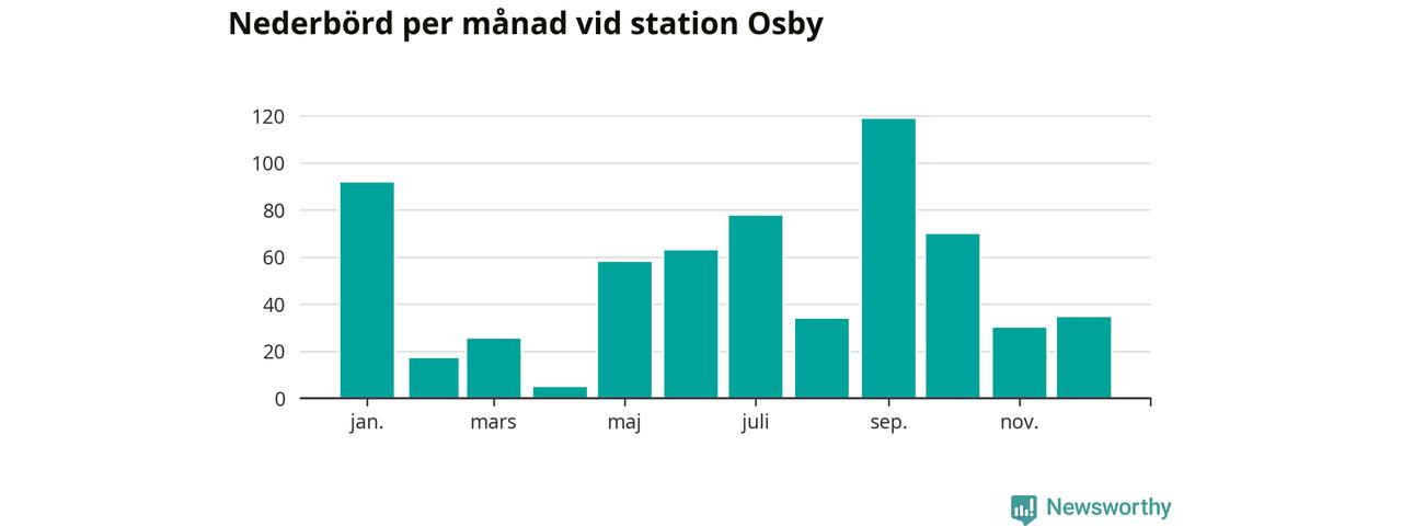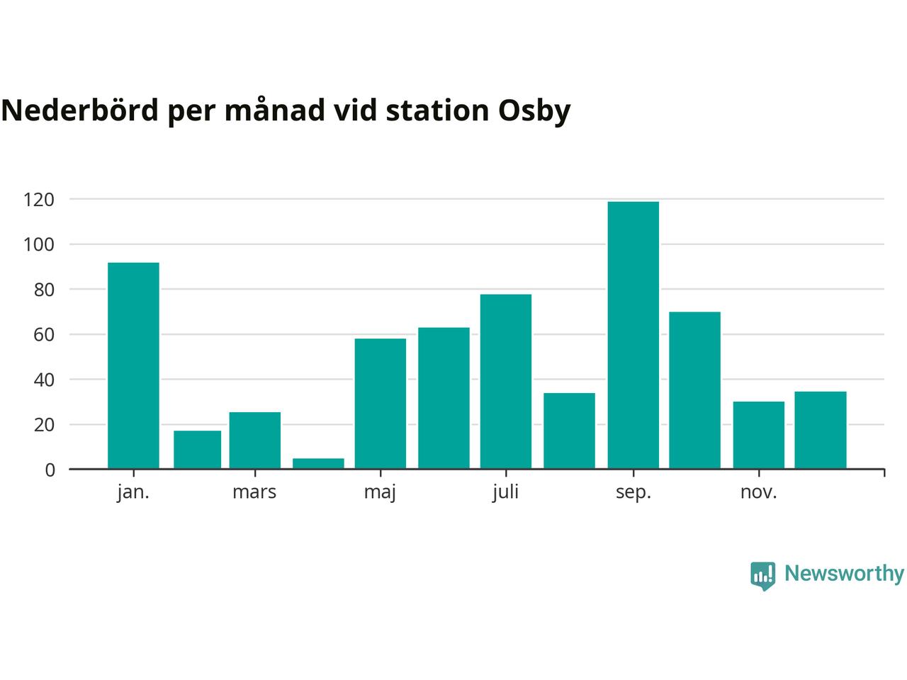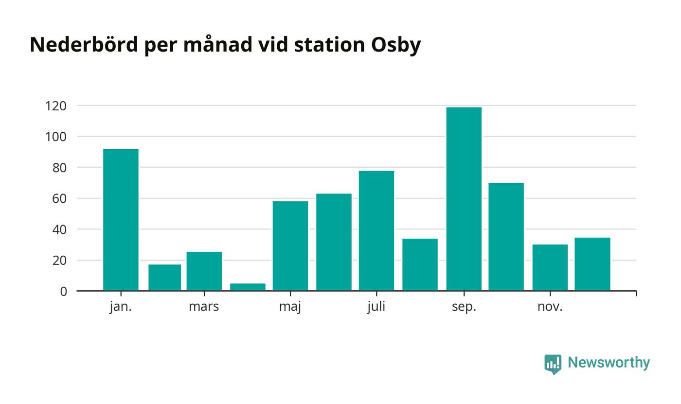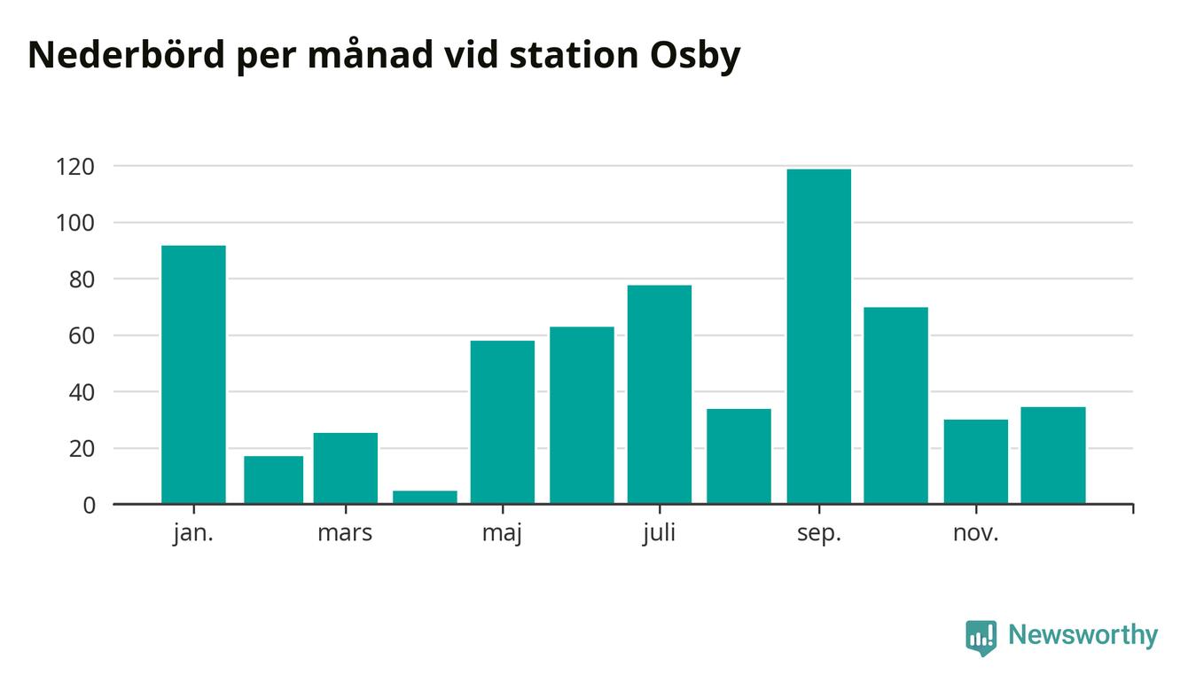 Nederbördsmässigt var 2025 ett torrare år än vanligt vid Osby. Totalt föll 623 millimeter nederbörd vid stationen, att jämföra med de senaste tre decenniernas genomsnitt på 787 millimeter. Månaden med mest nederbörd var september, med 119 millimeter.