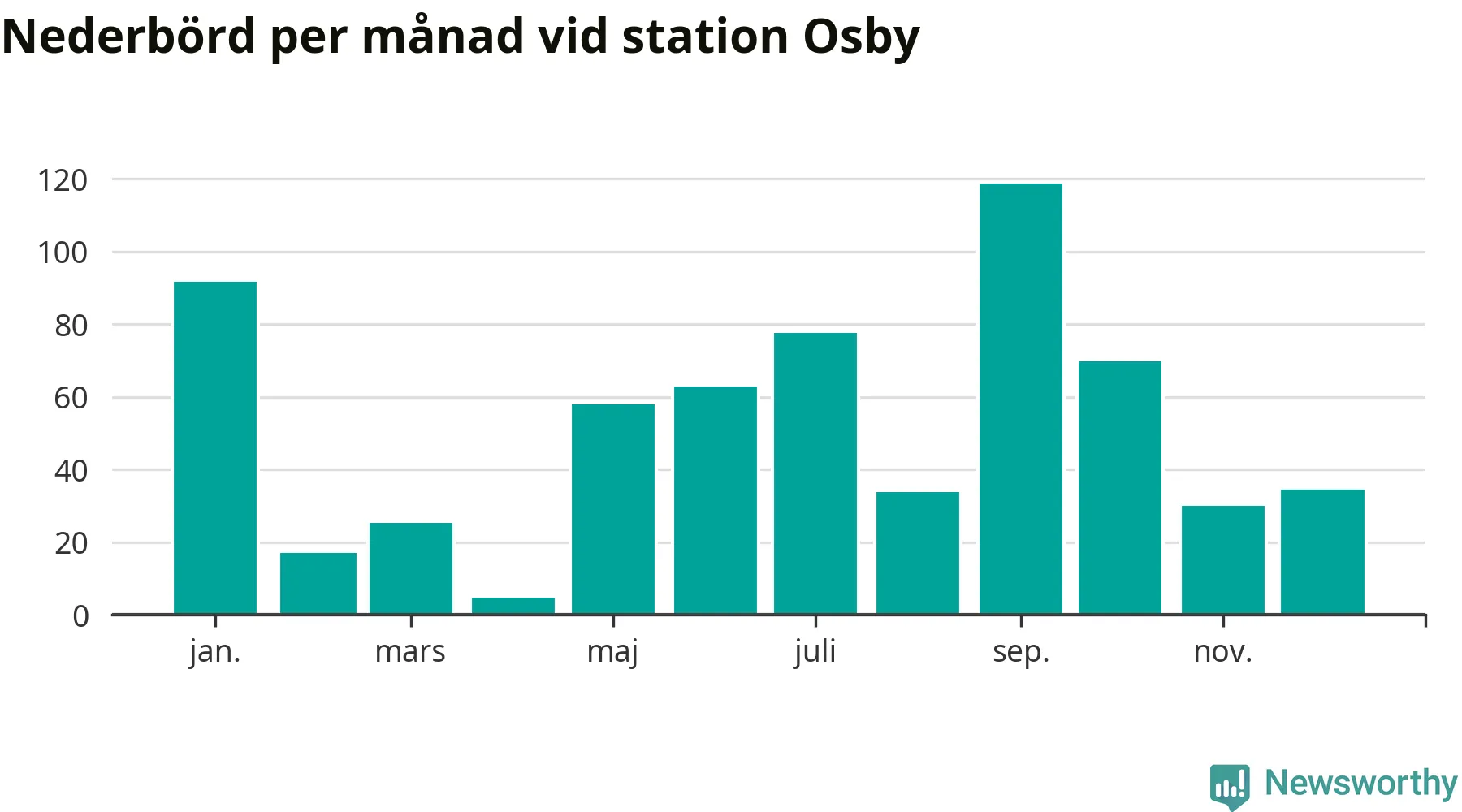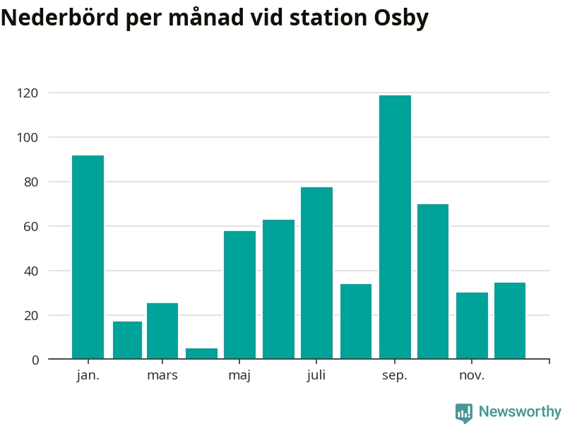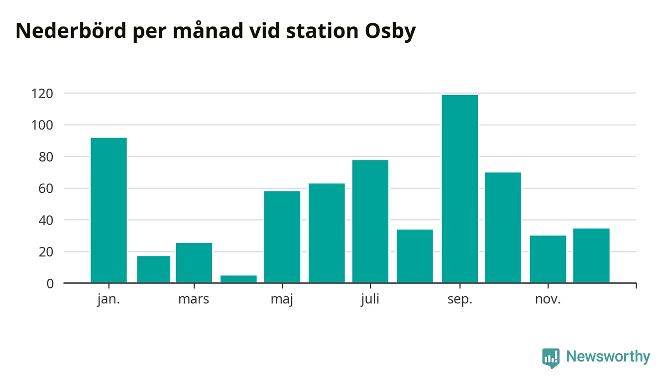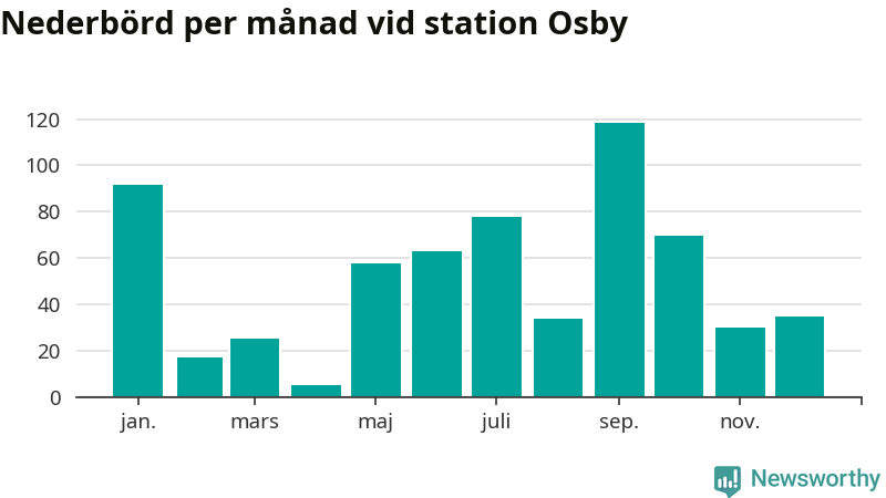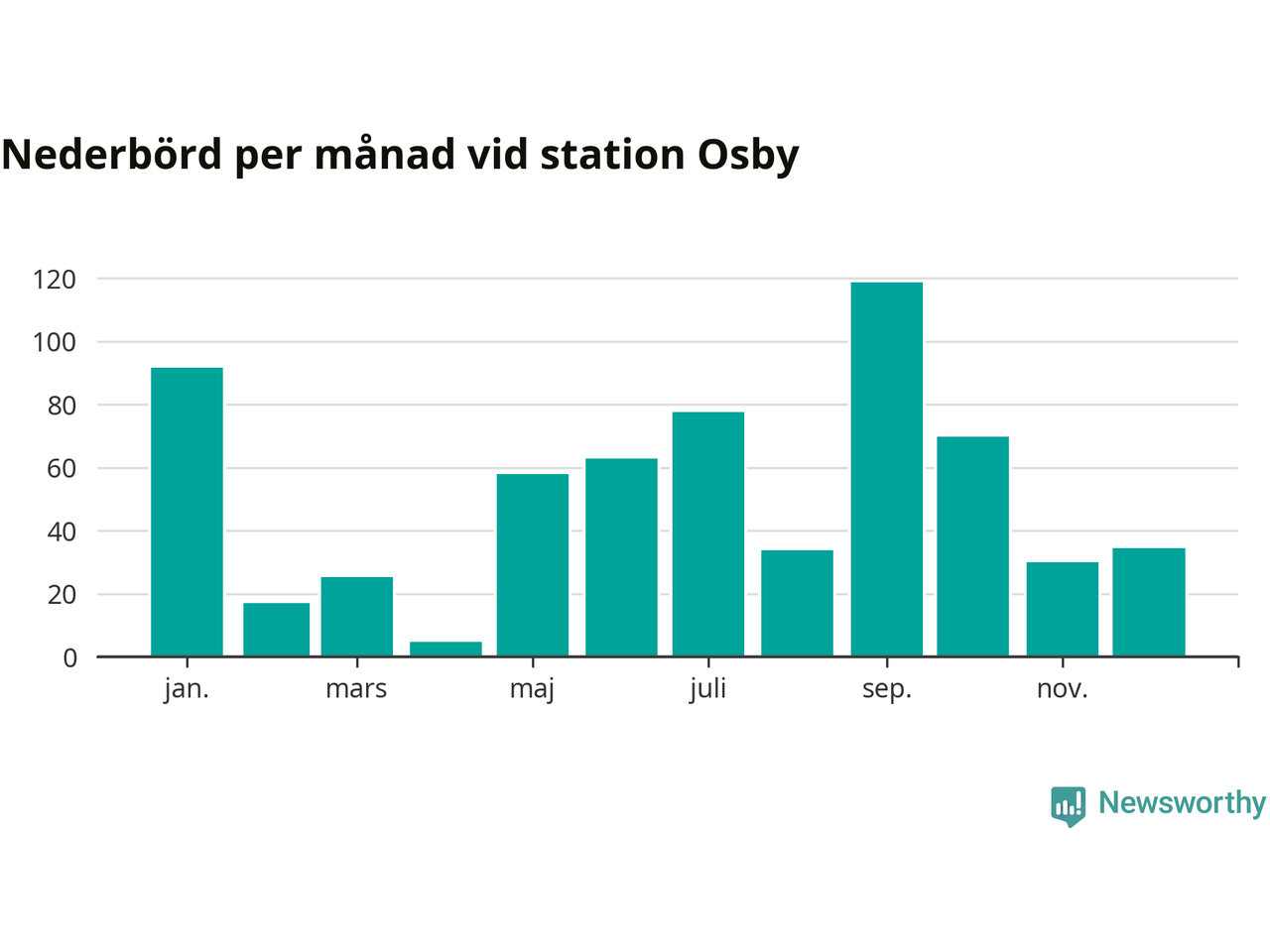 Nederbördsmässigt var 2025 ett torrare år än vanligt vid Osby. Totalt föll 623 millimeter nederbörd vid stationen, att jämföra med de senaste tre decenniernas genomsnitt på 787 millimeter. Månaden med mest nederbörd var september, med 119 millimeter.