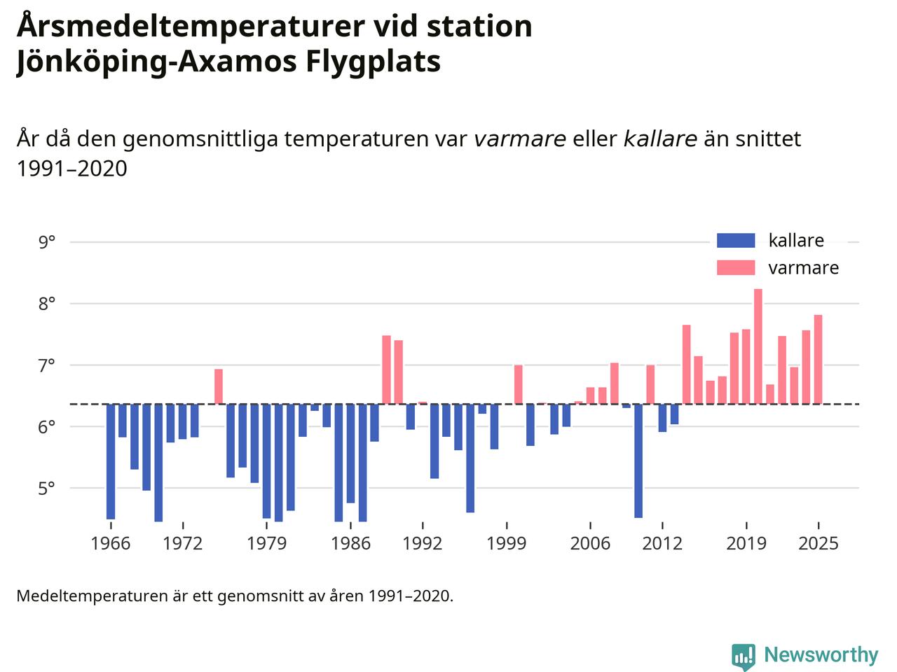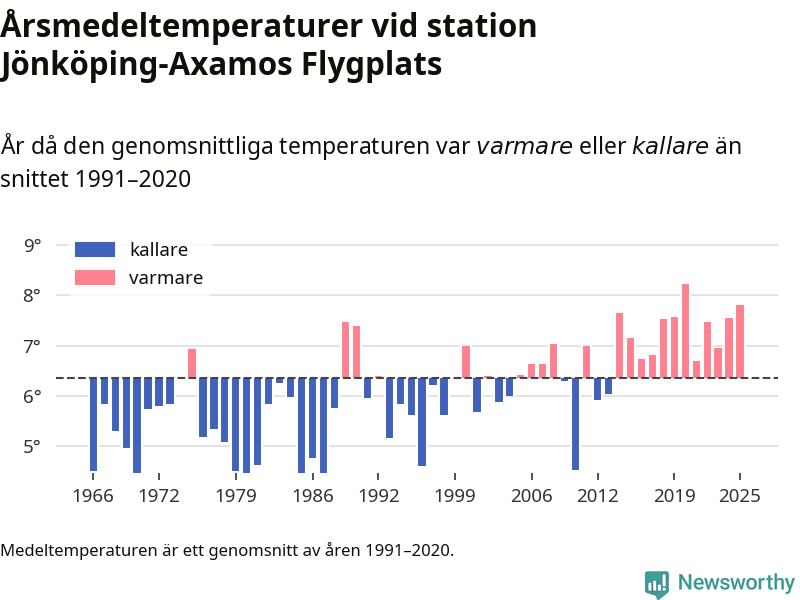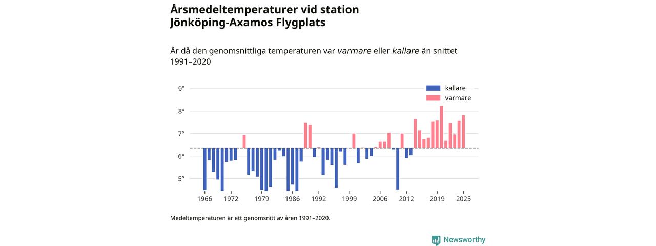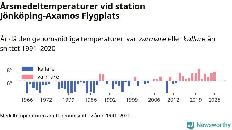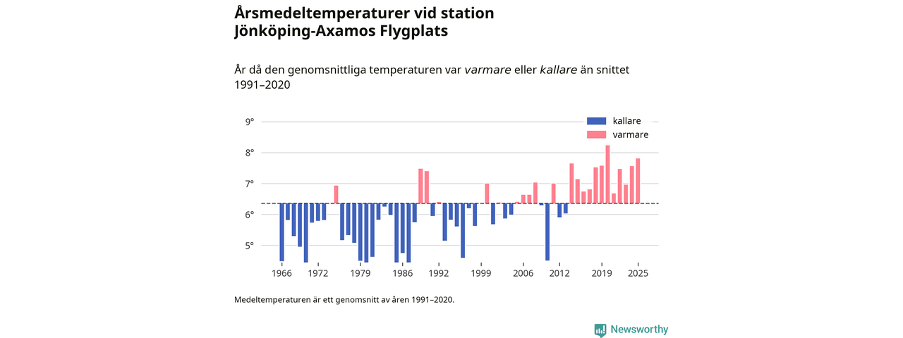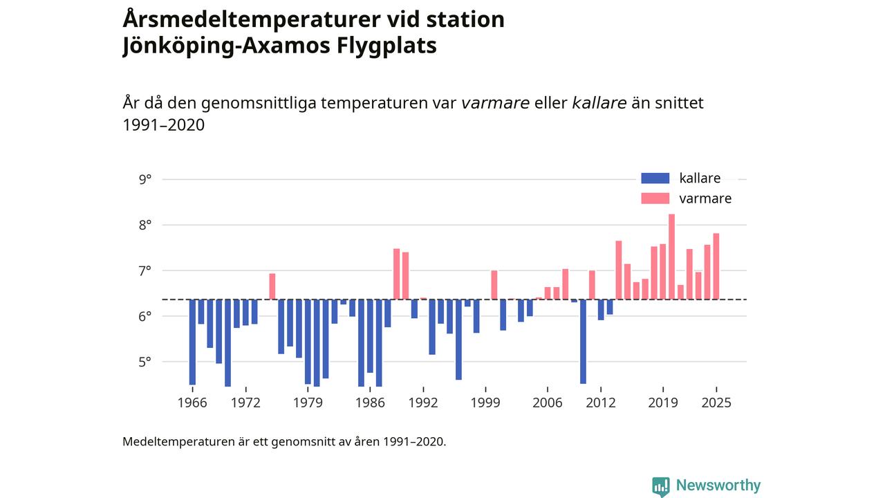 Årsmedeltemperaturen vid Jönköping-Axamos Flygplats sju kilometer sydväst om centrala Jönköping var under 2025 7,8 grader, 1,4 grader högre än genomsnittet de senaste decennierna. Det är den näst högsta noteringen sedan 1966, visar Newsworthys beräkningar baserade på delvis preliminär observationsdata från SMHI.