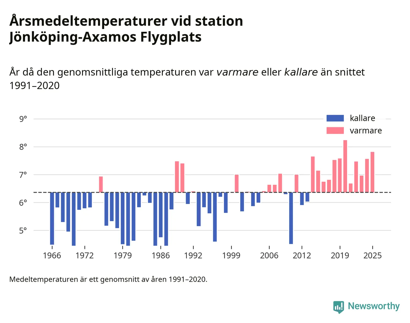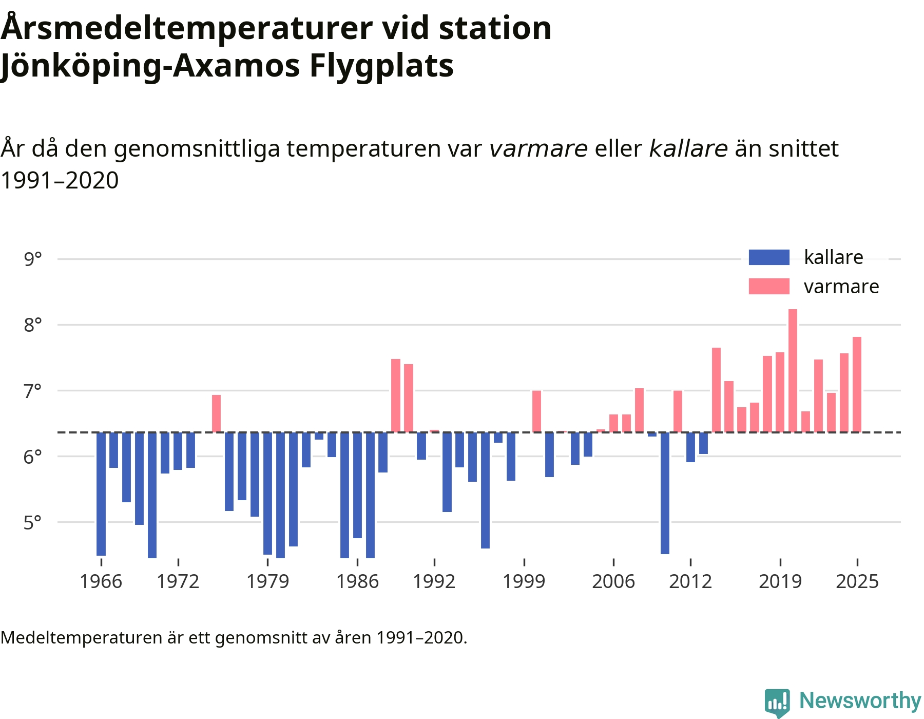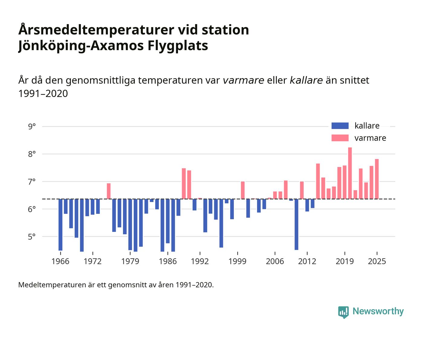 Årsmedeltemperaturen vid Jönköping-Axamos Flygplats sju kilometer sydväst om centrala Jönköping var under 2025 7,8 grader, 1,4 grader högre än genomsnittet de senaste decennierna. Det är den näst högsta noteringen sedan 1966, visar Newsworthys beräkningar baserade på delvis preliminär observationsdata från SMHI.