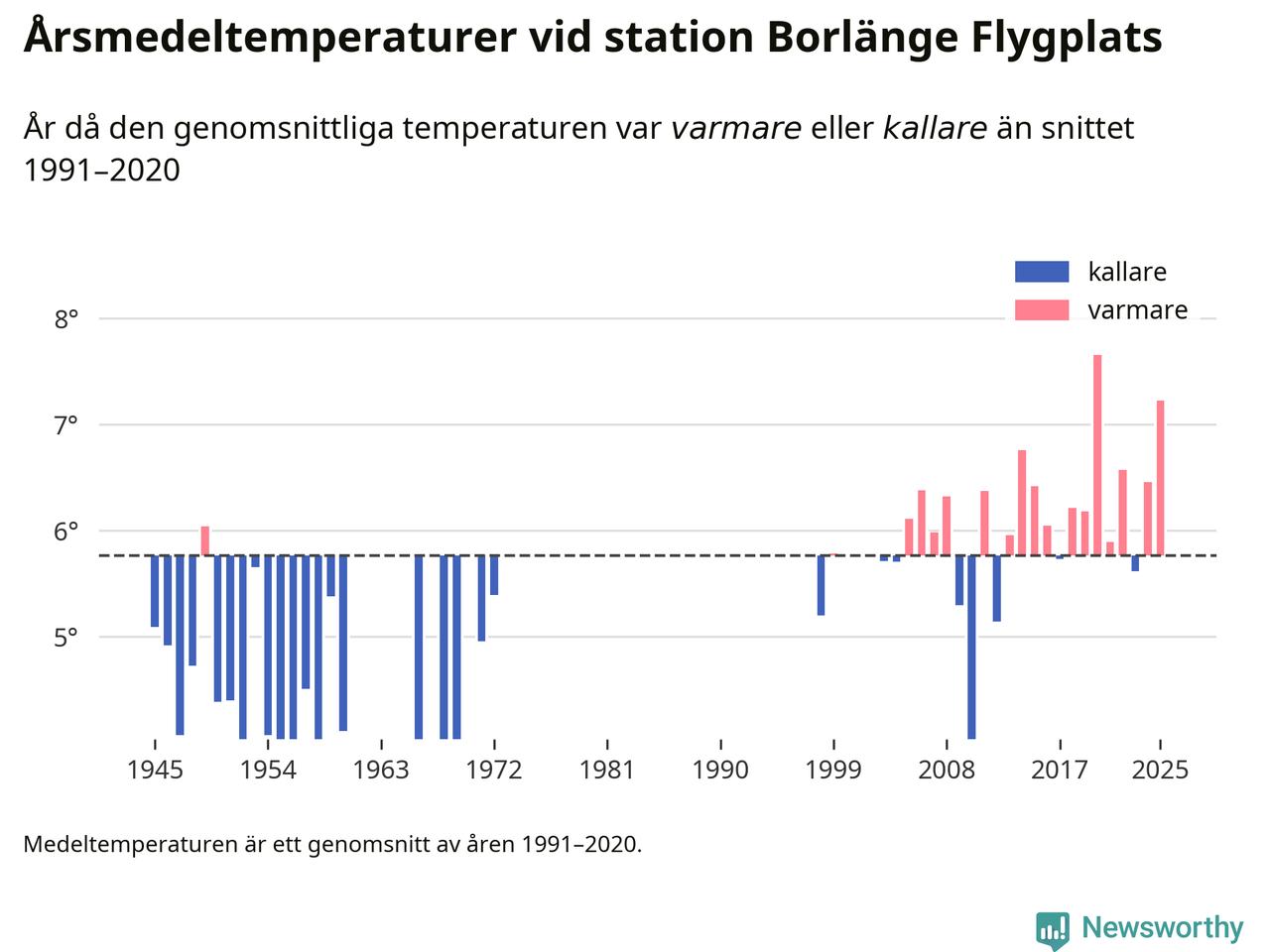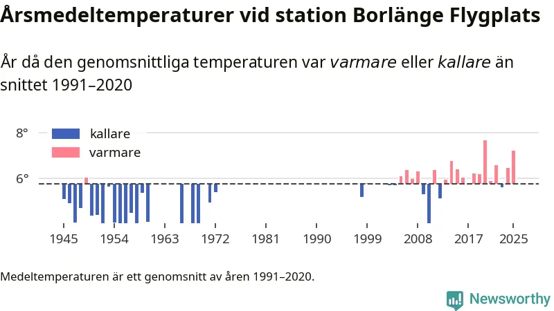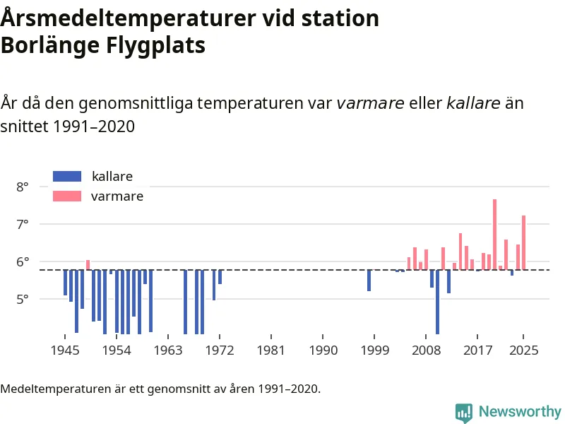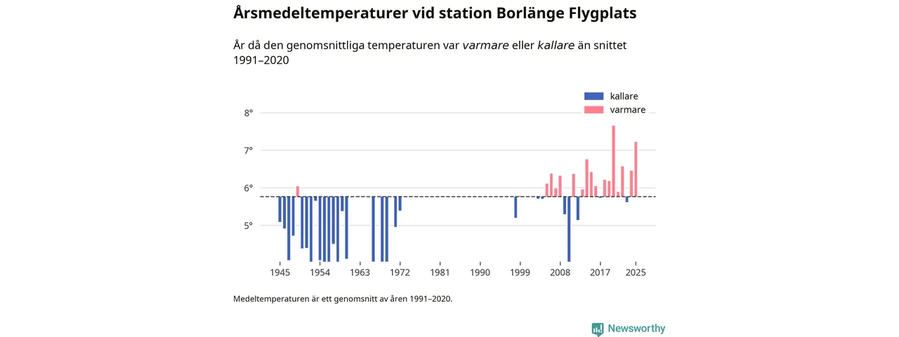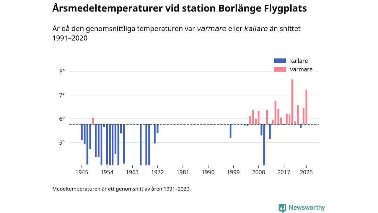 Årsmedeltemperaturen vid Borlänge Flygplats åtta kilometer sydöst om centrala Borlänge1 var under 2025 7,2 grader, 1,5 grader högre än genomsnittet de senaste decennierna. Det visar Newsworthys beräkningar, som bygger på delvis preliminär observationsdata från SMHI.