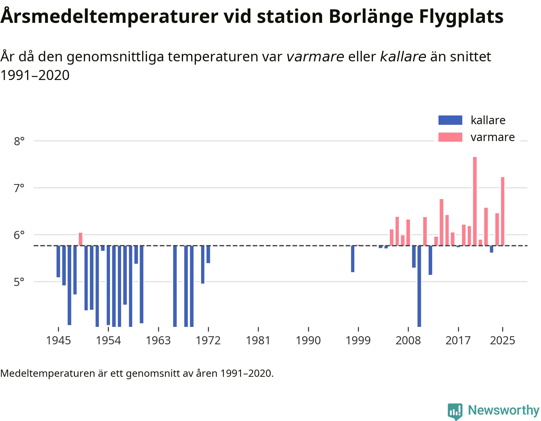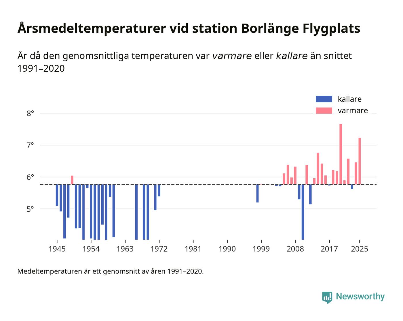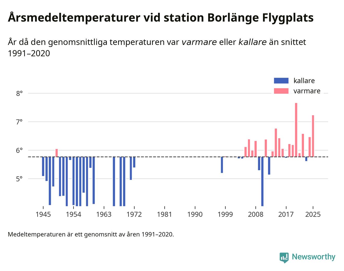 Årsmedeltemperaturen vid Borlänge Flygplats åtta kilometer sydöst om centrala Borlänge1 var under 2025 7,2 grader, 1,5 grader högre än genomsnittet de senaste decennierna. Det visar Newsworthys beräkningar, som bygger på delvis preliminär observationsdata från SMHI.