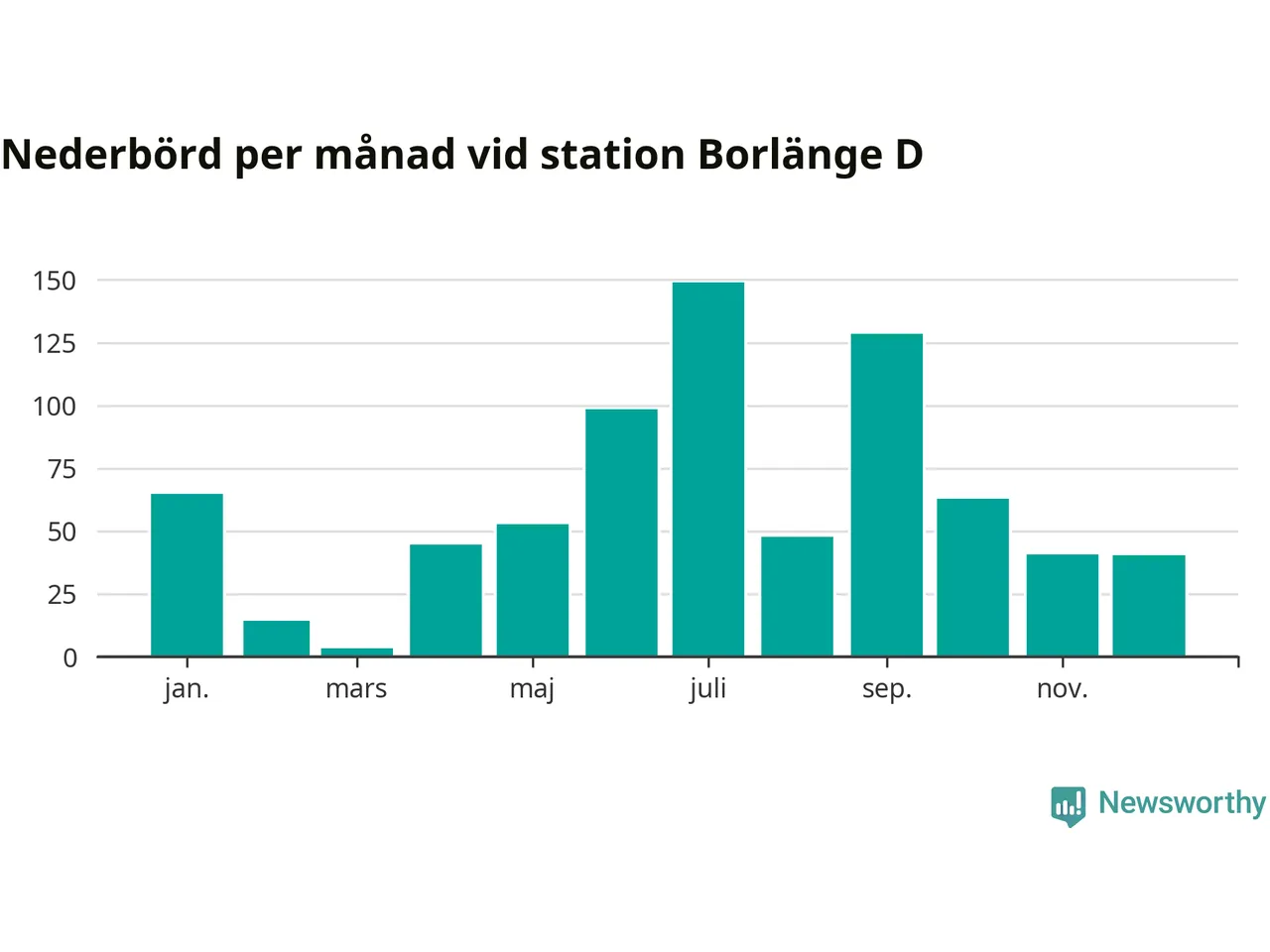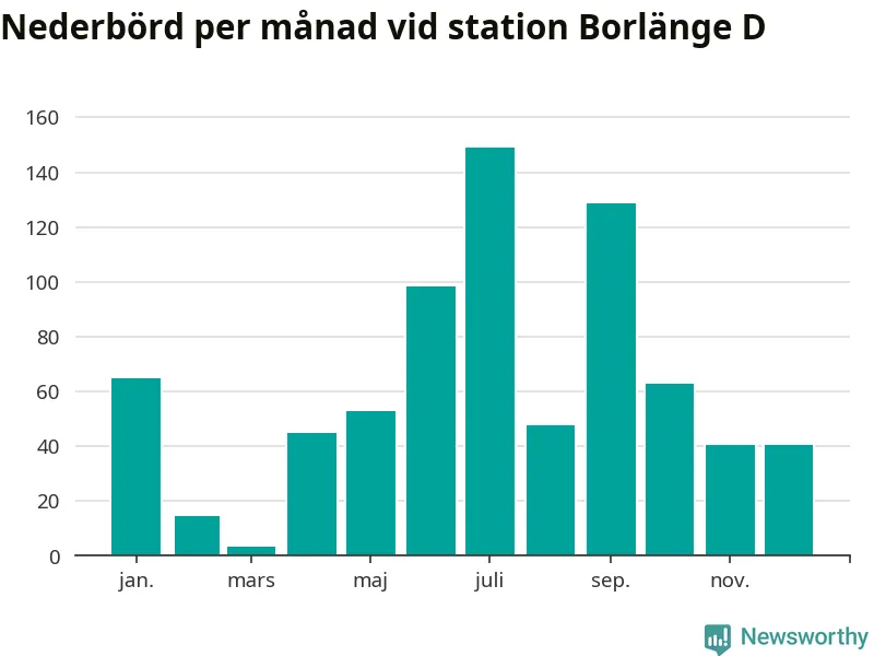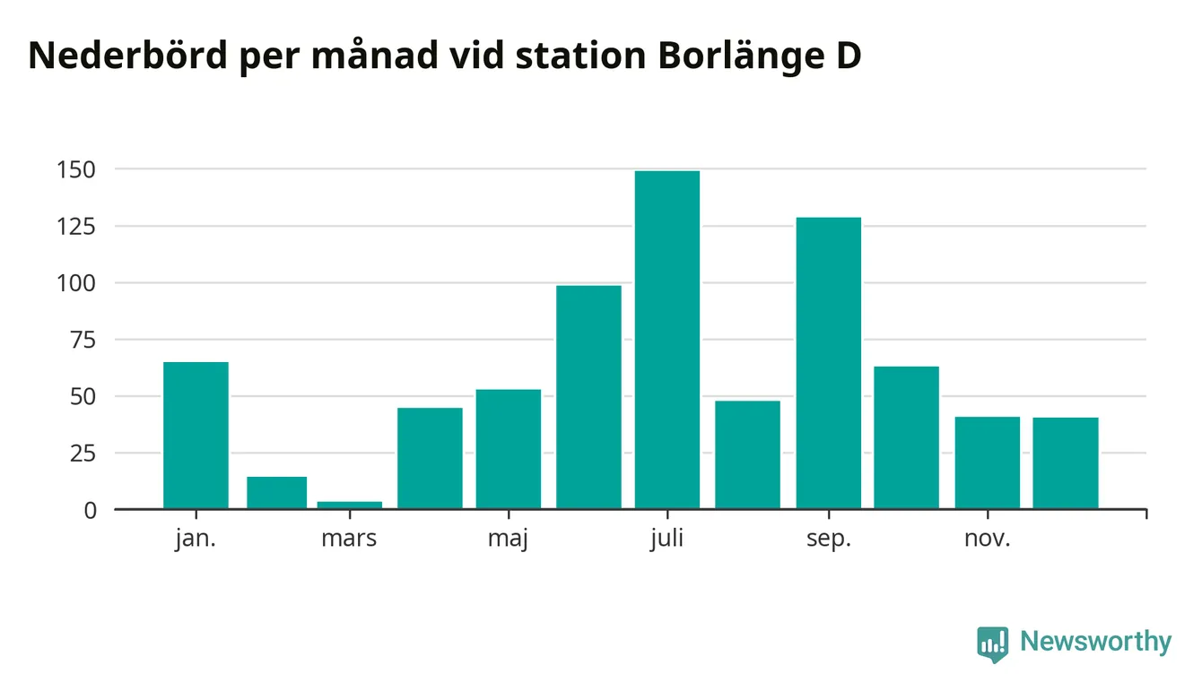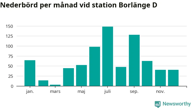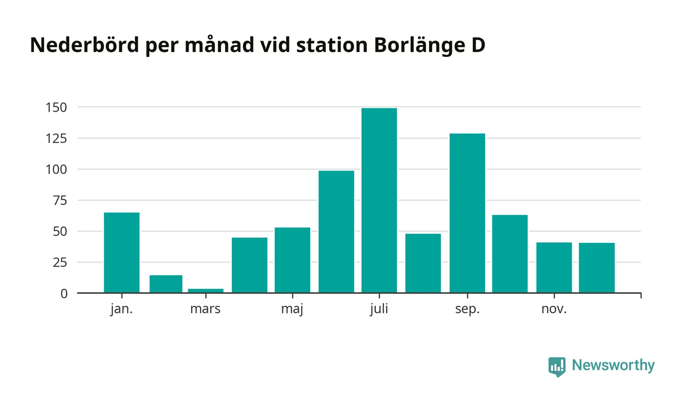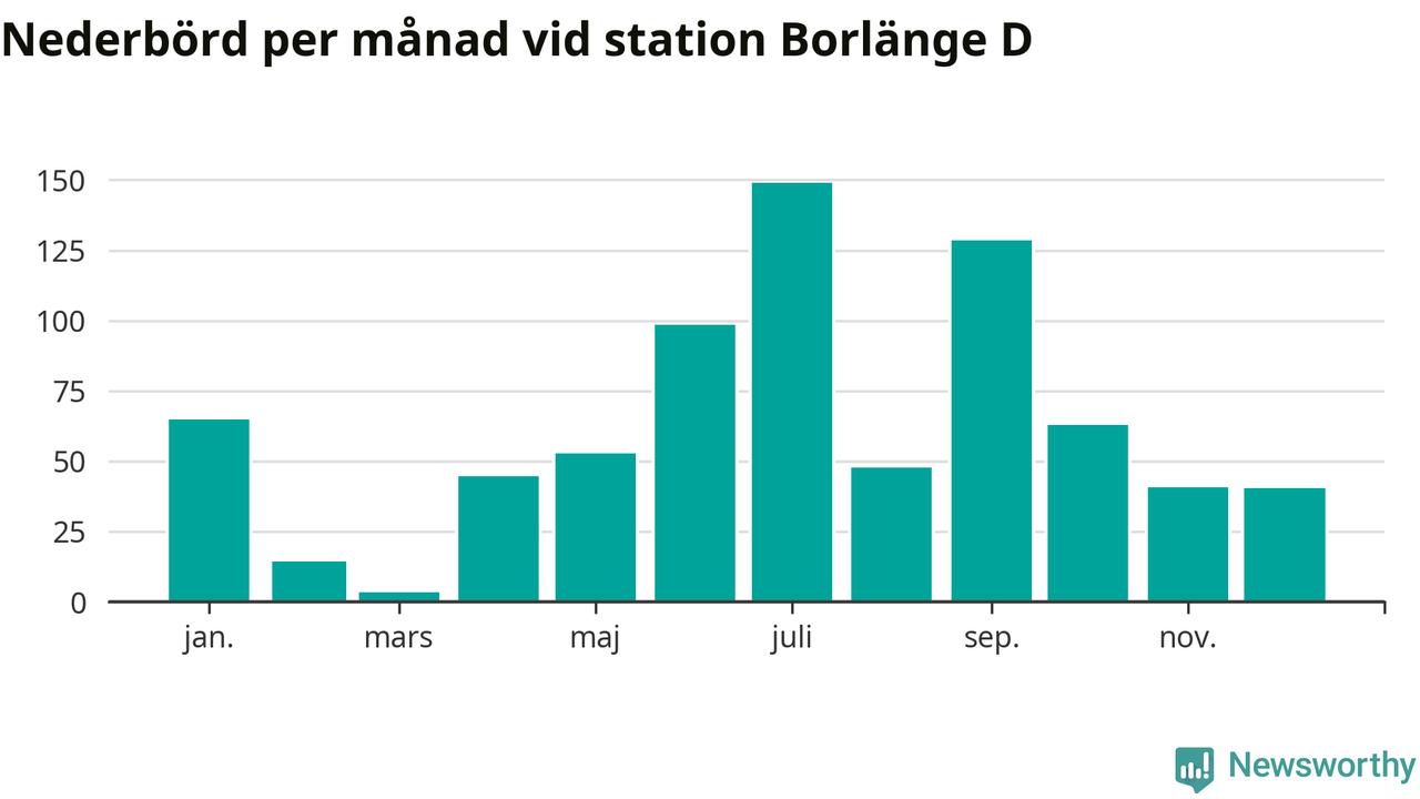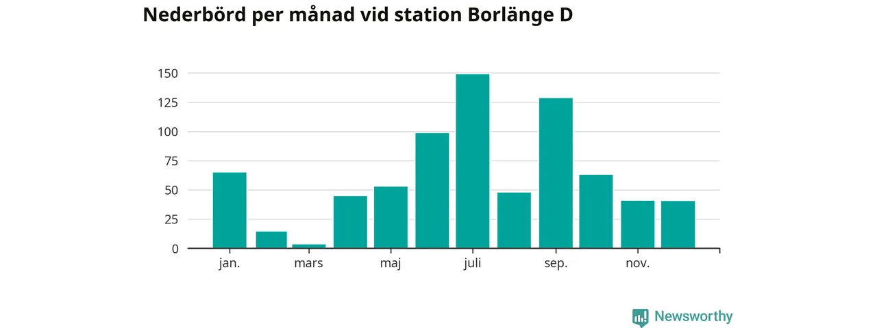 Nederbördsmässigt var 2025 ett blötare år än vanligt, åtminstone vid Borlänge D, i centrala Borlänge3. Totalt föll 748 millimeter nederbörd vid stationen, att jämföra med de senaste tre decenniernas genomsnitt på 632 millimeter. Månaden med mest nederbörd var juli, med 149 millimeter.