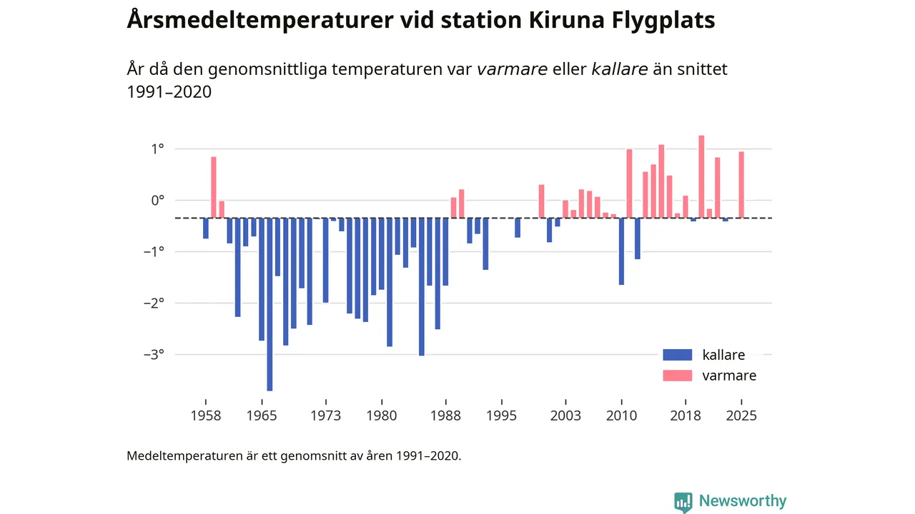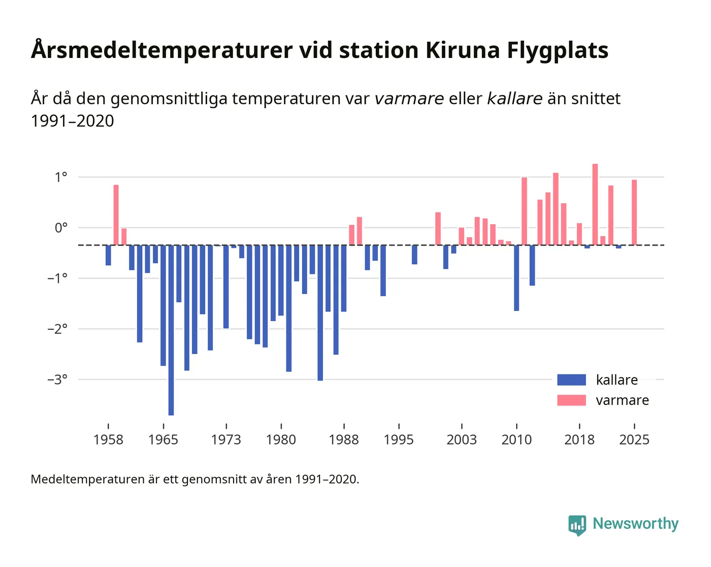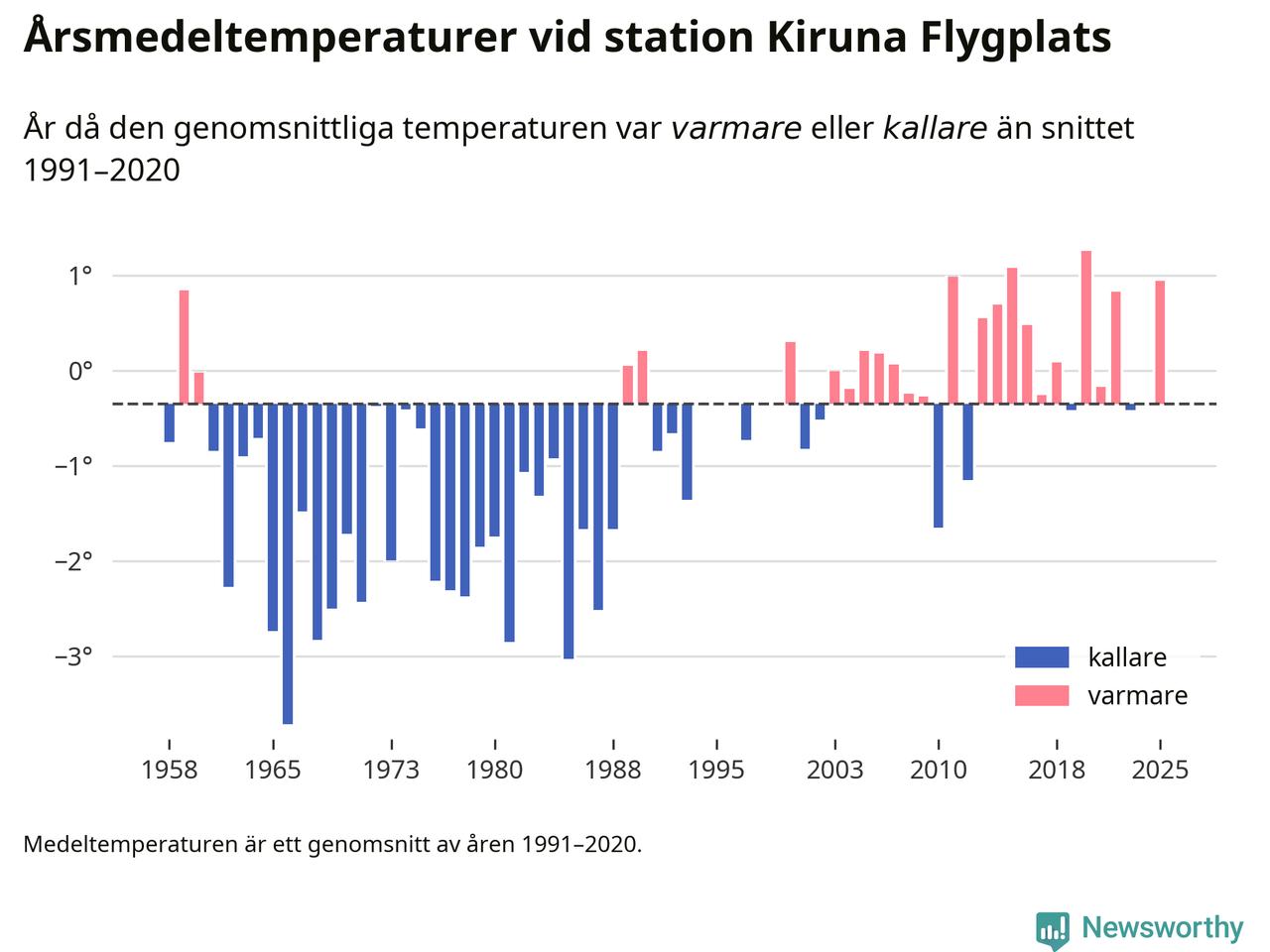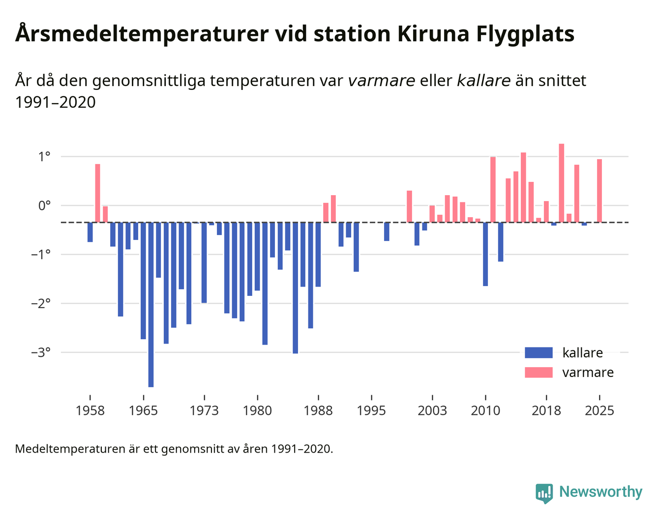 Årsmedeltemperaturen vid Kiruna Flygplats utanför centrala Kiruna1 var under 2025 0,9 grader, 1,3 grader högre än genomsnittet de senaste decennierna. Det visar Newsworthys beräkningar, som bygger på delvis preliminär observationsdata från SMHI.