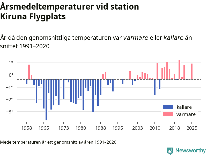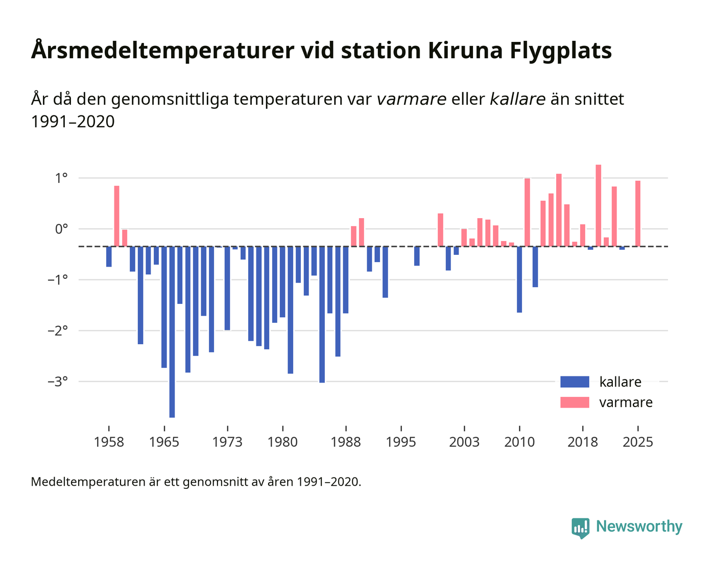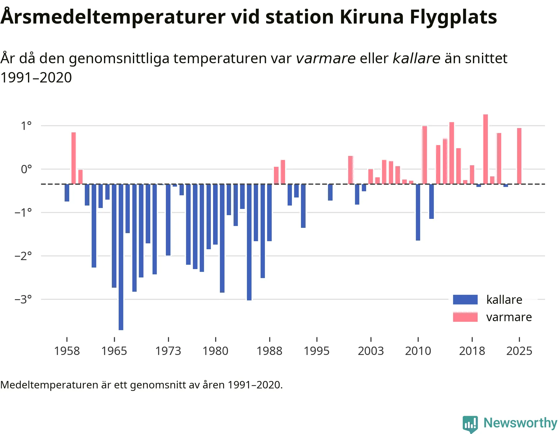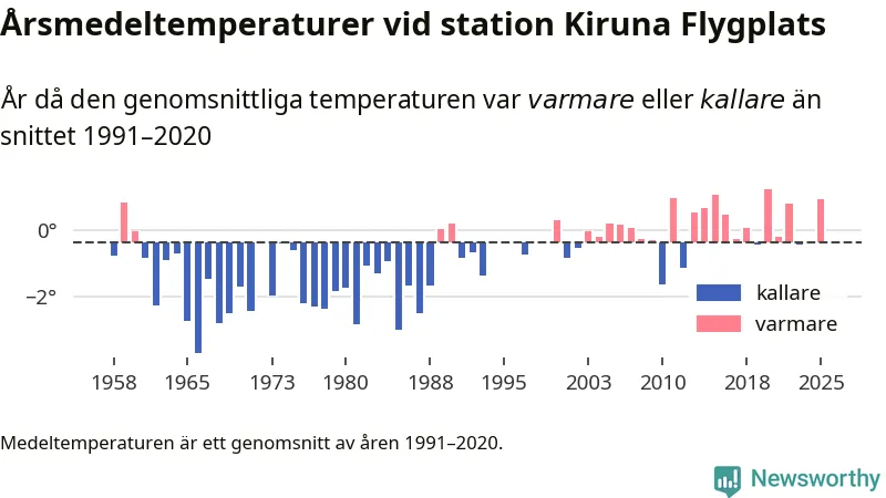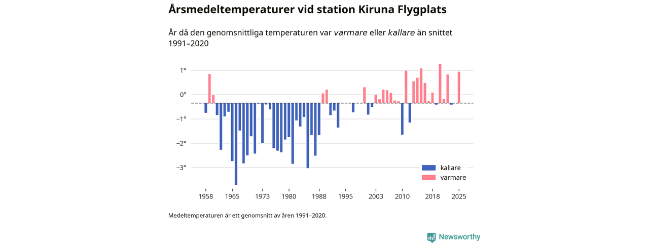 Årsmedeltemperaturen vid Kiruna Flygplats utanför centrala Kiruna1 var under 2025 0,9 grader, 1,3 grader högre än genomsnittet de senaste decennierna. Det visar Newsworthys beräkningar, som bygger på delvis preliminär observationsdata från SMHI.