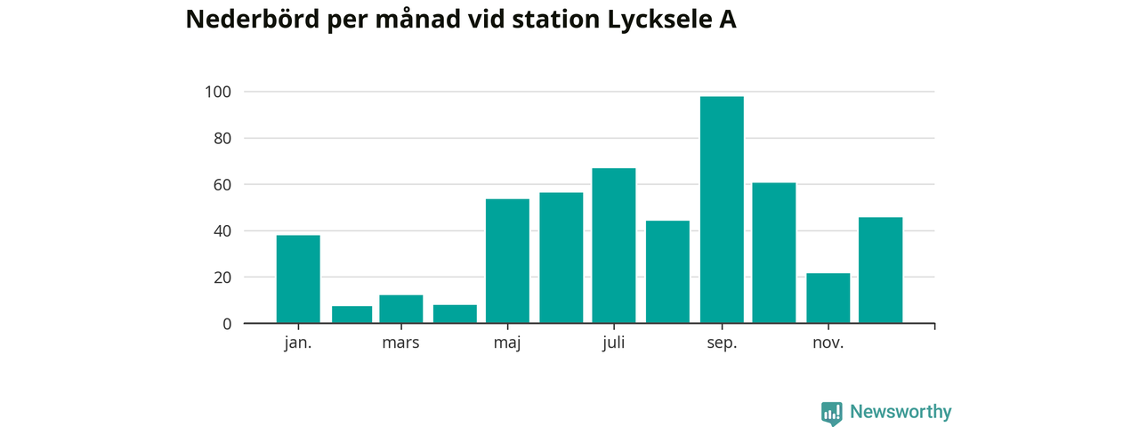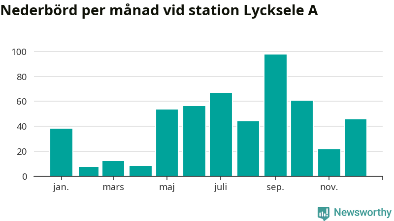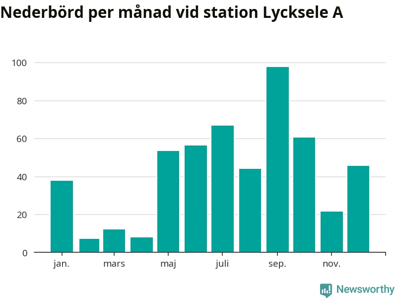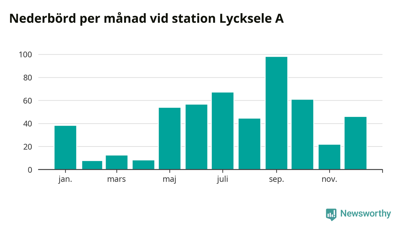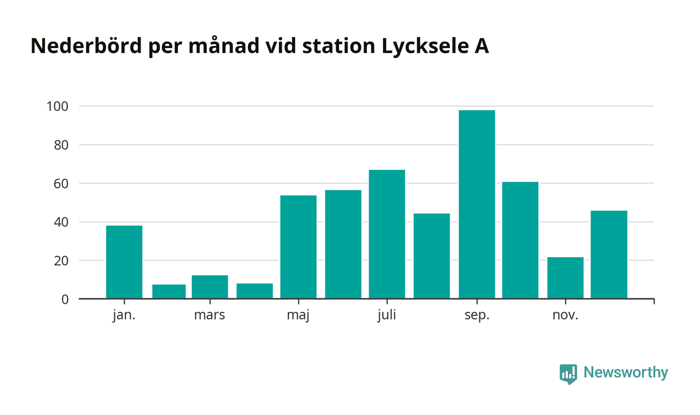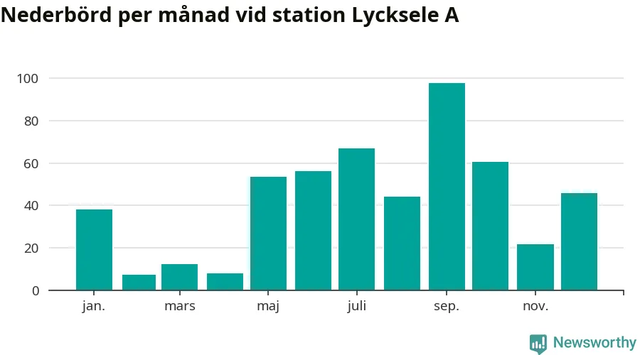 Nederbördsmässigt var 2025 ett ganska normalt år vid Lycksele A. Totalt föll 511 millimeter nederbörd vid stationen, att jämföra med de senaste tre decenniernas genomsnitt på 525 millimeter. Månaden med mest nederbörd var september, med 98 millimeter.