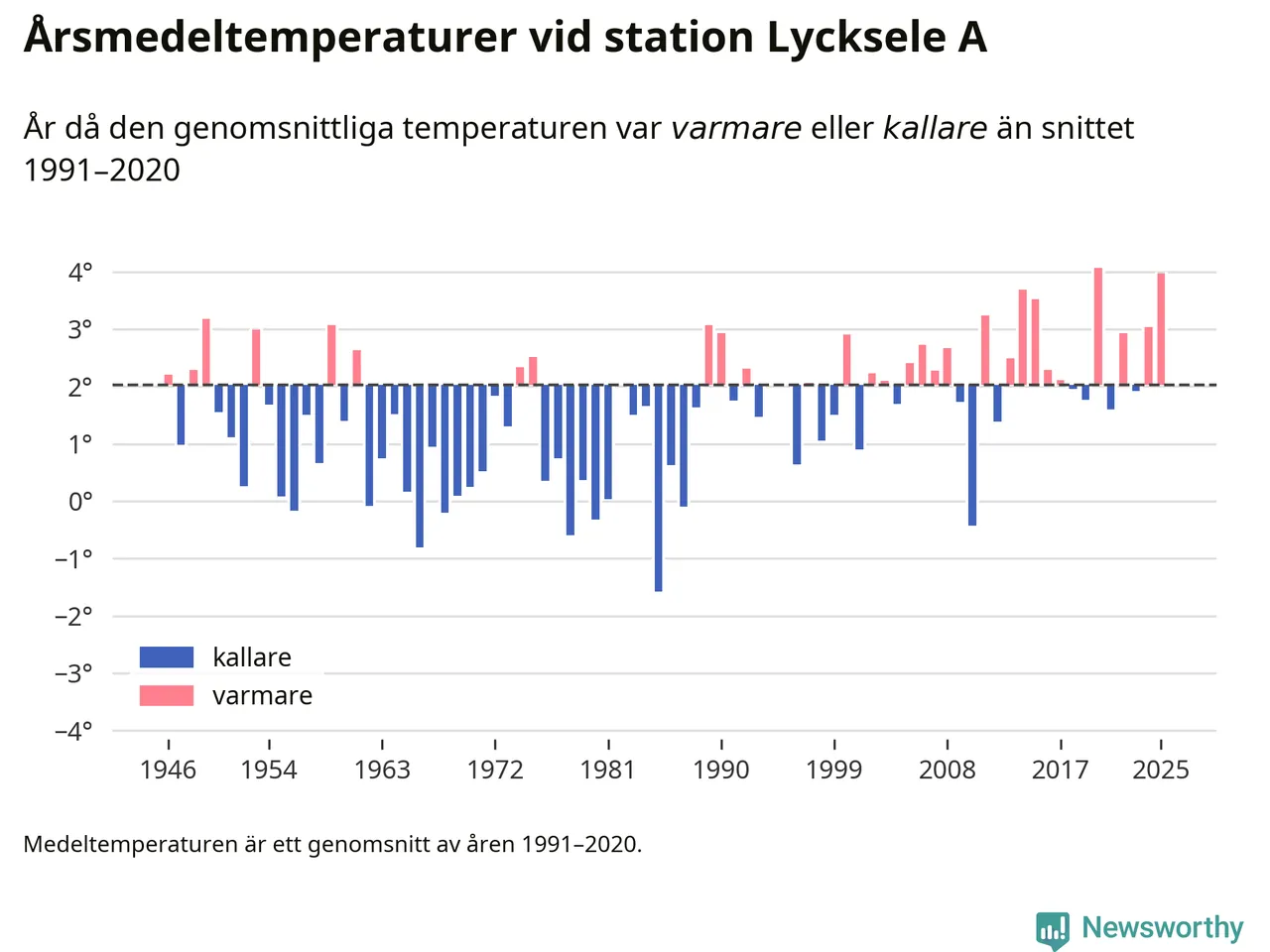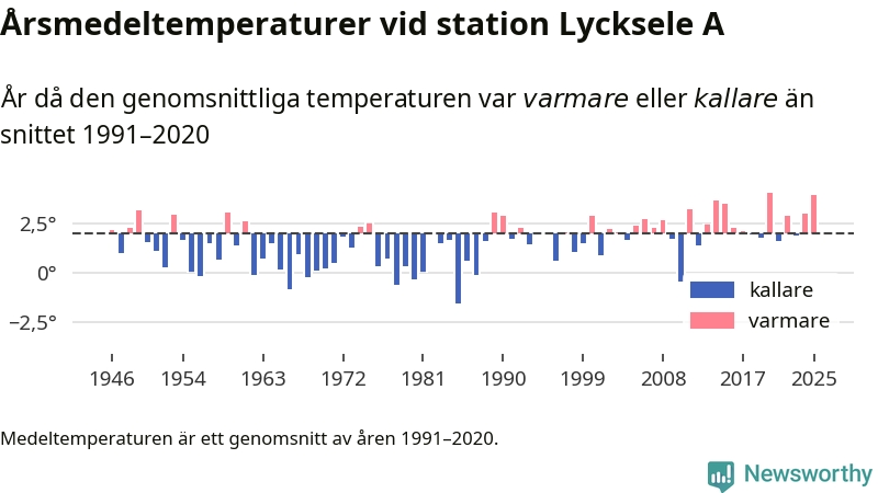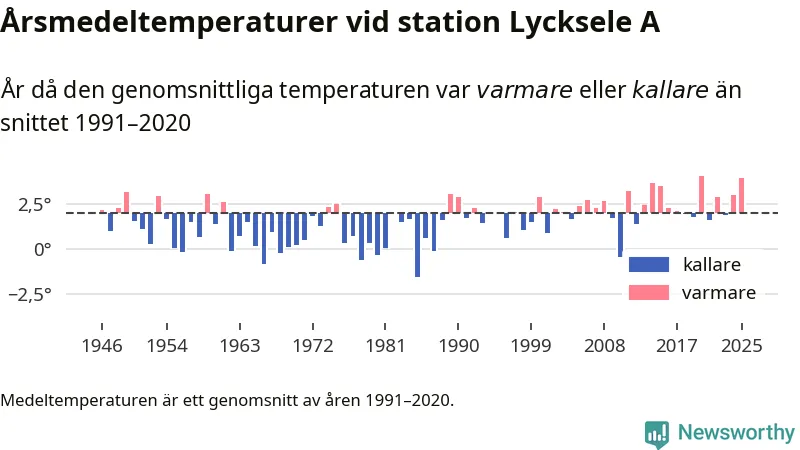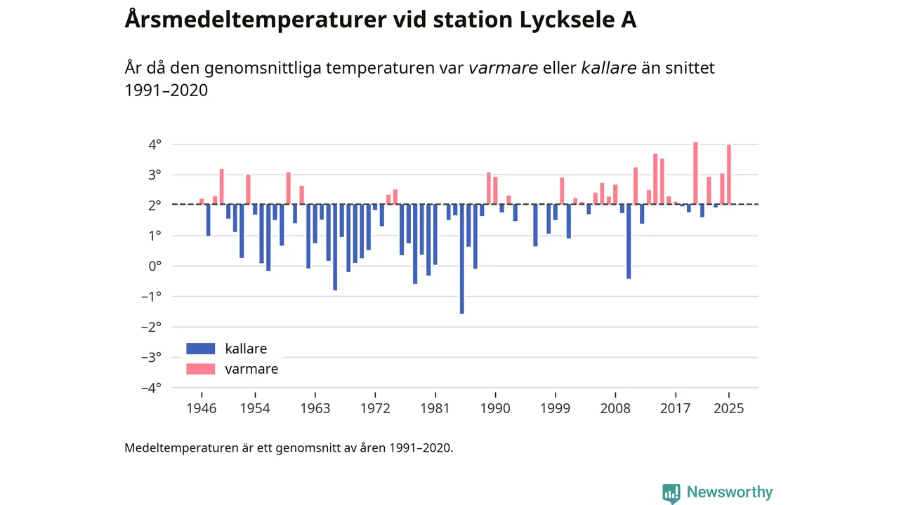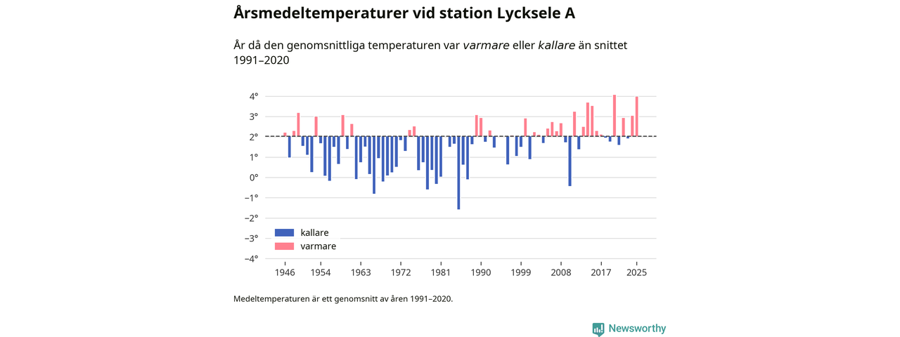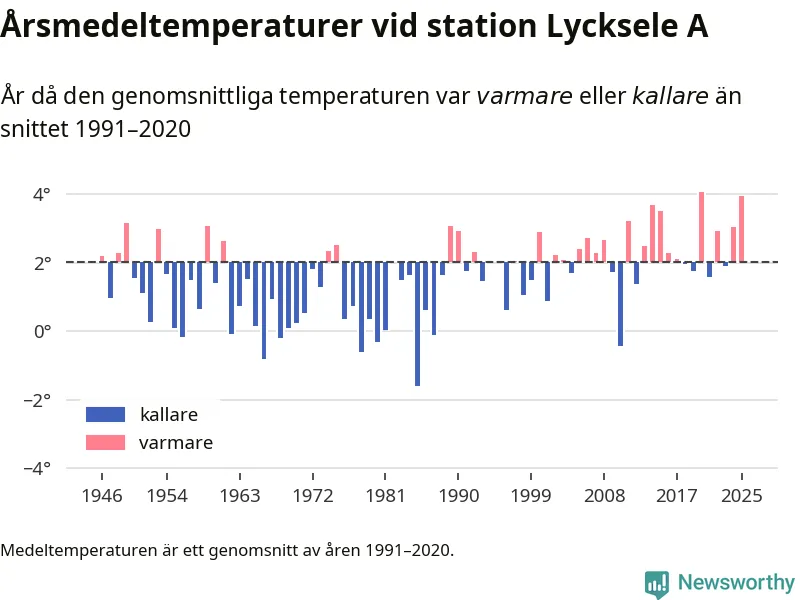 Årsmedeltemperaturen vid Lycksele A fyra kilometer sydöst om centrala Lycksele1 – den enda aktiva, SMHI-anslutna stationen som mäter medeltemperaturer i Lycksele kommun – var under 2025 4 grader, 1,9 grader högre än genomsnittet de senaste decennierna. Det är den näst högsta noteringen sedan 1946, visar Newsworthys beräkningar baserade på delvis preliminär observationsdata från SMHI.