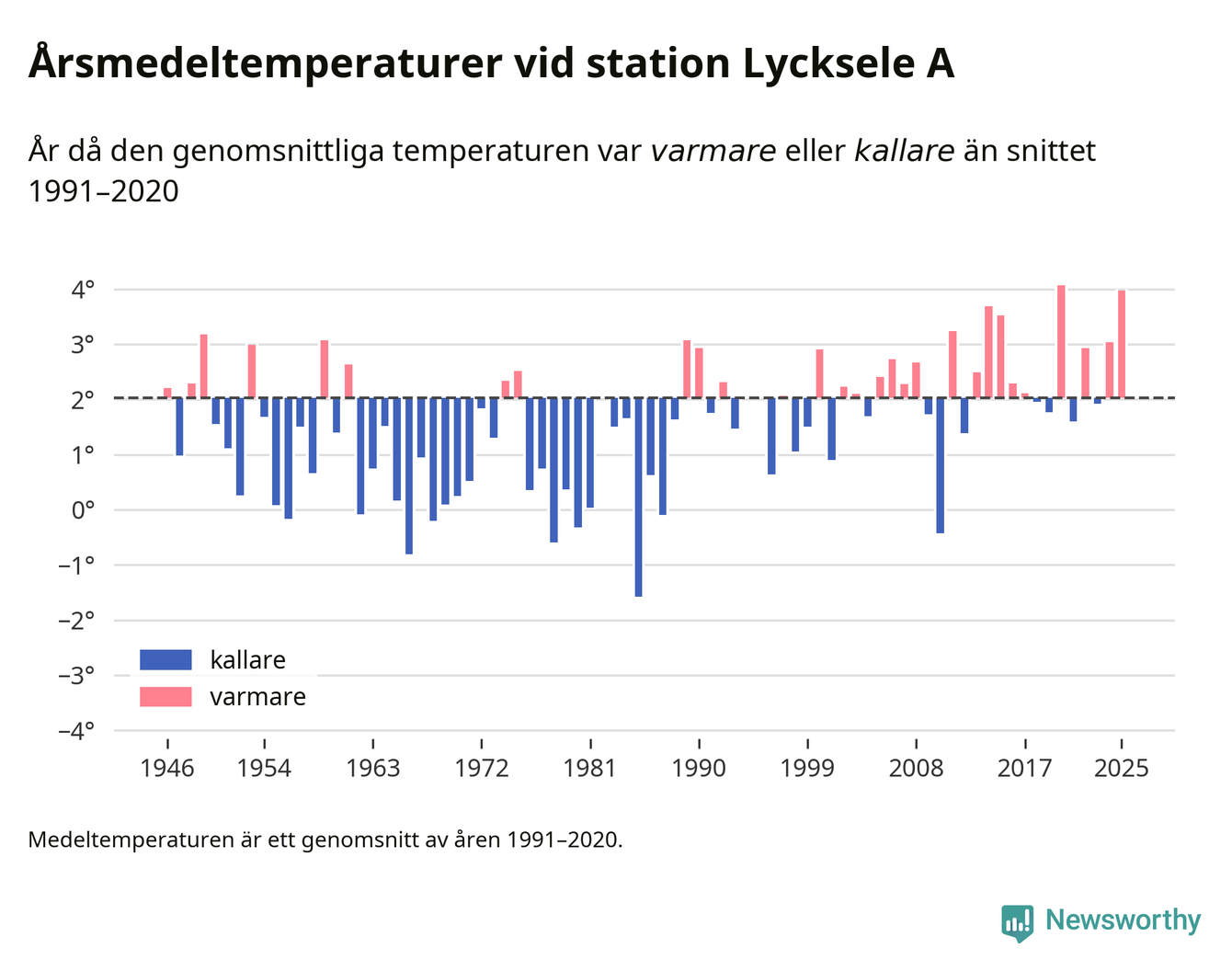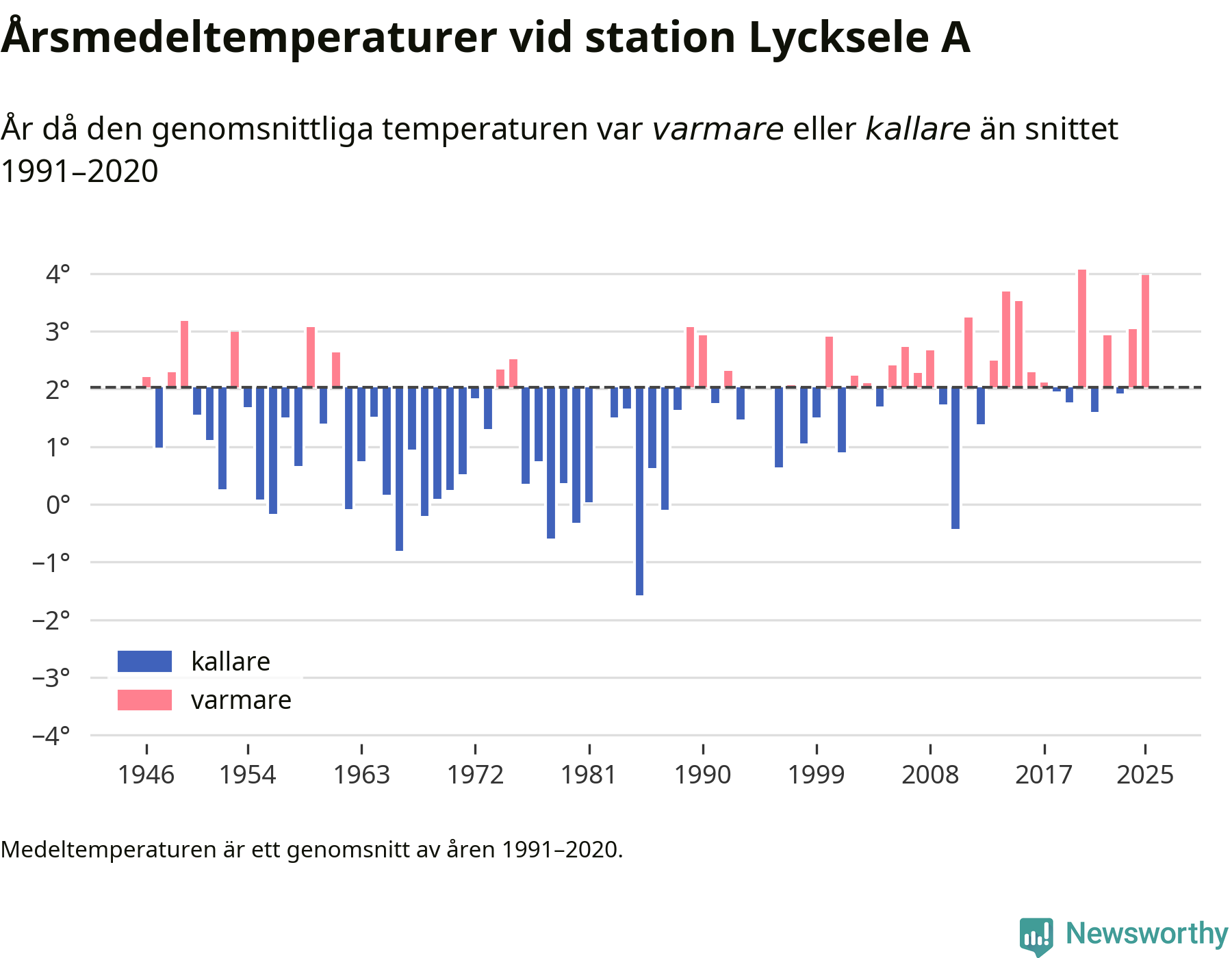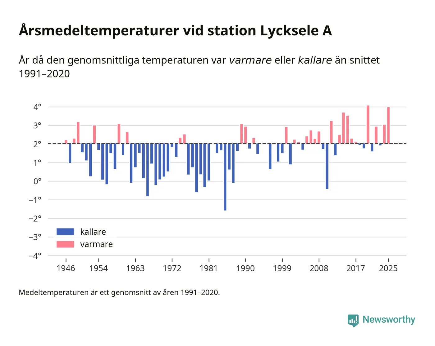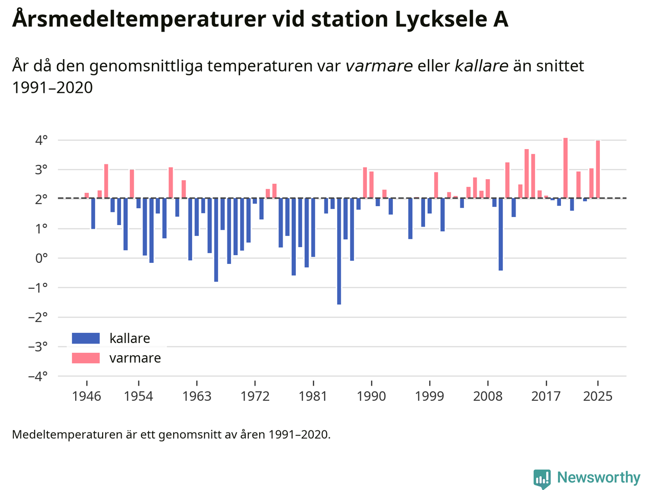 Årsmedeltemperaturen vid Lycksele A fyra kilometer sydöst om centrala Lycksele1 – den enda aktiva, SMHI-anslutna stationen som mäter medeltemperaturer i Lycksele kommun – var under 2025 4 grader, 1,9 grader högre än genomsnittet de senaste decennierna. Det är den näst högsta noteringen sedan 1946, visar Newsworthys beräkningar baserade på delvis preliminär observationsdata från SMHI.